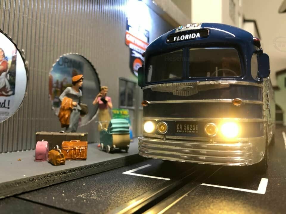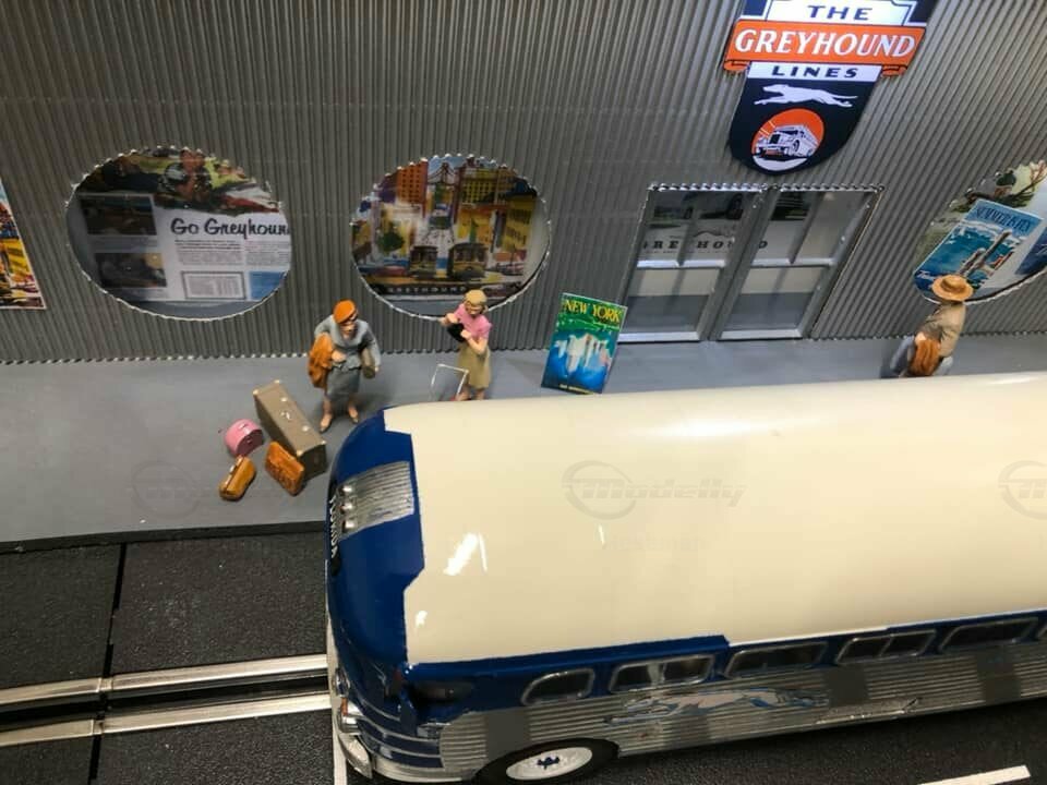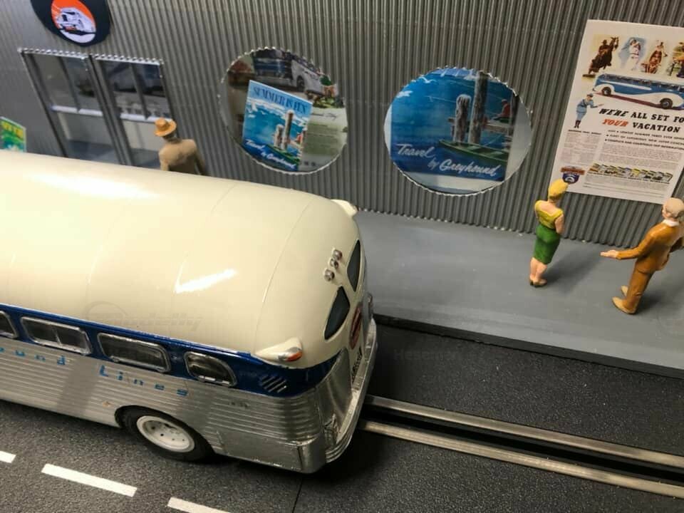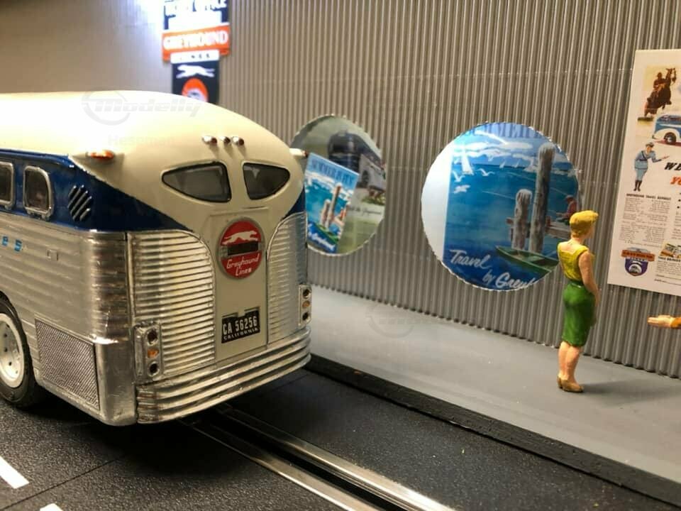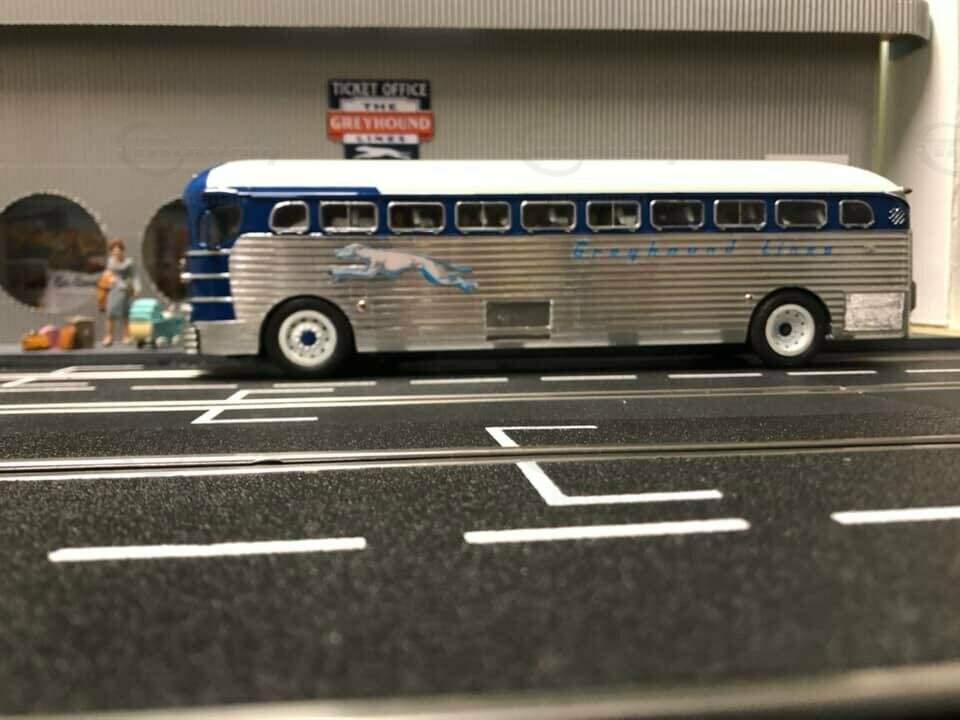The appearance of the miniature model is striking with its detailed design. The silver main color with blue accents and the well-placed Greyhound logo give the model the iconic look that matches the original buses. Additionally, the signage and windows are clearly visible in the pictures, giving the model an authentic touch. As a slot car model, it is not only a display piece but can also actively be raced on slot car tracks, adding extra play value to the model.