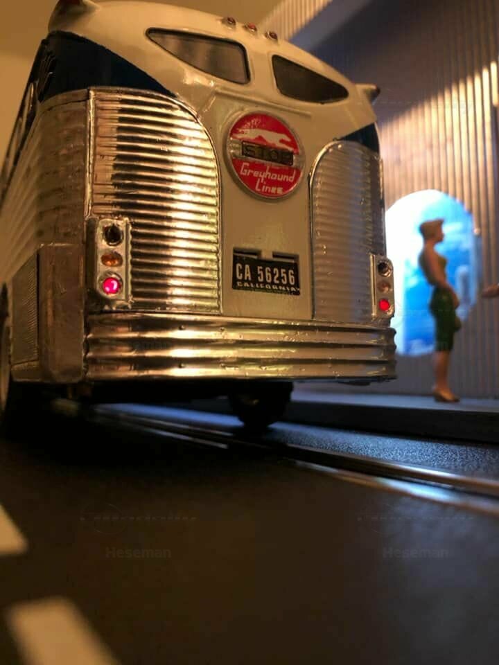 The original model on which the miniature vehicle is based is the GMC PD3751 "Greyhound Bus". This bus from the second generation was built between 1947 and 1954 and is an iconic vehicle that was commonly used for long-distance travel in the USA. The GMC PD3751 could accommodate up to 41 passengers and was known for its distinctive "Silverside" body, which was considered a technological innovation at the time. The vehicle was equipped with a powerful diesel engine that allowed a top speed of approximately 100 km/h (62 mph), which was impressive for that era.