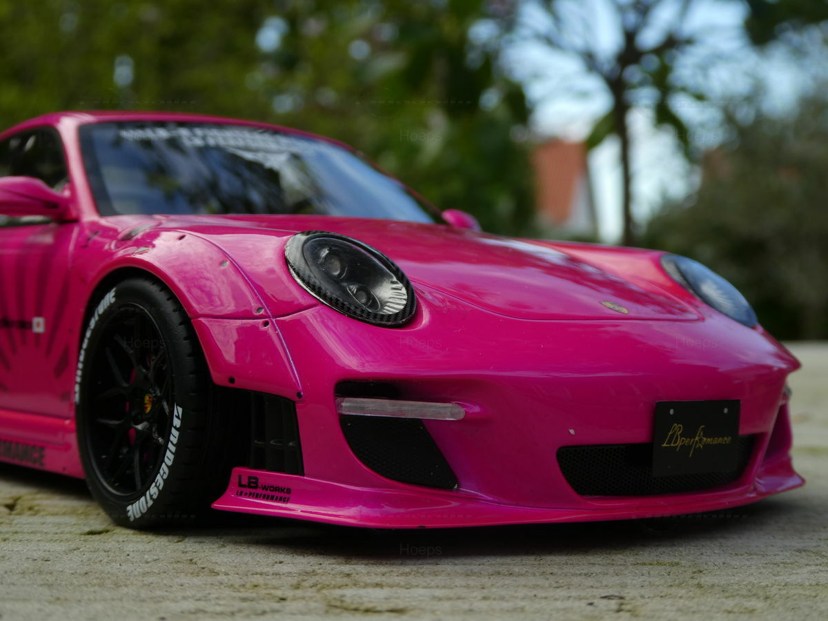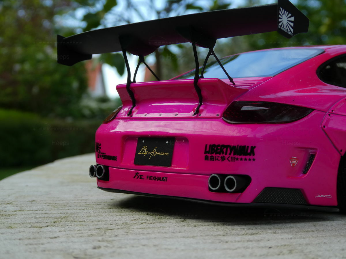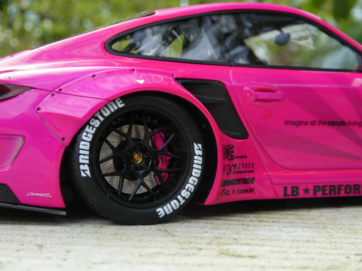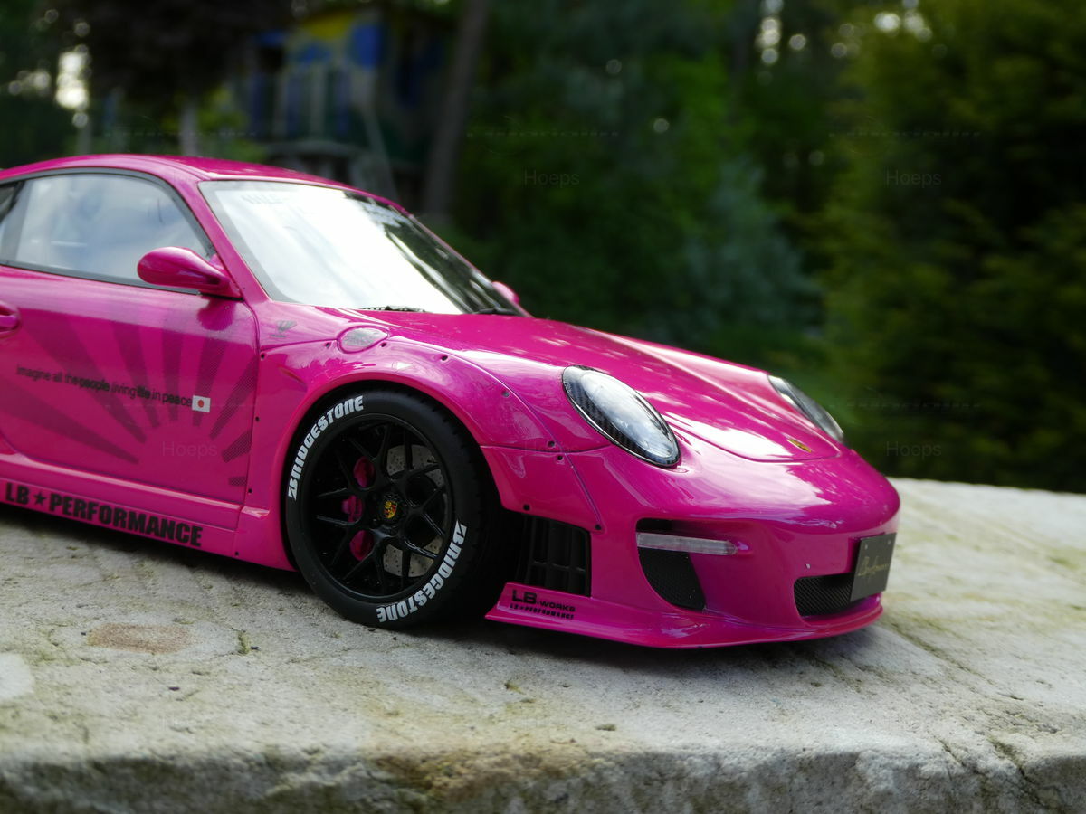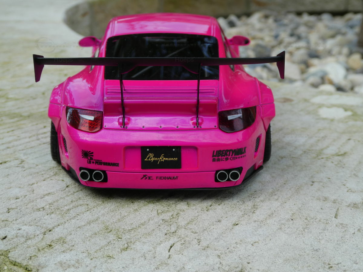 The model car shown is a detailed replica in a 1/18 scale, manufactured by Auto Barn (AB Models). Crafted from high-quality resin, it stands out for its accuracy and attention to detail, making it a sought-after collector's item. The striking pink paint of the model is particularly noteworthy and corresponds to the specific color scheme of a Liberty Walk modified Porsche 911. The vibrant color and applied decals and logos are accurately reproduced. The model stands out with its wide wheel arches, large rear spoiler, and deeply sculpted side skirts reflecting the sporty and aggressive appearance of the original.