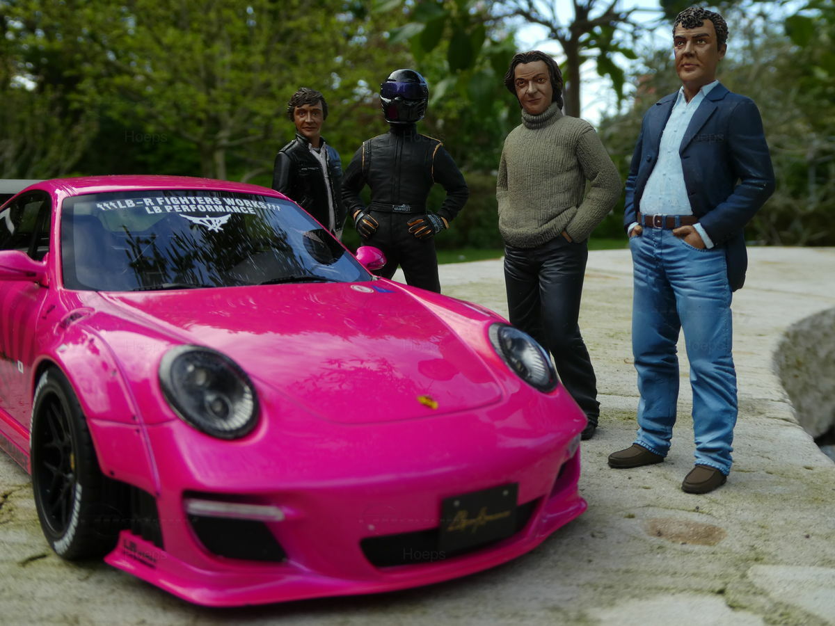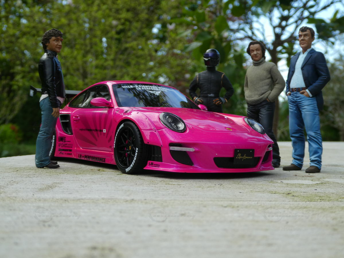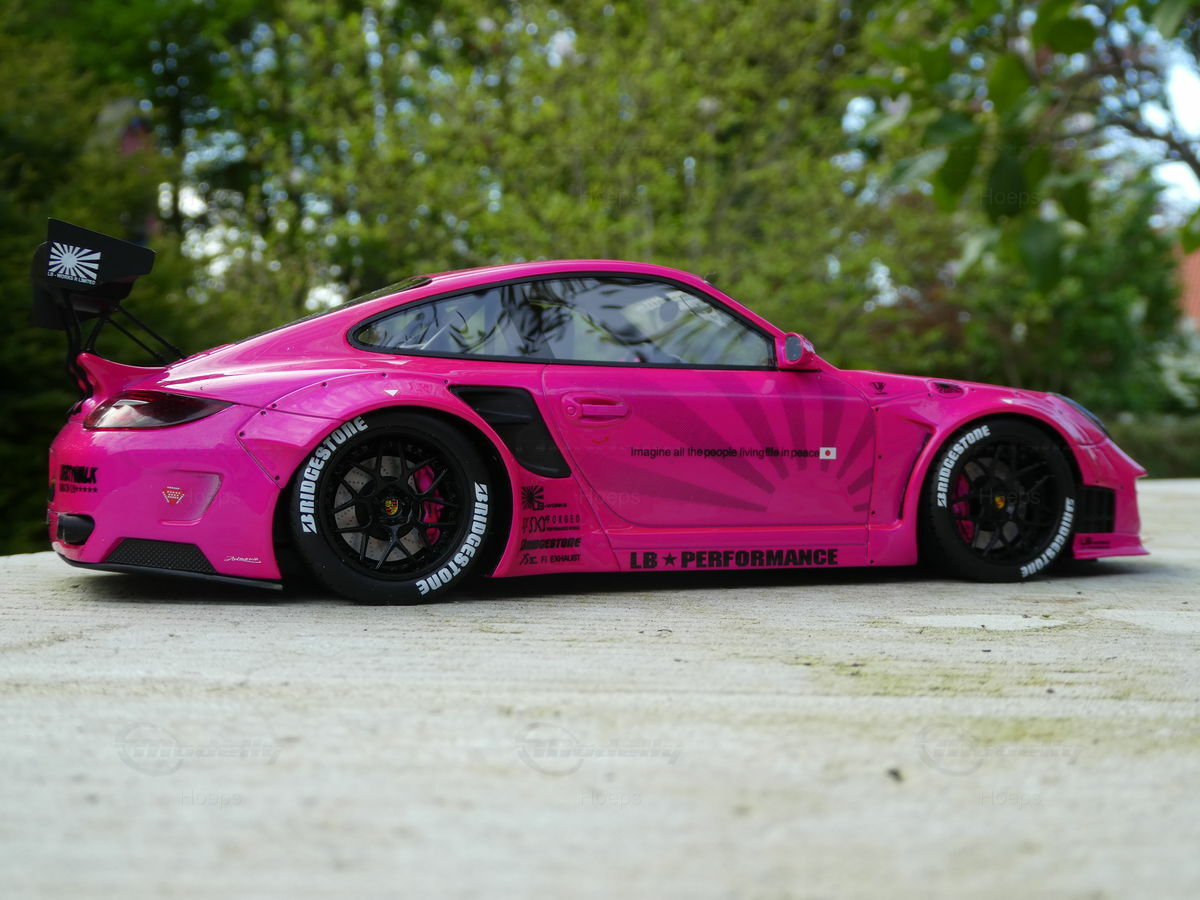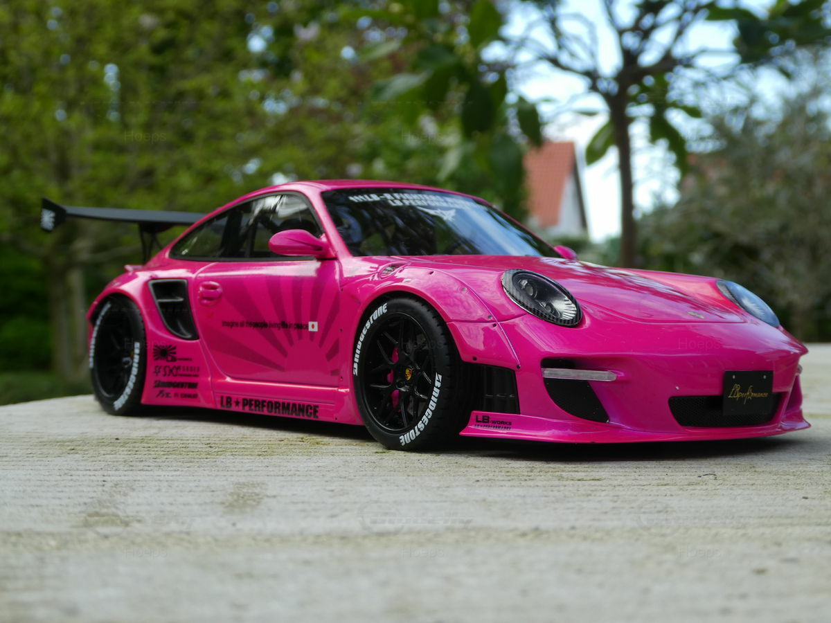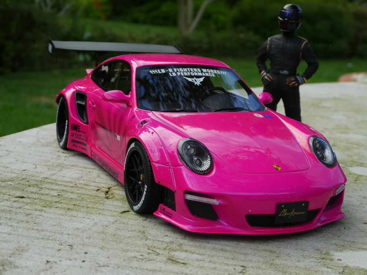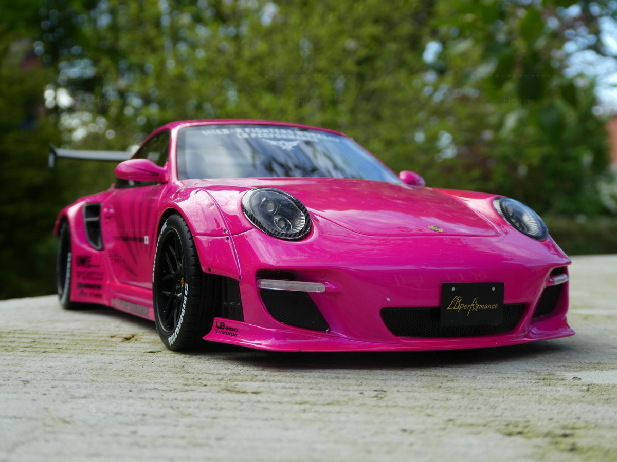 The model car shown is a detailed replica in a 1/18 scale, manufactured by Auto Barn (AB Models). Crafted from high-quality resin, it stands out for its accuracy and attention to detail, making it a sought-after collector's item. The striking pink paint of the model is particularly noteworthy and corresponds to the specific color scheme of a Liberty Walk modified Porsche 911. The vibrant color and applied decals and logos are accurately reproduced. The model stands out with its wide wheel arches, large rear spoiler, and deeply sculpted side skirts reflecting the sporty and aggressive appearance of the original.