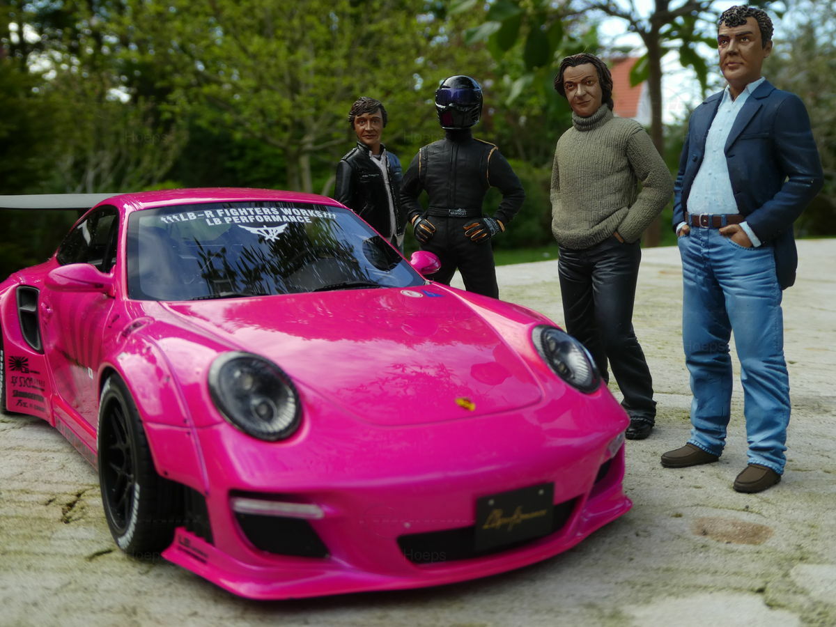 The original model discussed is a Porsche 911, an iconic sports car known for its performance, elegant design, and comprehensive technical features. The depicted model is based on a version modified by Liberty Walk, a Japanese tuning company specializing in wide-body kits for premium vehicles. Liberty Walk was founded in Nagoya, Japan, in 2008. The specific generation of the featured Porsche 911 is the 997, produced from 2004 to 2012. Even in this generation, Porsche continued using the six-cylinder boxer engine, which delivers power to the rear wheels. Grant Larson, the chief designer, played a significant role in the design of the 997, and Porsche's engineering teams managed to elevate the vehicle's aerodynamics and performance to a new level.