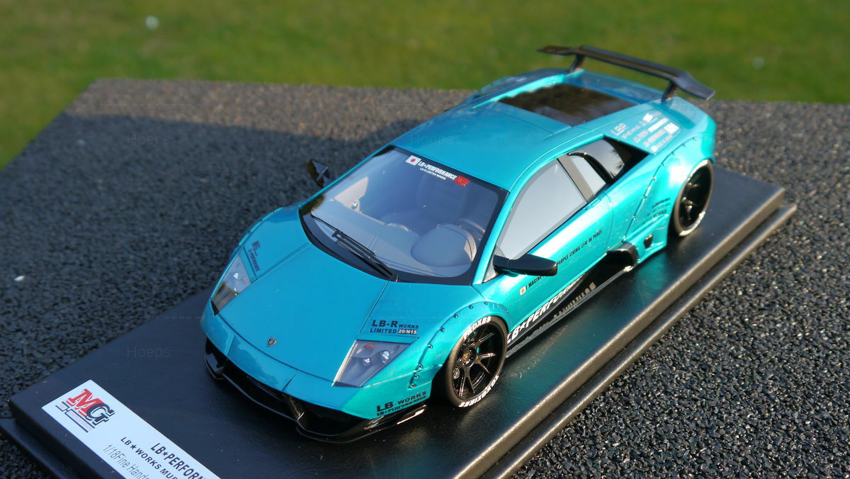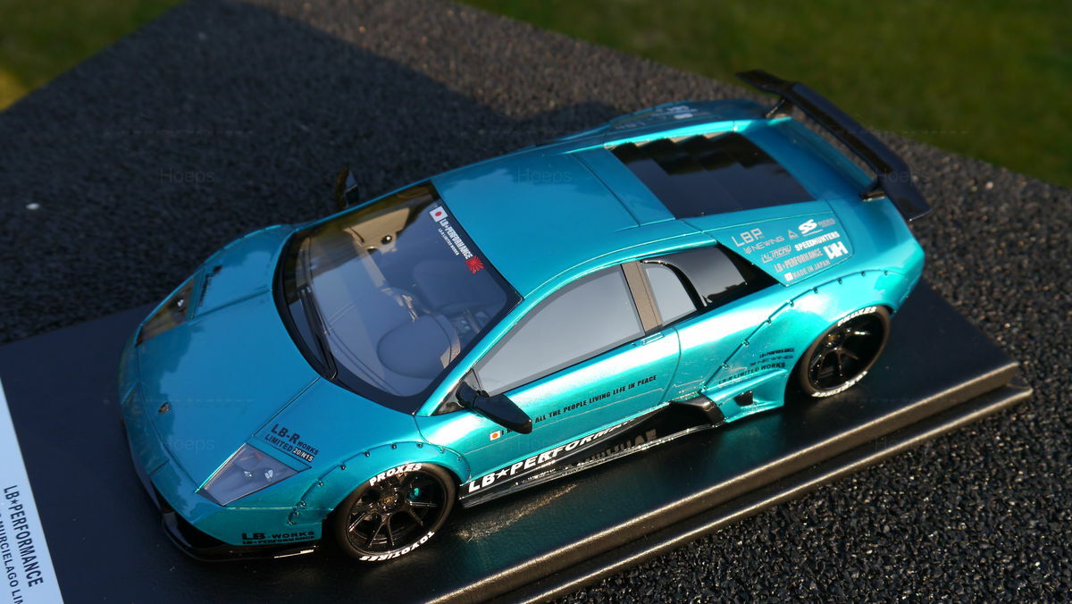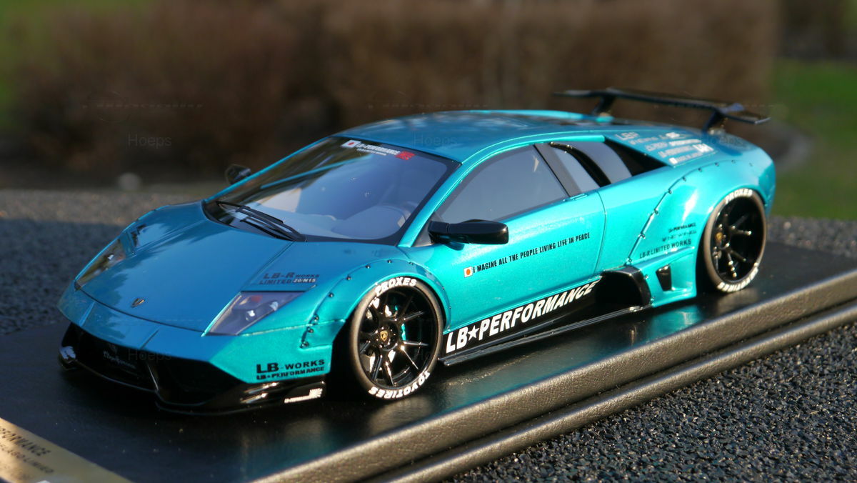 The 1/18 scale model of the Lamborghini Murciélago LB Performance, produced by MG Model Plus, is a highly detailed miniature car. This model is crafted from high-quality resin, giving it both high detail accuracy and durability. The striking turquoise blue paint, adorned with various Liberty Walk and tuning part logos, makes this model stand out. The specific decals and color choice are accurate replicas of the real tuned version of the car. Additionally, the model features KS RIMS wheels, with their unique design adding to the authentic look of the model.