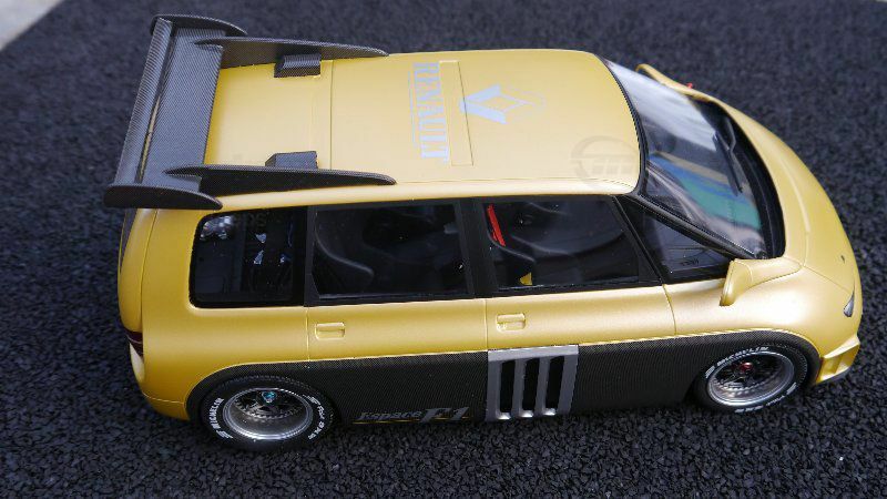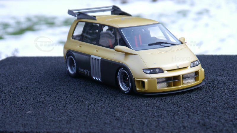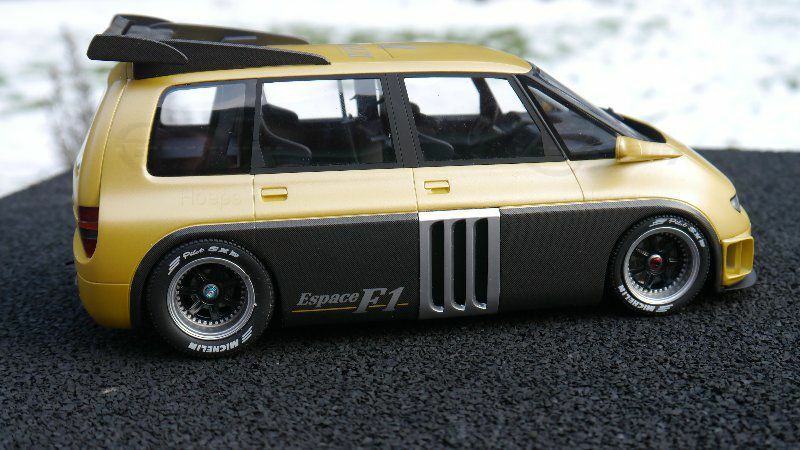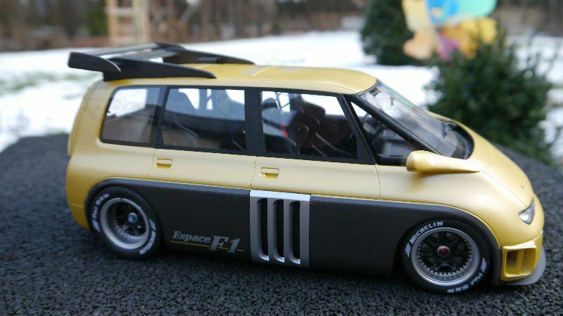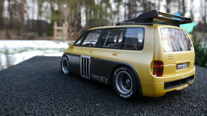 The 1/18 scale model car shown was manufactured by Otto Models and is part of the collection owned by Modelly member "Hoeps". This model stands out for its high level of detail and top-notch craftsmanship, making it a highlight in any model car collection. The Renault Espace F1 has been meticulously recreated, with special attention to its distinctive design elements. The large air intakes on the sides and the big rear wing give the model a sporty appearance. The depicted model features a two-tone paint scheme with a matte black underside and shiny gold on the top. The wheels are replicas of the Gotti wheels specially designed for this vehicle model, fitted with Michelin tires.