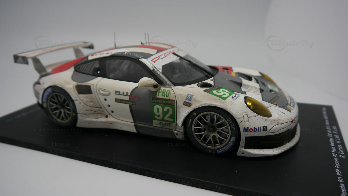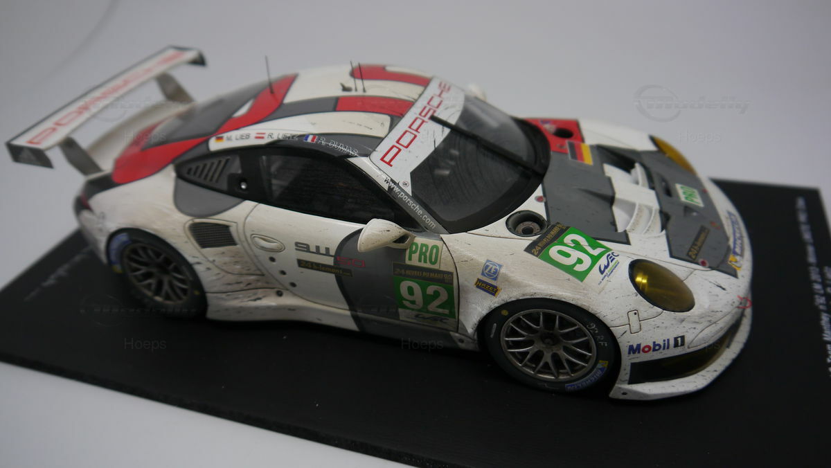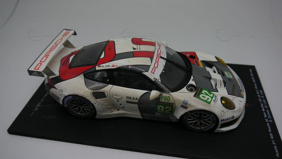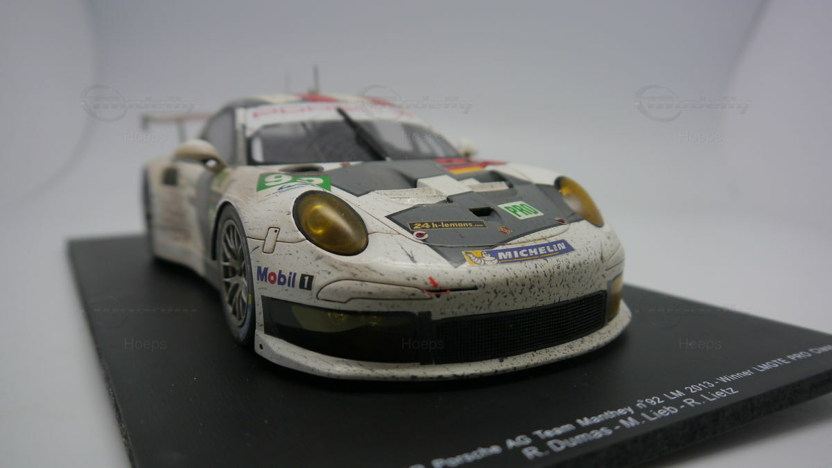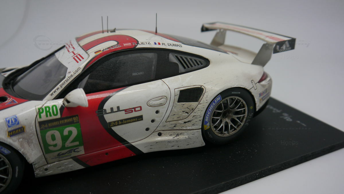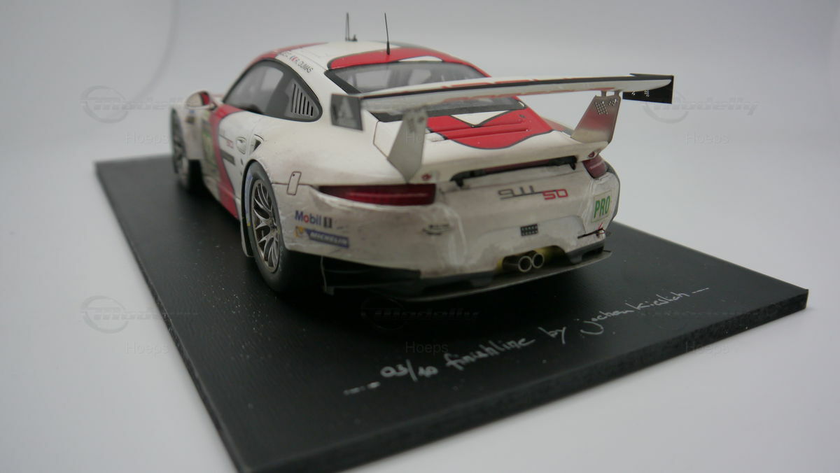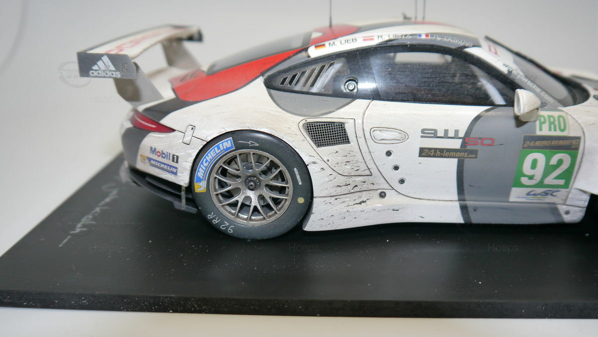 The paint job of the model car is an exact replica of the original, designed in the colors of white, gray, and red. The accurately reproduced sponsor logos, including Mobil 1 and Michelin, enhance the authenticity of the miniature. The applied "race patina" and the detailed portrayal of dirt and wear marks, typical of endurance races, contribute to the realistic look. The wheels and tires are also faithfully replicated, and the brake systems are correctly designed and functional to match the racing car.