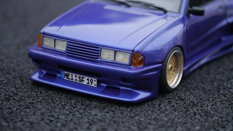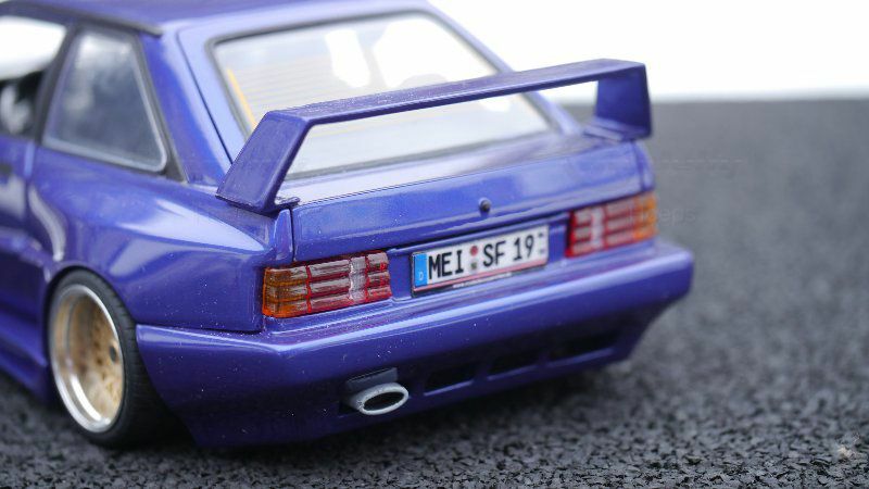 The model car features various modifications that set it apart from standard production. Particularly striking are the golden wheels from BBS, adding both a stylish and distinctive look to the model. Additionally, a large rear spoiler is attached, emphasizing the sporty profile of the vehicle. The modified taillights and exhaust also give the miniature vehicle a special touch. The license plate "ME-HF 19" could be a personalized detail adding an individual touch to the model.
