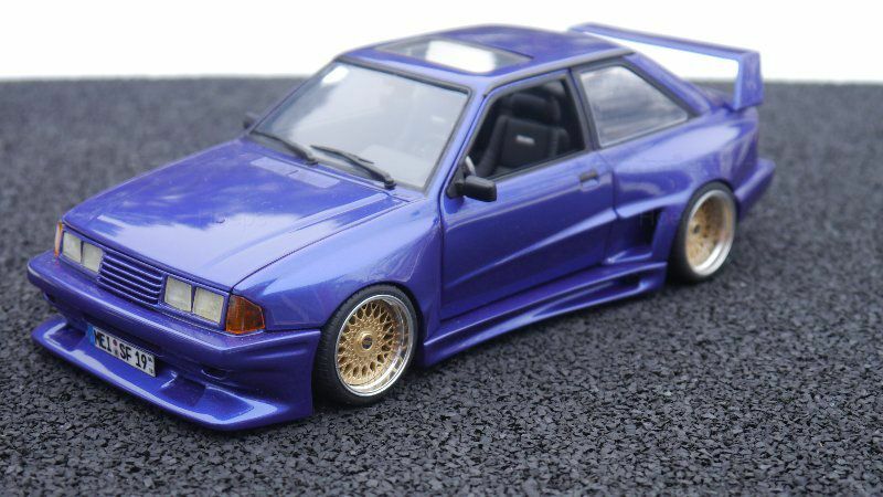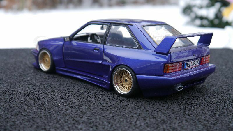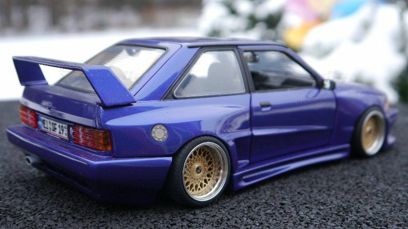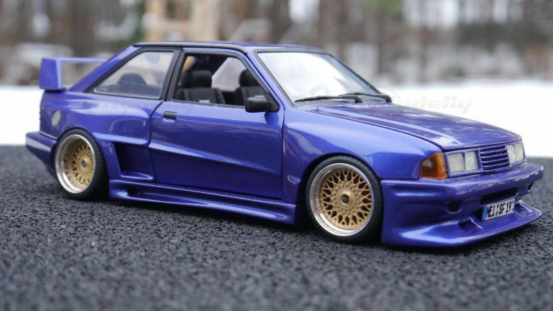 The model car shown here, accurately scaled at 1/18 by Sun Star, represents the Ford Escort MK3 XR3 Saloon with remarkable detail. However, this is a modified version of the miniature vehicle and not the original product from Sun Star. In the photos provided by Modelly member "Hoeps," several distinct modifications are evident. The most noticeable modification is the impressive deep glossy blue paint job. The bold lines and distinctive shapes of the model reflect the sporty heritage of the original.