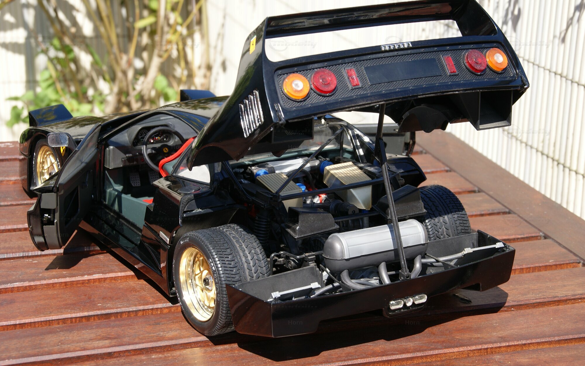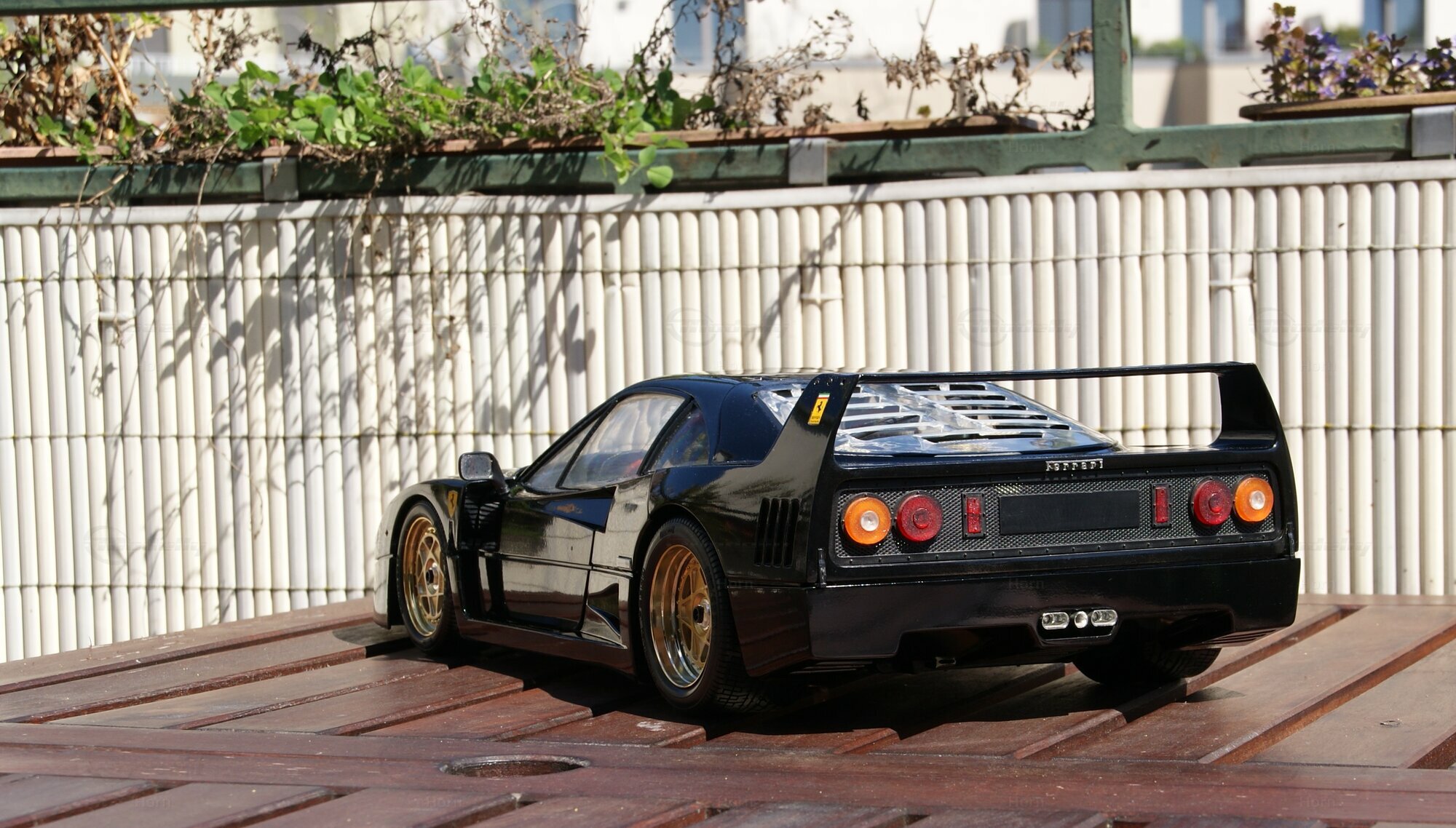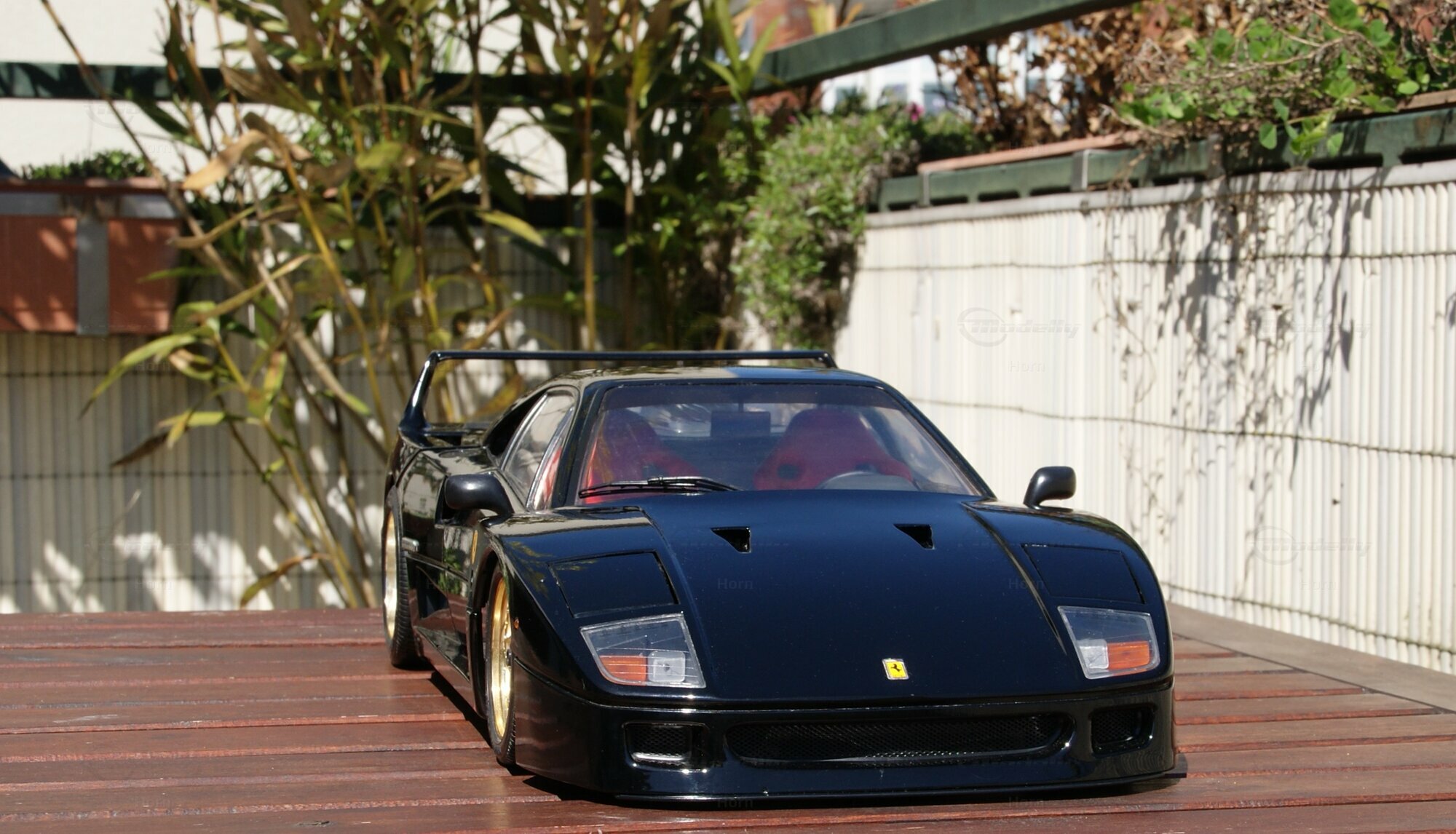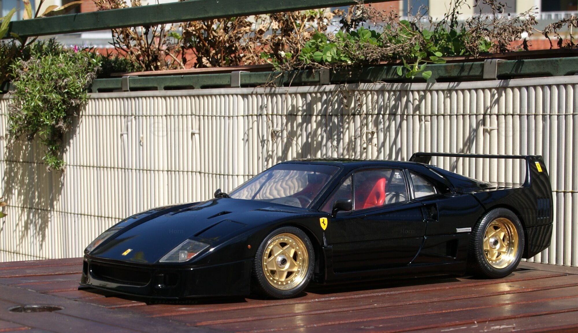 The miniature in a 1/8 scale of the Ferrari F40 produced by Pocher is a precise replica of the legendary supercar. Made with diecast material, it offers high levels of detail and durability. This miniature is an impressive collector's item showcased in the collection of Modelly member "Horn." Notable in this exact miniature are the golden racing wheels that define the aggressive yet elegant appearance of the black vehicle. Such attention to detail is characteristic of Pocher models known for their authenticity and excellent craftsmanship. The interior is equally intricately designed, featuring red sports seats and a faithfully replicated cockpit that accounts for even the smallest controls.