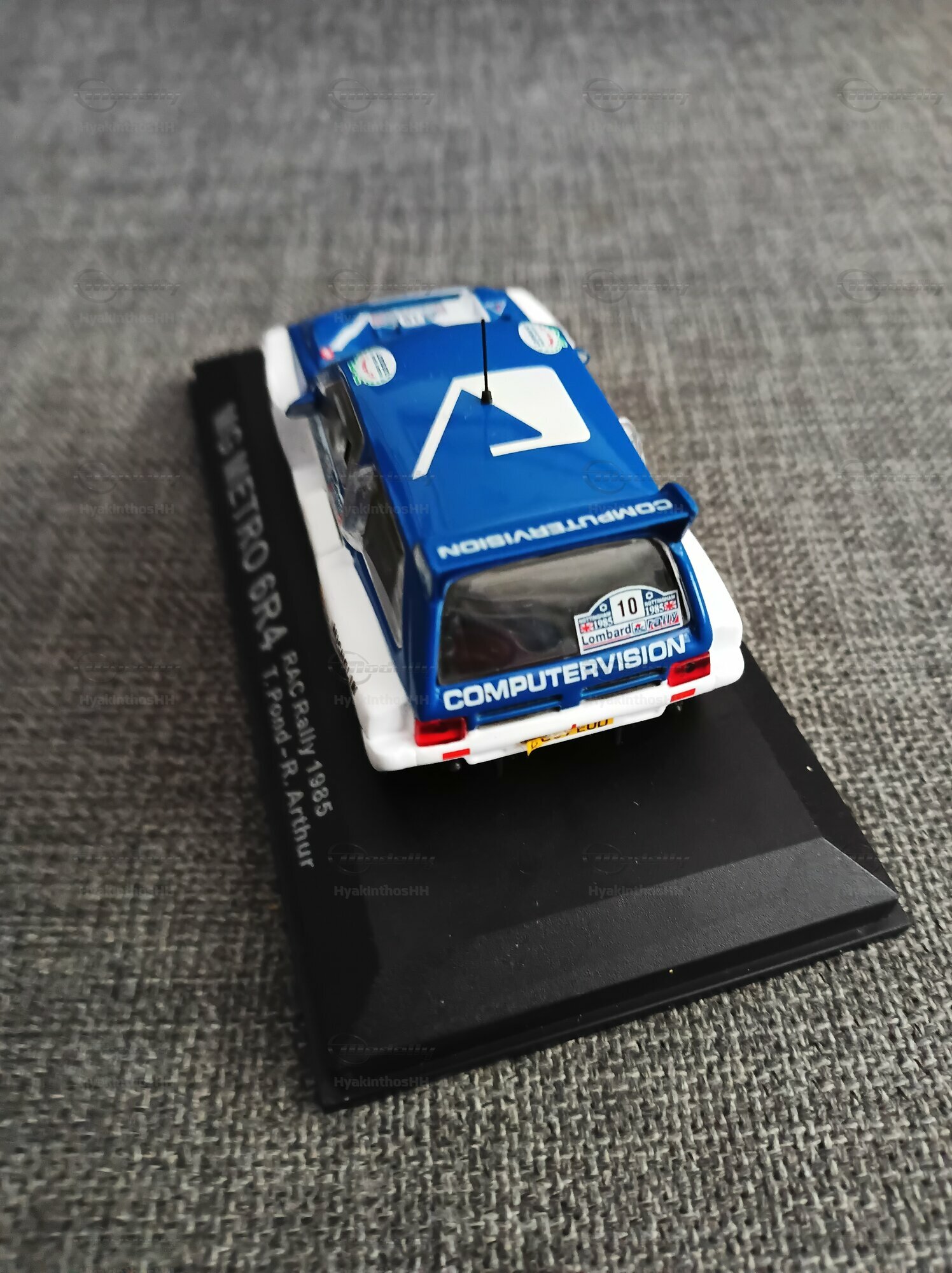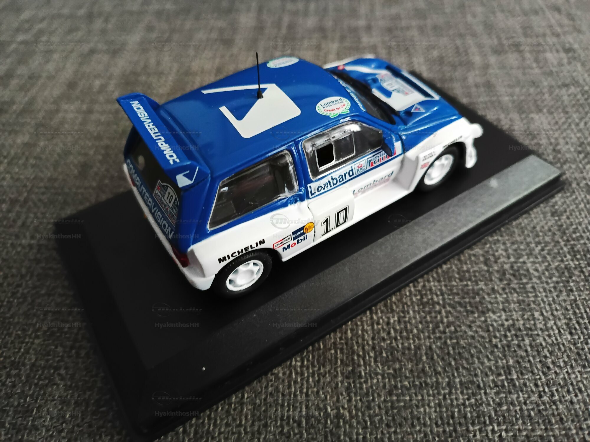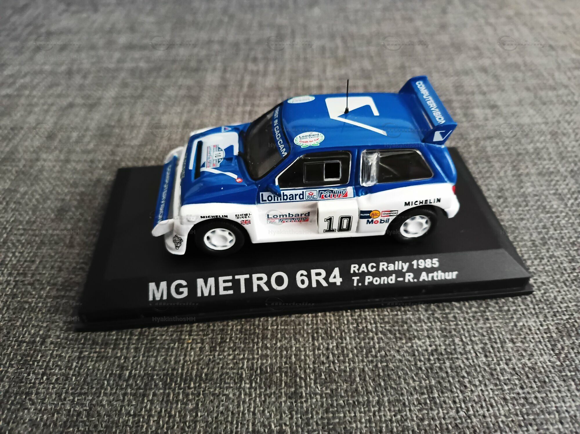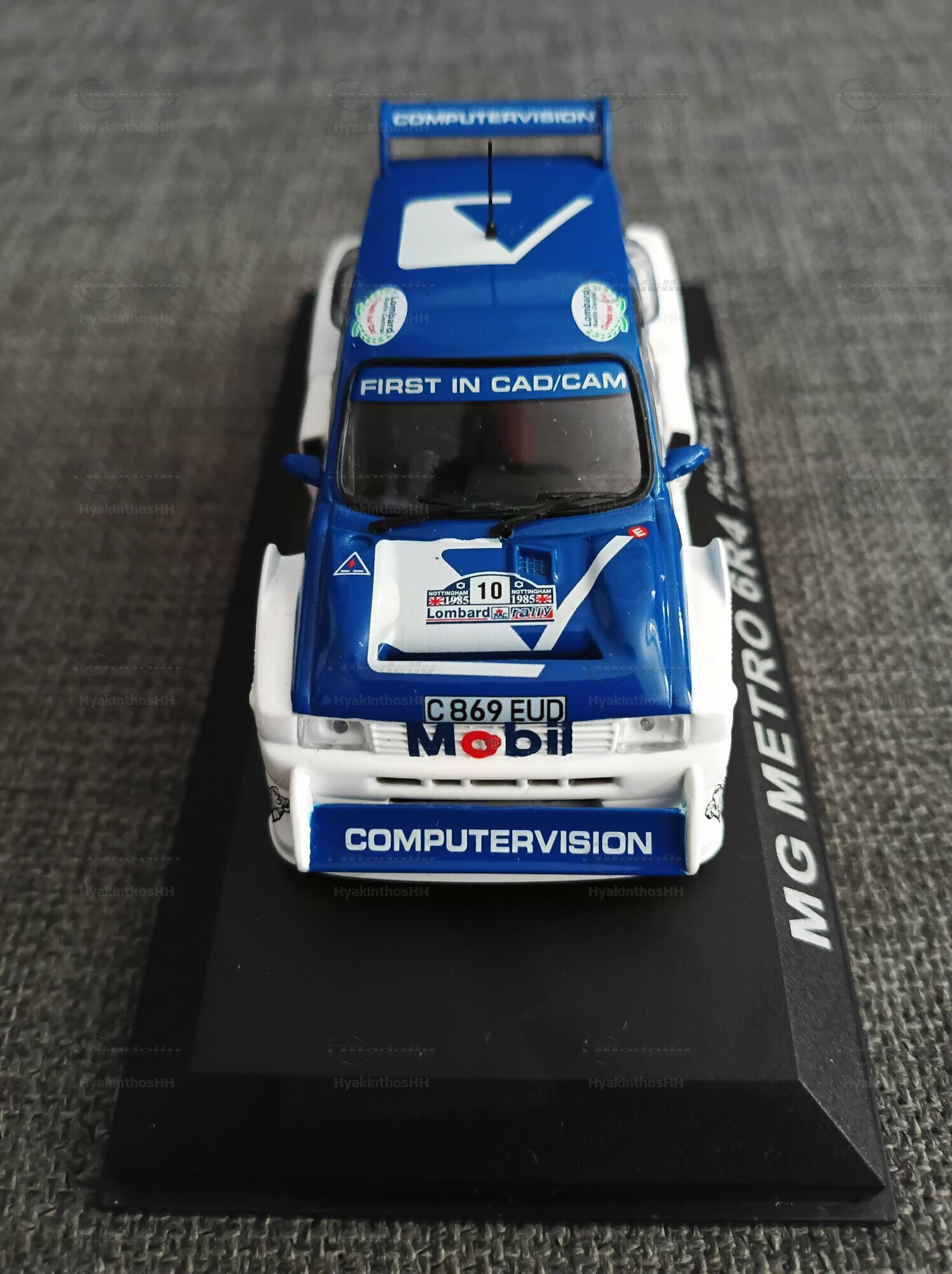 Das Vorbild dieses Sammlerstücks ist der MG Metro 6R4, ein für die Gruppe-B-Rallye entwickelte Wettbewerbswagen auf Basis des Austin/Rover Metro. Die Baureihe gilt als eigenständige Evolutionsstufe des Metro-Programms und wird hier als 6R4 bezeichnet; sie wurde ab 1985 in einer Homologationsserie gebaut, die Werksfahrzeuge liefen bis 1986. Im Werkssport löste der MG Metro 6R4 die älteren British-Leyland-Projekte ab, als Vorgänger im Konzernumfeld kann der Triumph TR7 V8 gelten. Entwickelt wurde das Rallyeauto mit maßgeblicher Unterstützung von Williams Grand Prix Engineering; federführend wirkten die Ingenieure Patrick Head und John Piper an Chassis, Packaging und Aerodynamik mit, während das Triebwerk unter Leitung von David Wood entstand. Der Name 6R4 erklärt das Konzept knapp: sechs Zylinder, Rallye, vier angetriebene Räder. Das hier gezeigte Modell entspricht der Spezifikation des Debütauftritts bei der Lombard RAC Rally 1985 und zeigt die werksseitige Computervision-Lackierung.