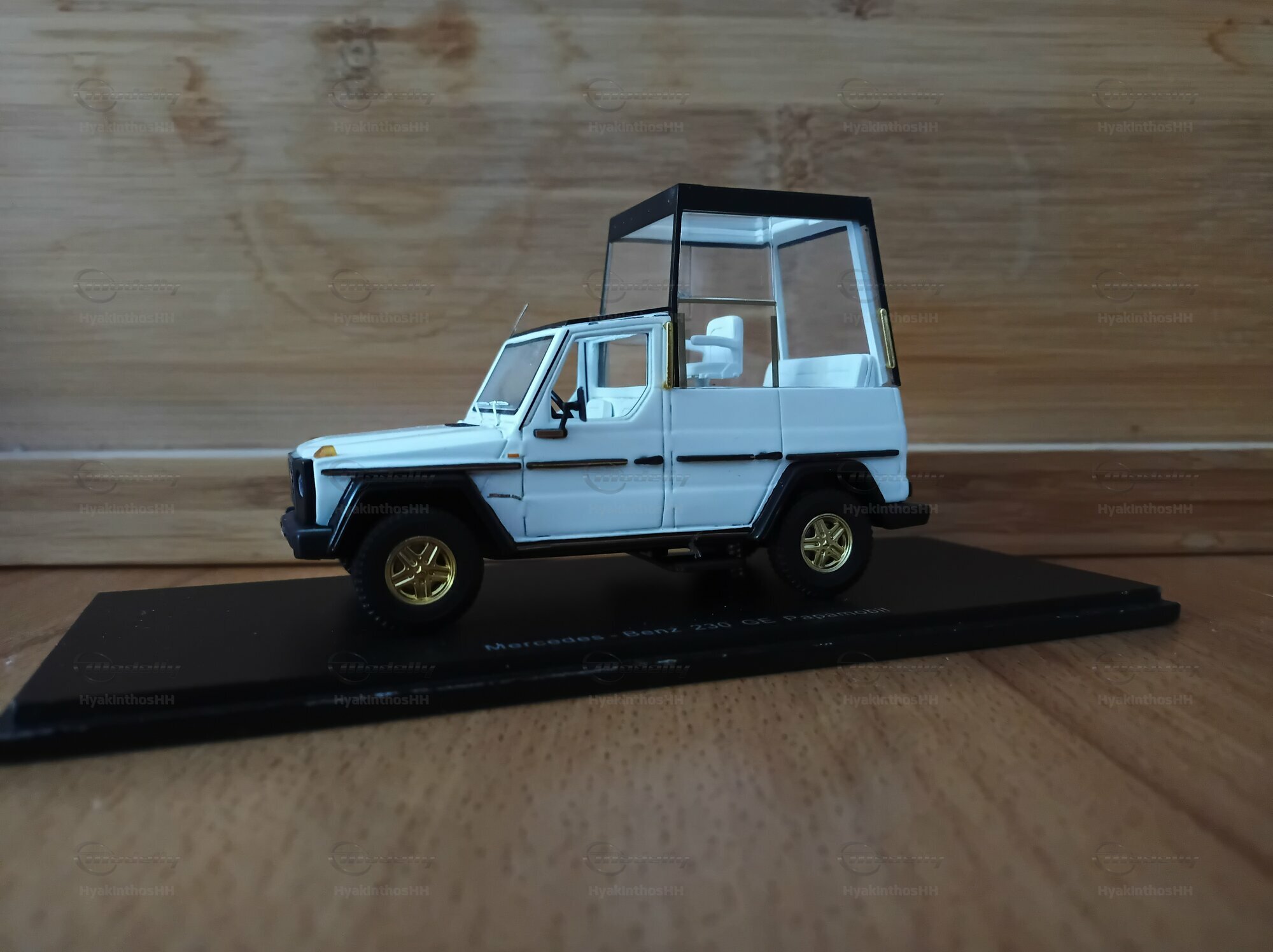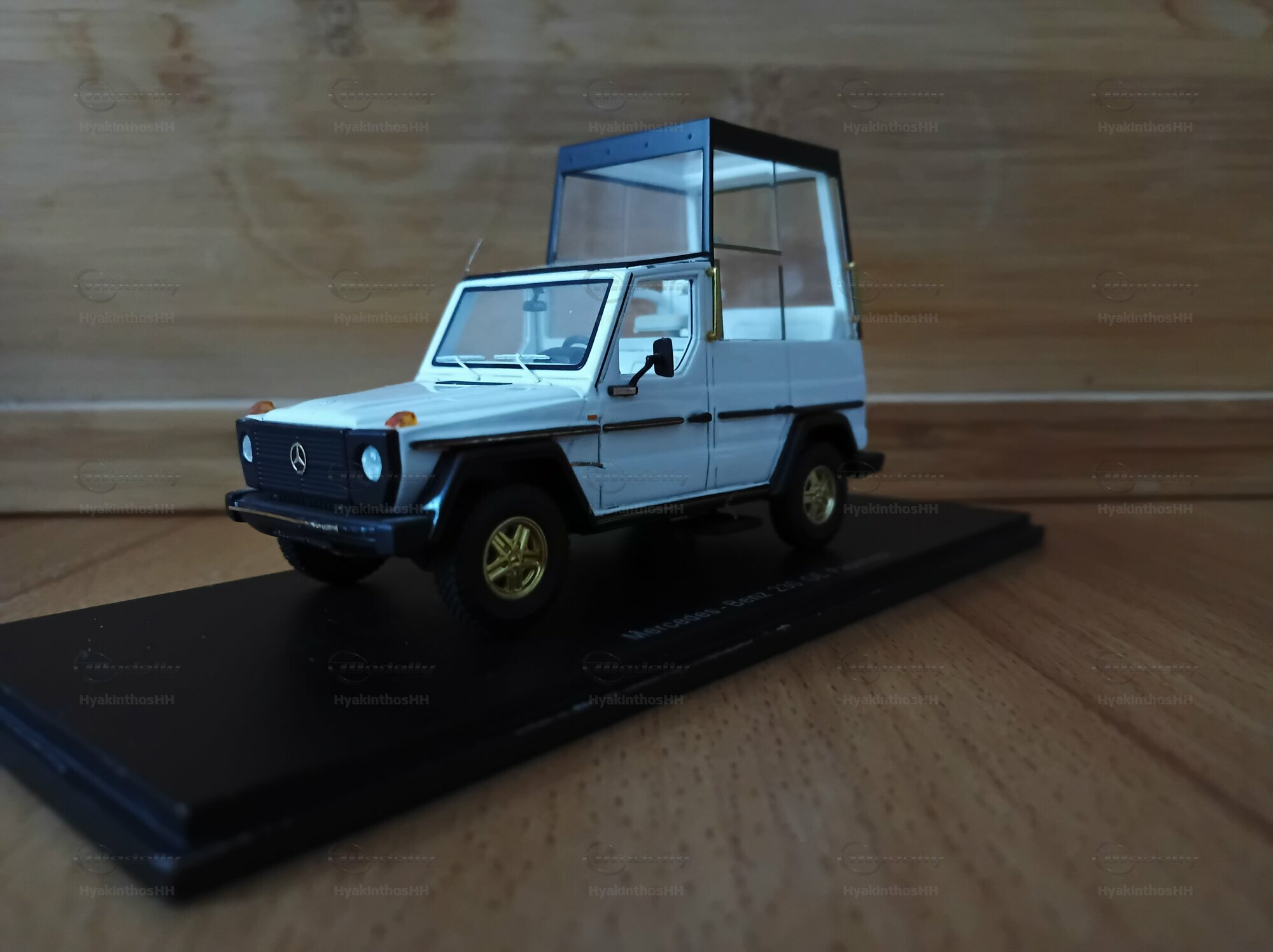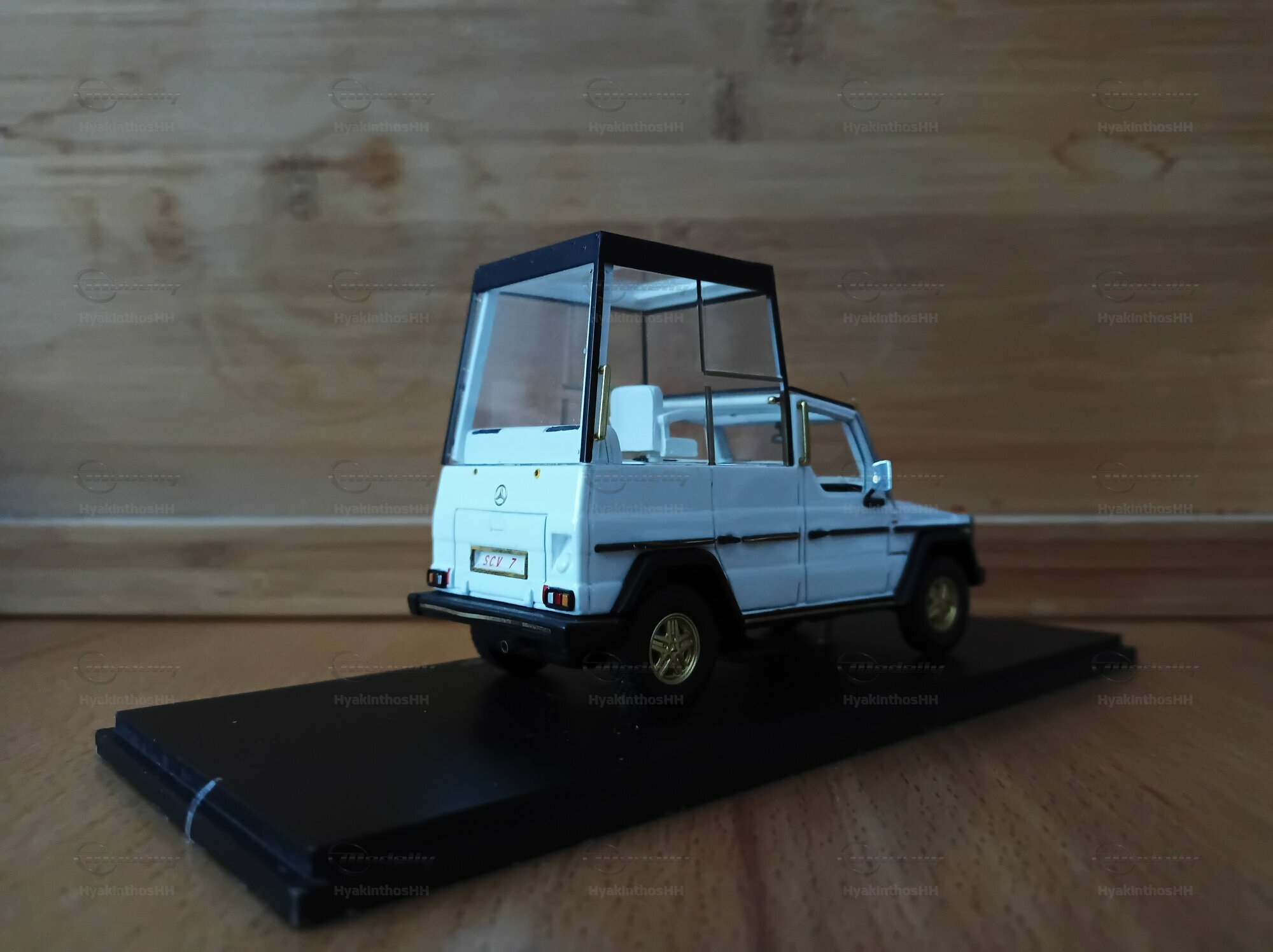This detailed collector’s item was made by Spark Minimax in a 1/43 scale and is crafted from high-quality diecast material. It accurately replicates the design and functionality of the original Mercedes-Benz 230 GE W460 Papamobil. The model, which belongs to model enthusiast “HyakinthosHH,” really stands out due to its precise detailing. The golden rims are particularly eye-catching, giving the model a unique flair. Plus, it perfectly captures the features of the bulletproof glass cabin, specifically designed for public appearances. Every little detail on the model, like the Mercedes-Benz logos, door handles, and side mirrors, has been thoughtfully designed to meet the wishes of collectors.