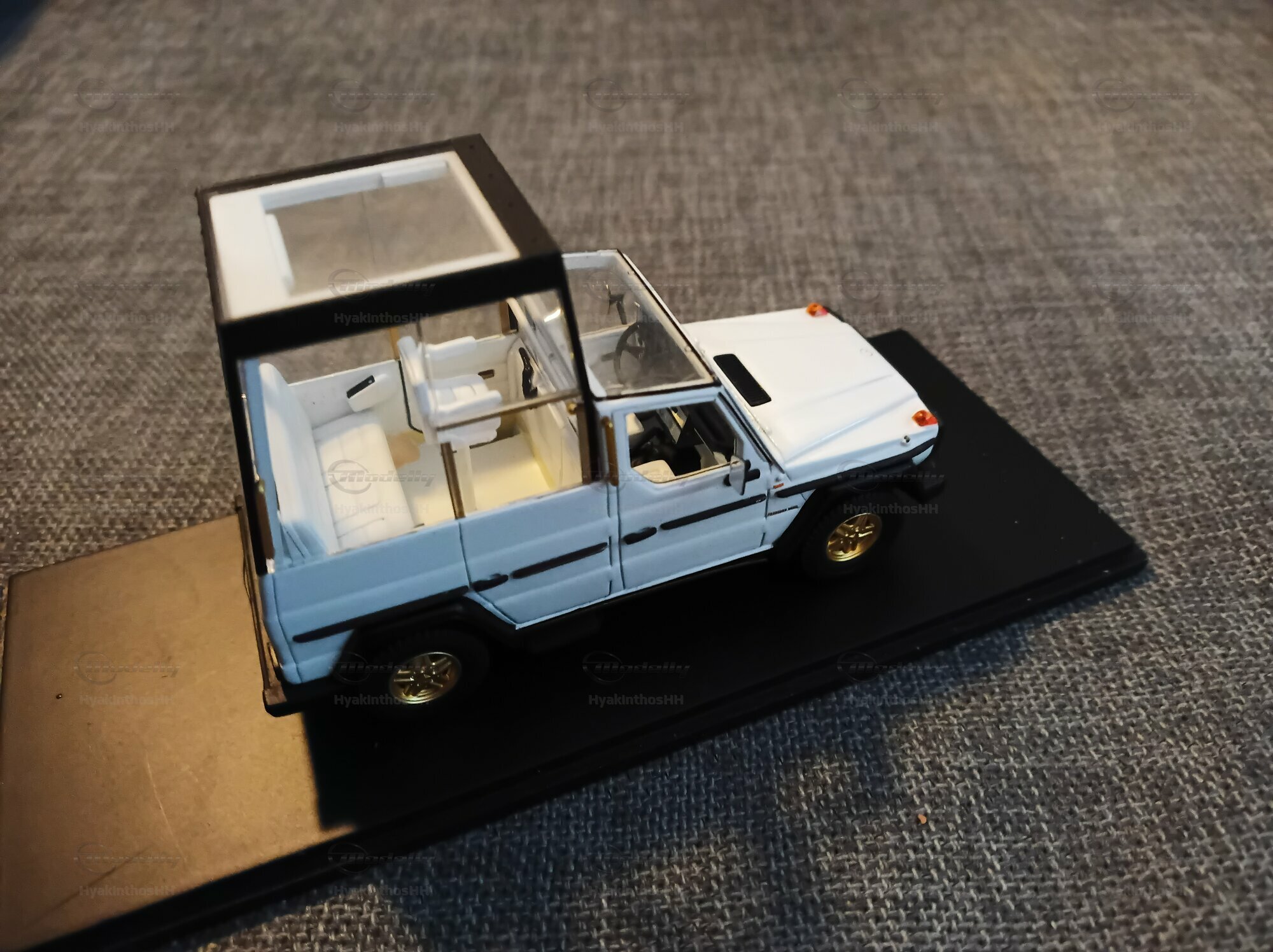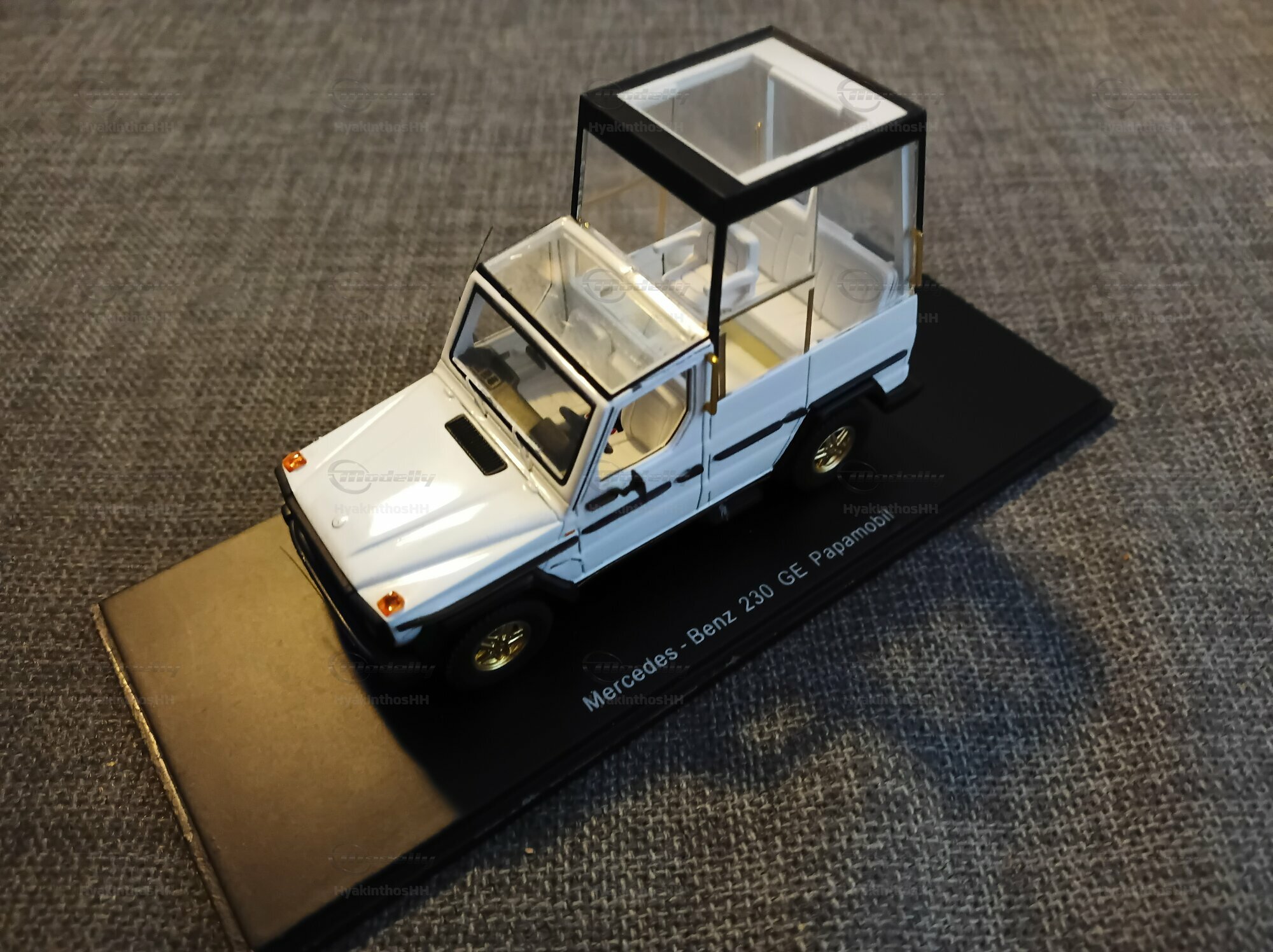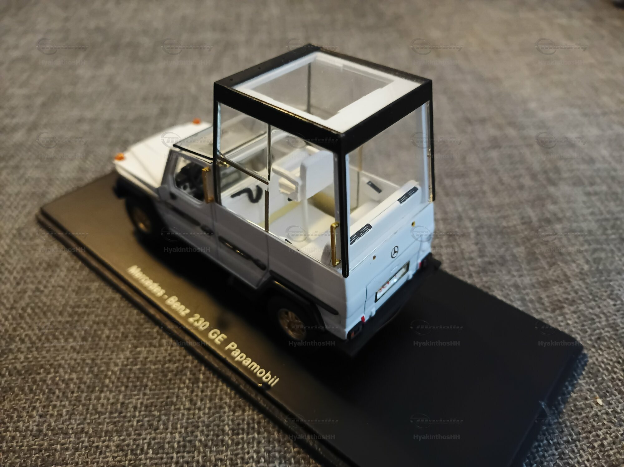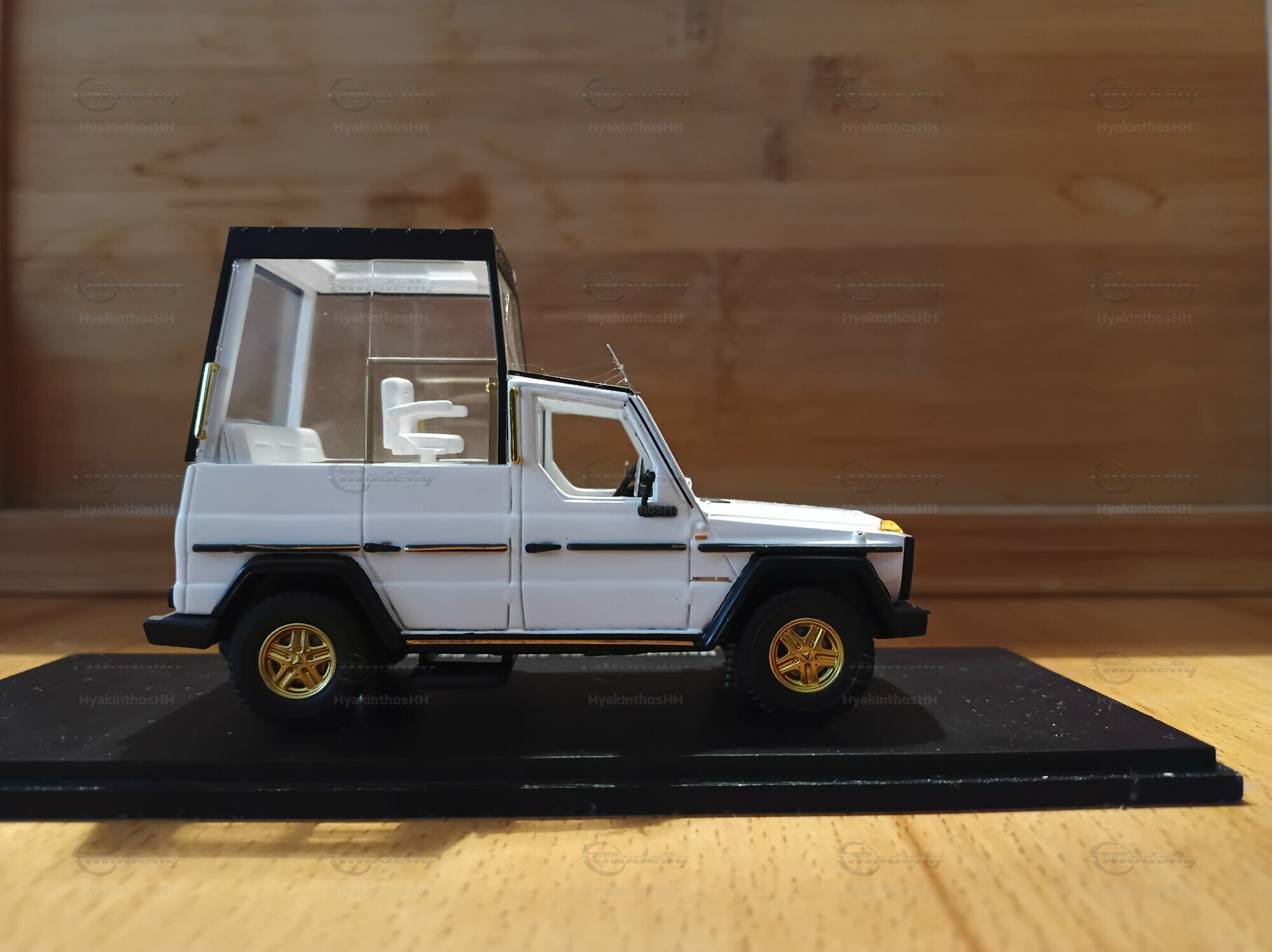 This detailed collector’s item was made by Spark Minimax in a 1/43 scale and is crafted from high-quality diecast material. It accurately replicates the design and functionality of the original Mercedes-Benz 230 GE W460 Papamobil. The model, which belongs to model enthusiast “HyakinthosHH,” really stands out due to its precise detailing. The golden rims are particularly eye-catching, giving the model a unique flair. Plus, it perfectly captures the features of the bulletproof glass cabin, specifically designed for public appearances. Every little detail on the model, like the Mercedes-Benz logos, door handles, and side mirrors, has been thoughtfully designed to meet the wishes of collectors.