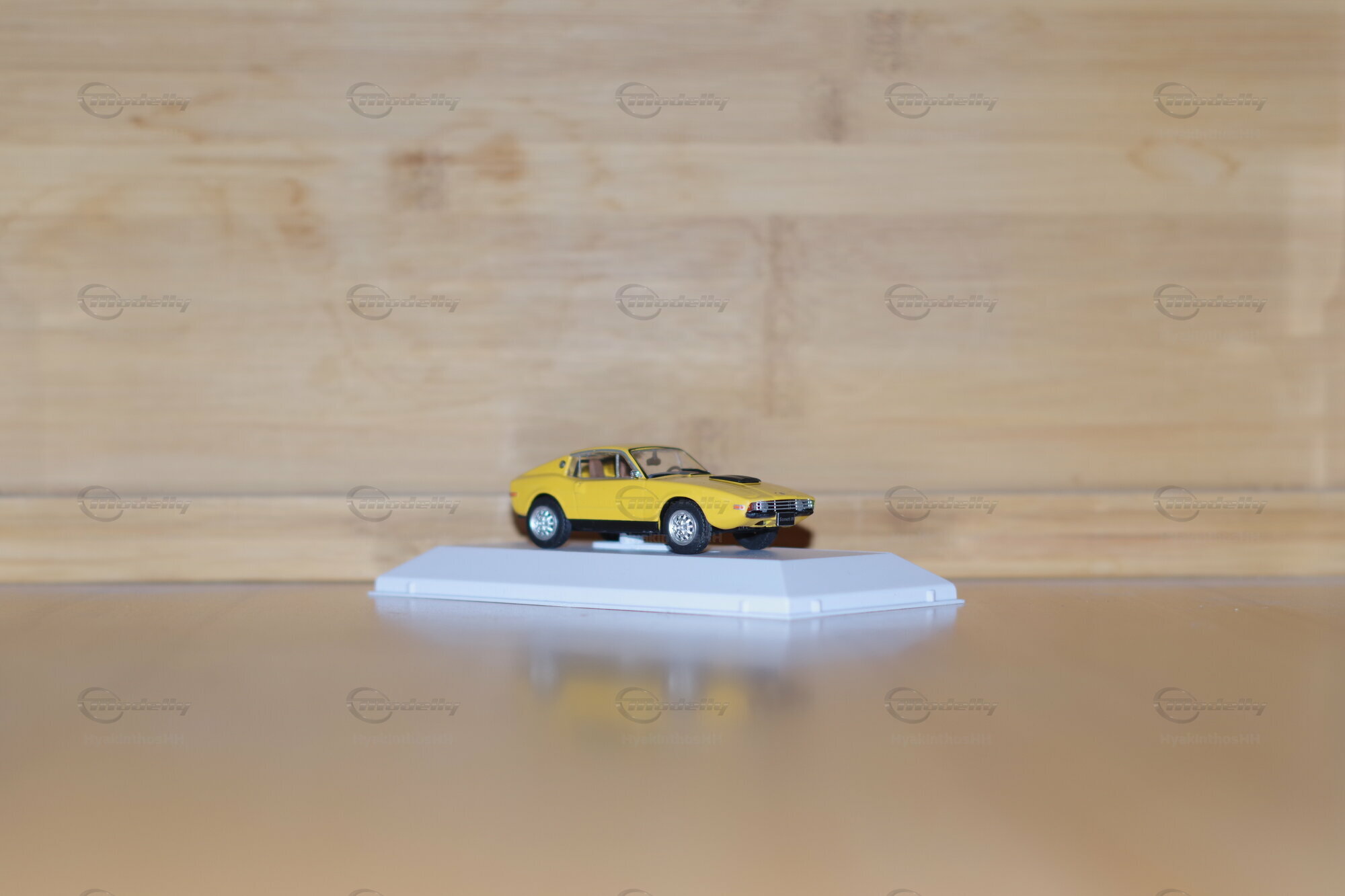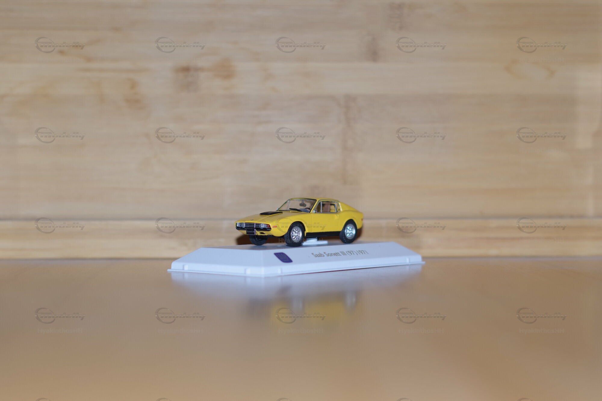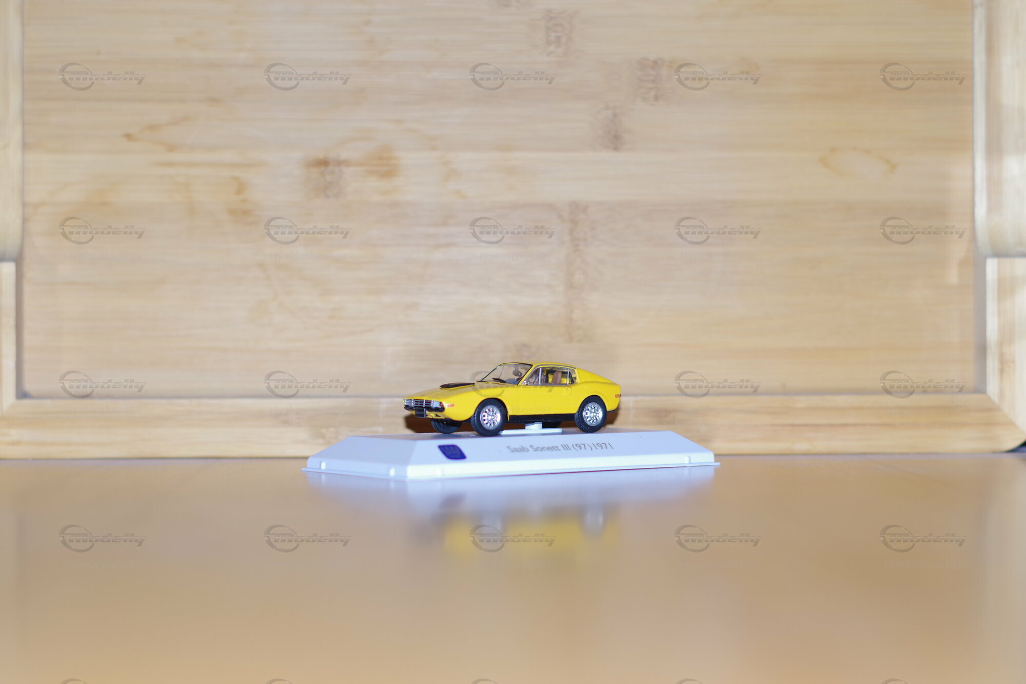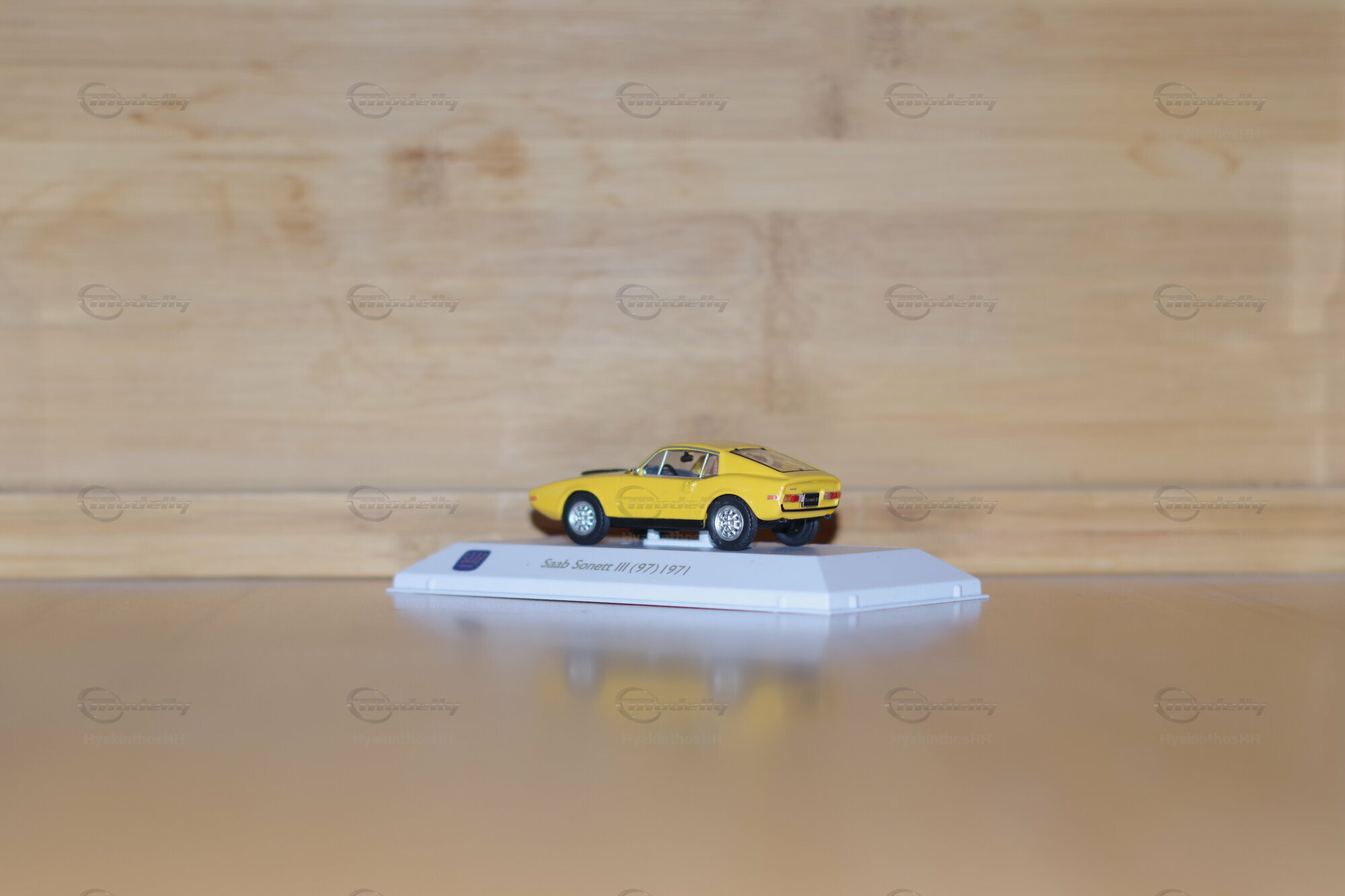 The model car presented here, part of the collection of Modelly member "HyakinthosHH", is a precise replica of the Saab Sonett III. This scale model was crafted by Universal Hobbies as a Saab Dealer Edition in the 1/43 scale (1 inch on the model equals 43 inches on the actual car) and is made of high-quality die-cast material. It showcases the iconic yellow paintwork of the original, capturing the sporty and stylish character of the vehicle. The front bumper, featuring the distinctive grille and narrow rectangular headlights, has been faithfully replicated down to the details. The sleek lines of the coupe and the distinctive taillights are also excellently represented in the miniature version.