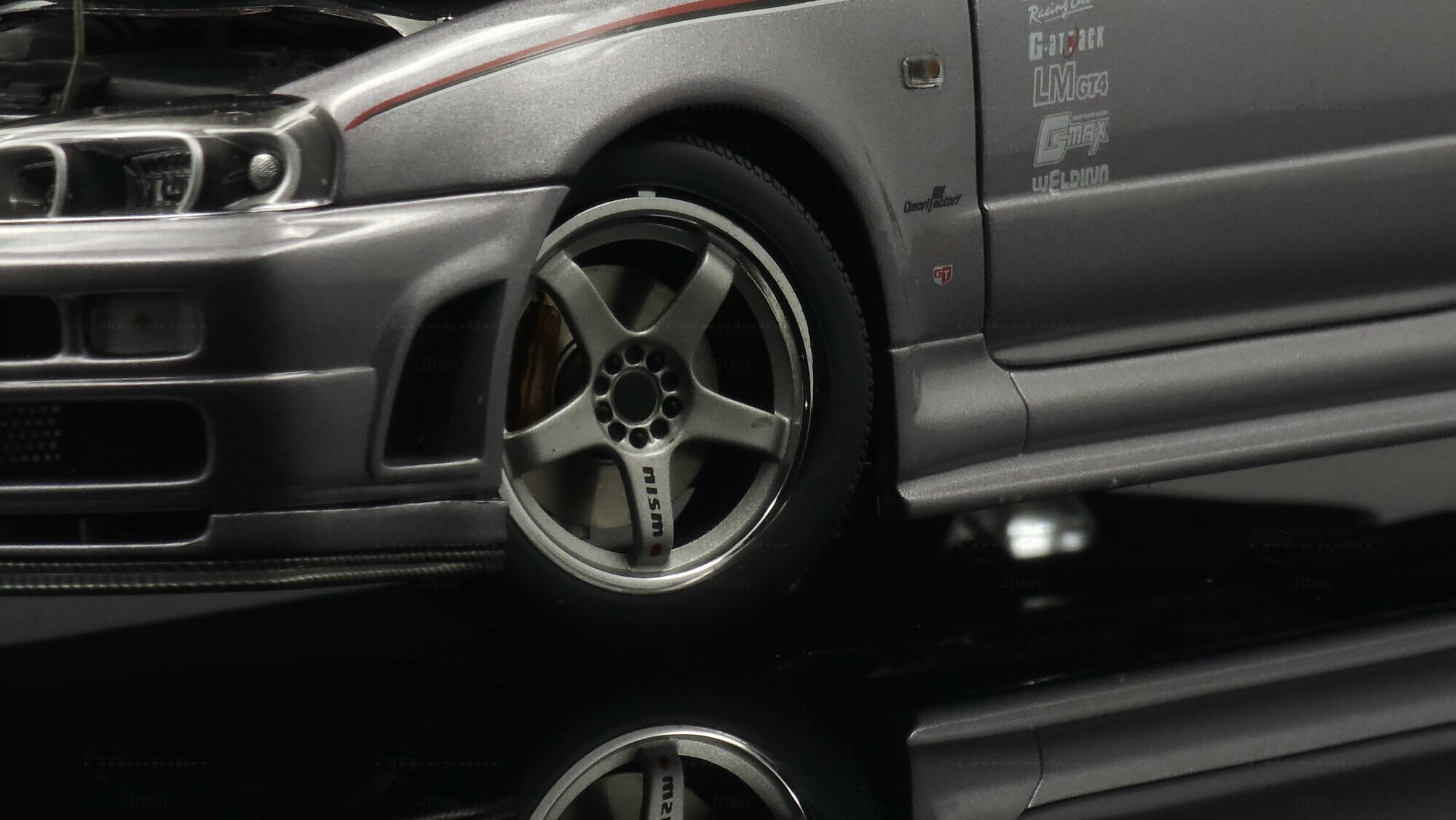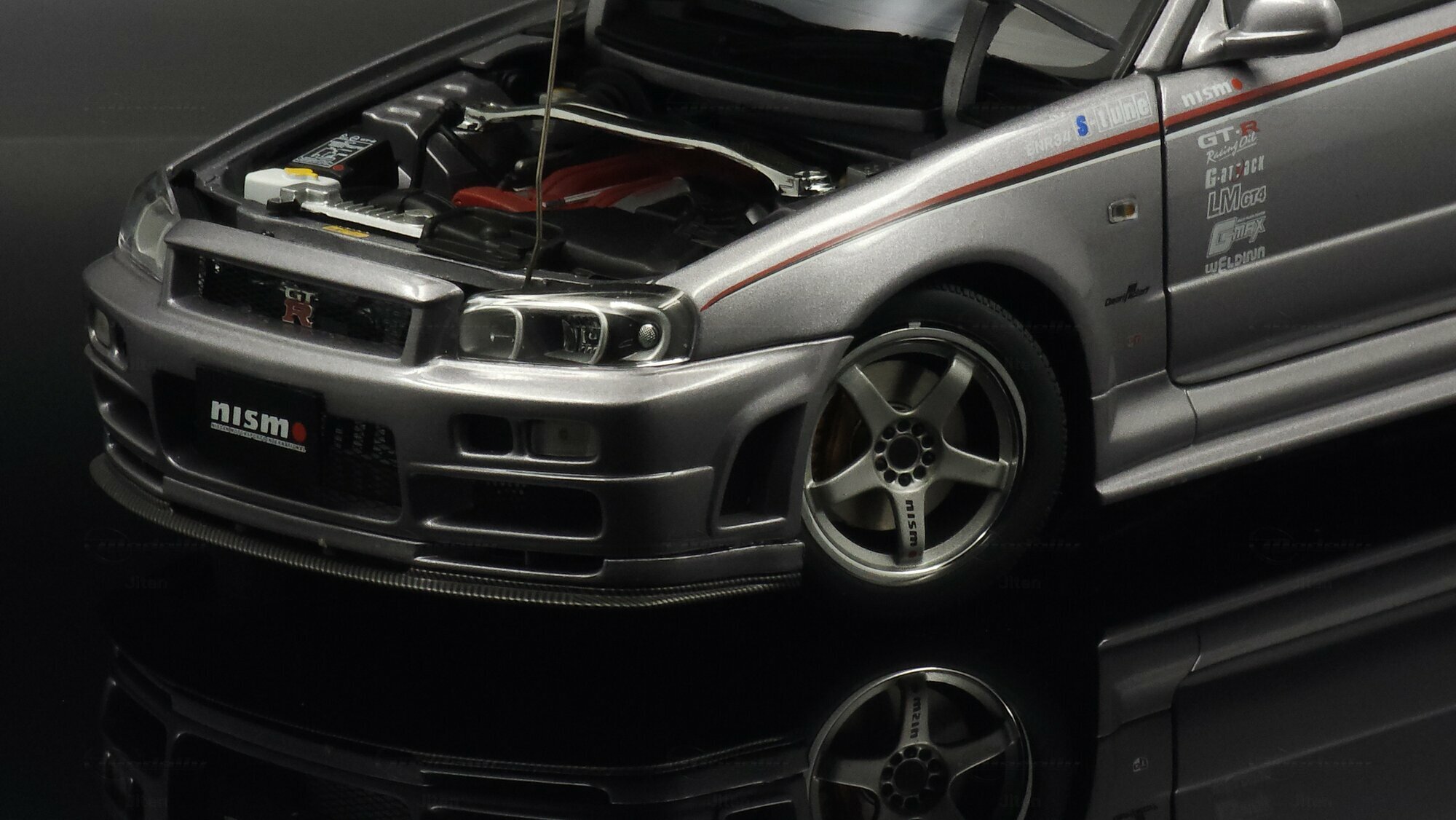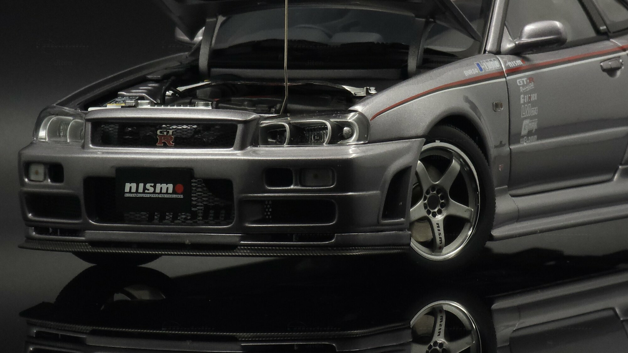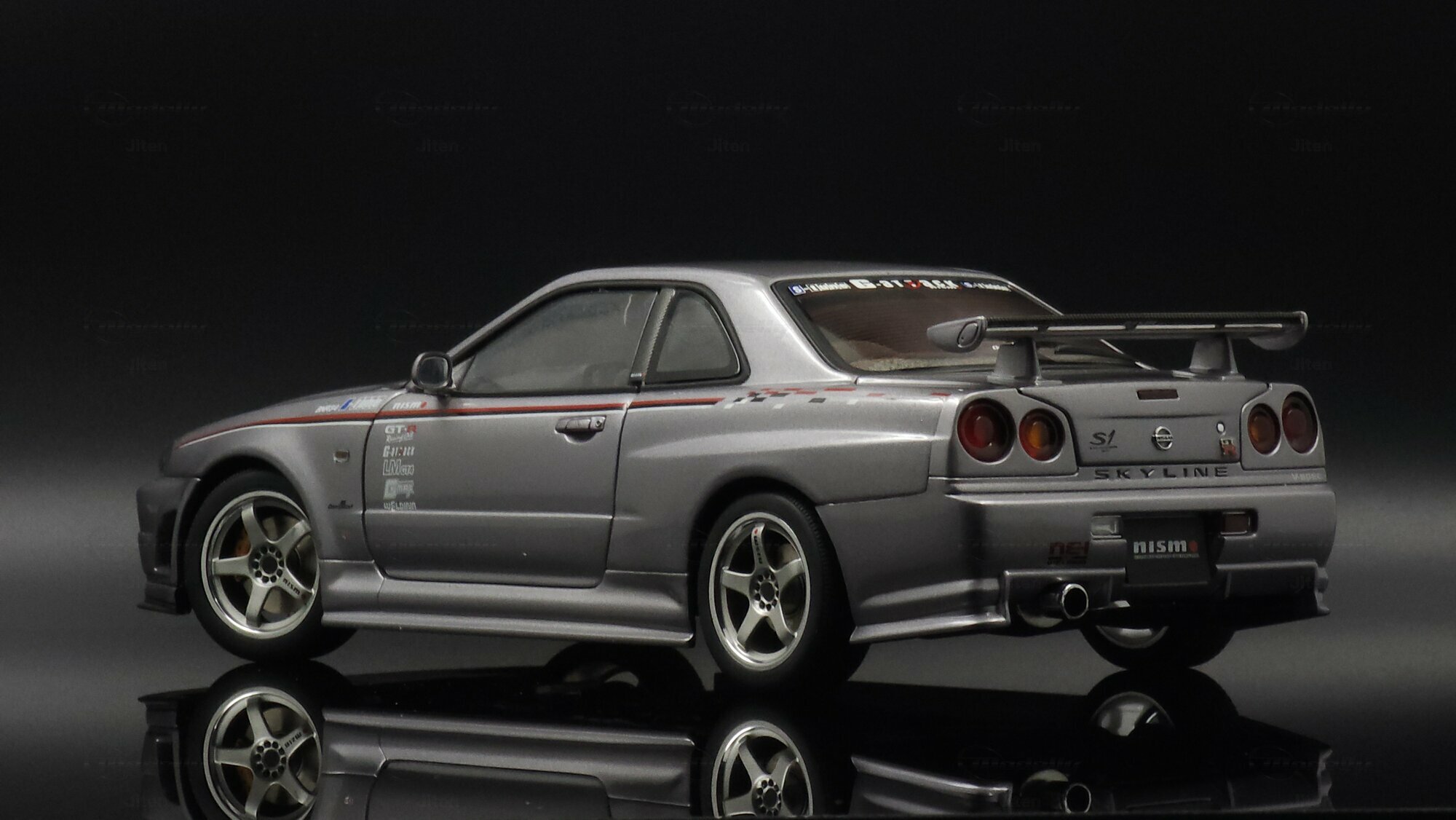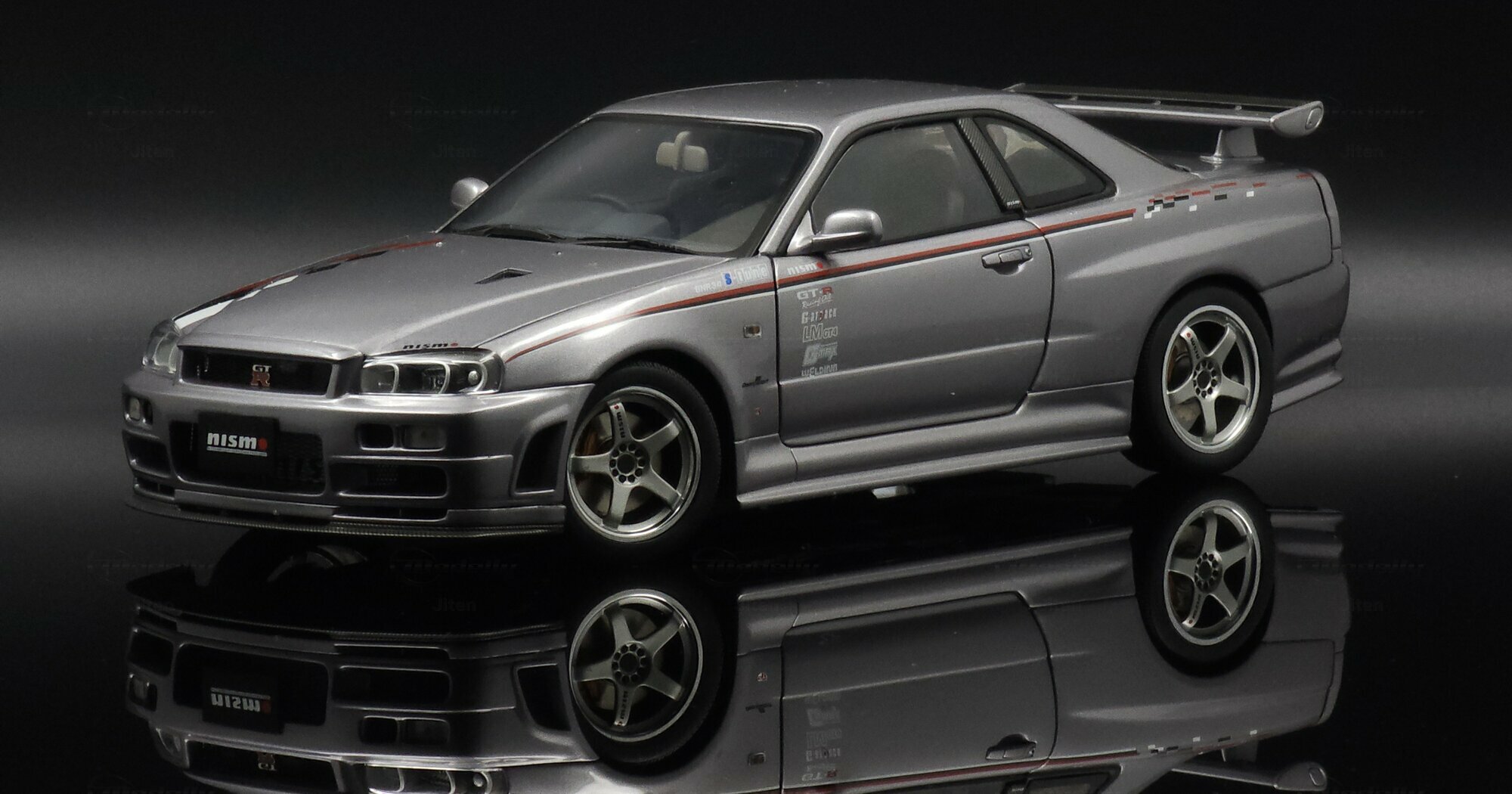 This pictured piece is a 1/18 scale model made by AUTOart, part of collector Jiten’s stash. It’s a diecast model that nails a lot of the details fans care about. You can see the NISMO plate on the grille, the GT‑R badge and the aggressive front bumper with big cooling openings. A thin red pinstripe runs along the side and there’s a checker/karo graphic that nods to NISMO’s motorsport styling. Door decals — shoutouts to GT‑R, S‑tune and LMGT4 — are nicely placed. The five‑spoke wheels are inspired by the NISMO LMGT4 from RAYS Engineering and sit under slightly flared arches. At the back you’ve got the signature four round taillights, a SKYLINE badge and a big adjustable wing that even shows a subtle carbon texture. Inside you can spot bucket seats, door panels and a grey center console, plus a three‑spoke steering wheel and round gauges — all scaled down but tidy. This AUTOart 1/18 is a limited edition, which makes it extra appealing to collectors.