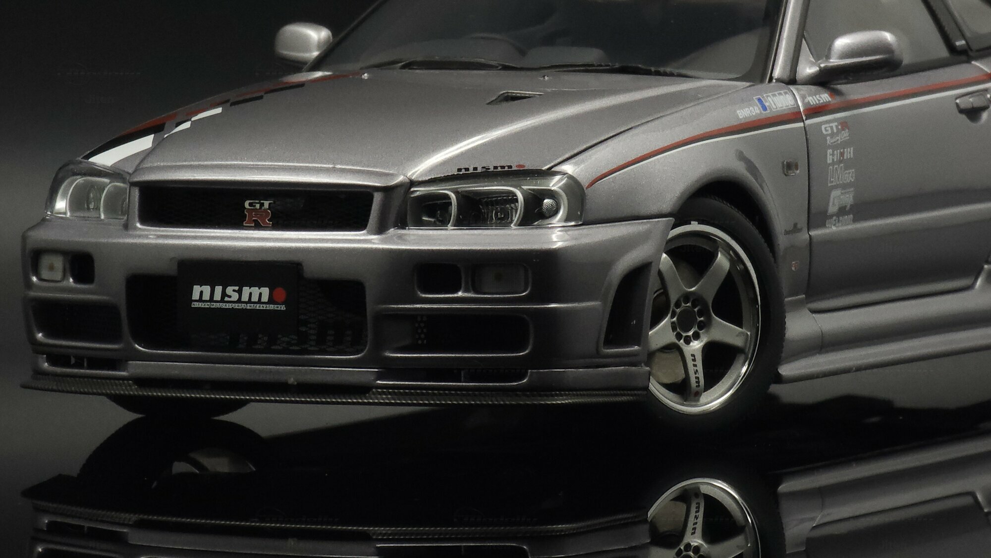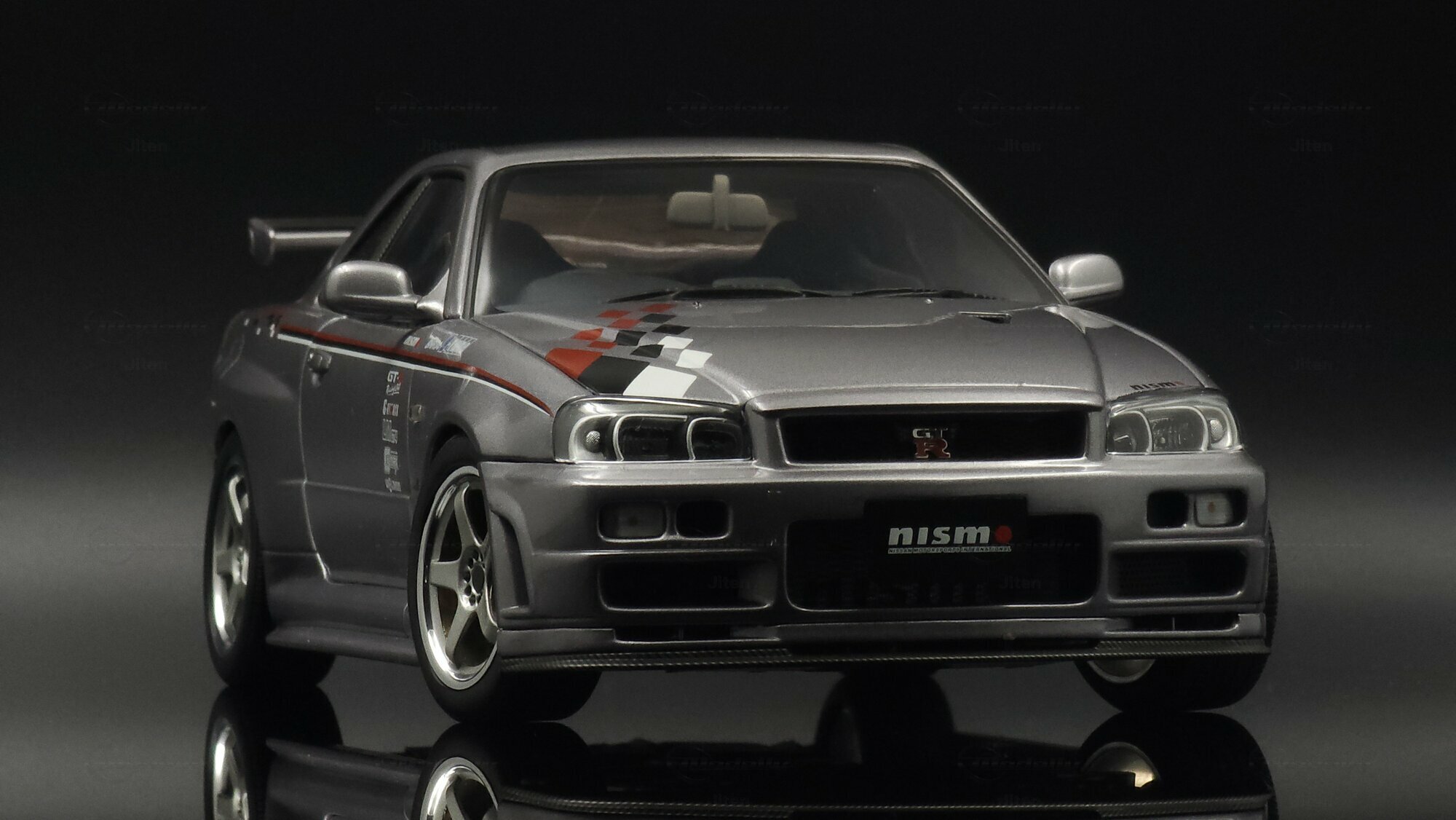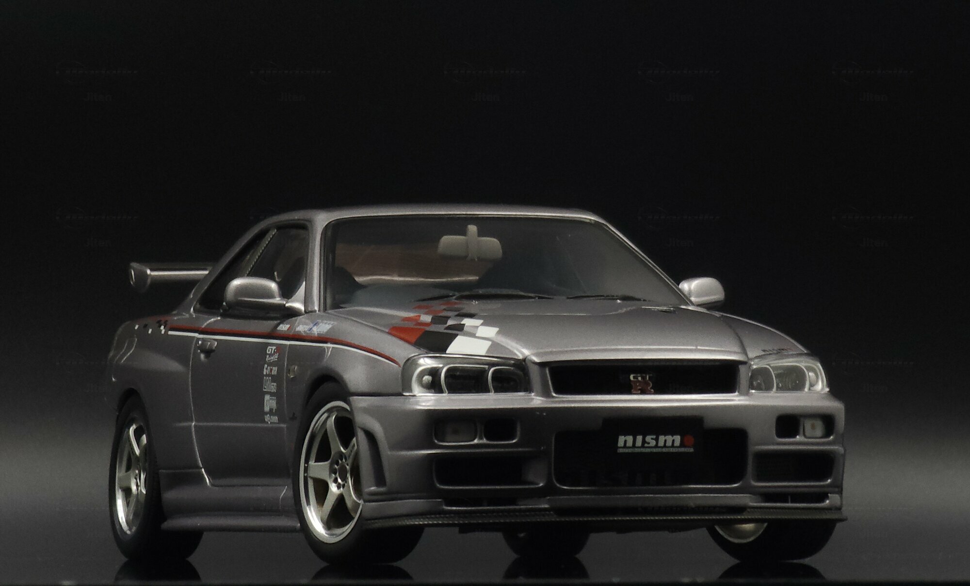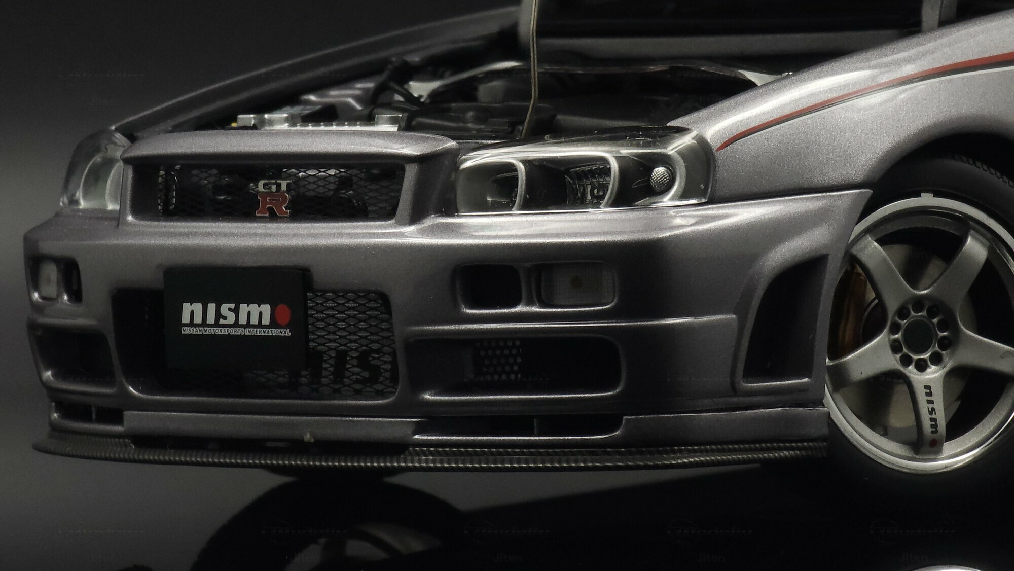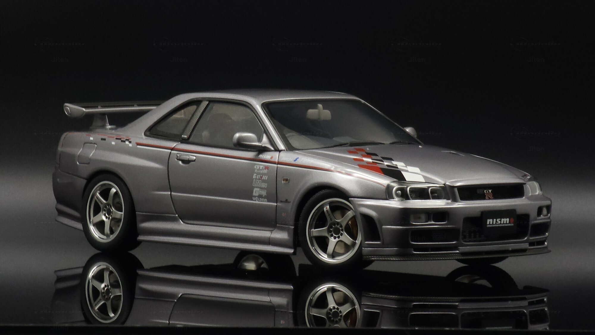 This pictured piece is a 1/18 scale model made by AUTOart, part of collector Jiten’s stash. It’s a diecast model that nails a lot of the details fans care about. You can see the NISMO plate on the grille, the GT‑R badge and the aggressive front bumper with big cooling openings. A thin red pinstripe runs along the side and there’s a checker/karo graphic that nods to NISMO’s motorsport styling. Door decals — shoutouts to GT‑R, S‑tune and LMGT4 — are nicely placed. The five‑spoke wheels are inspired by the NISMO LMGT4 from RAYS Engineering and sit under slightly flared arches. At the back you’ve got the signature four round taillights, a SKYLINE badge and a big adjustable wing that even shows a subtle carbon texture. Inside you can spot bucket seats, door panels and a grey center console, plus a three‑spoke steering wheel and round gauges — all scaled down but tidy. This AUTOart 1/18 is a limited edition, which makes it extra appealing to collectors.