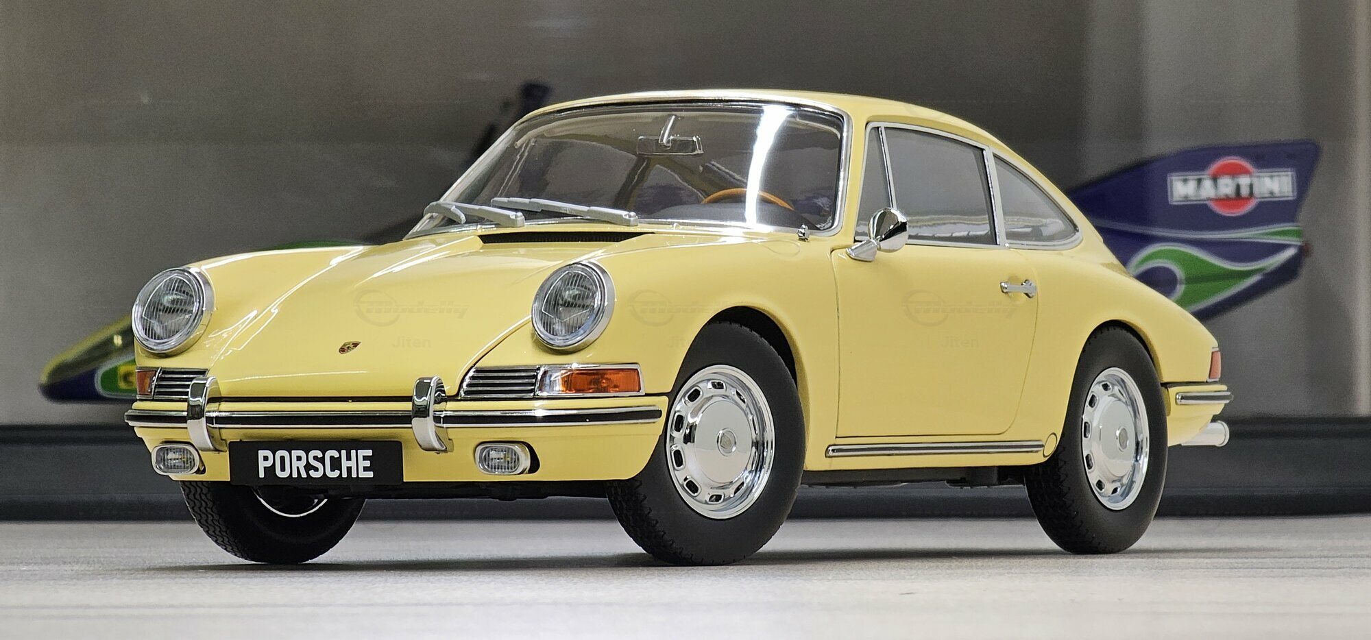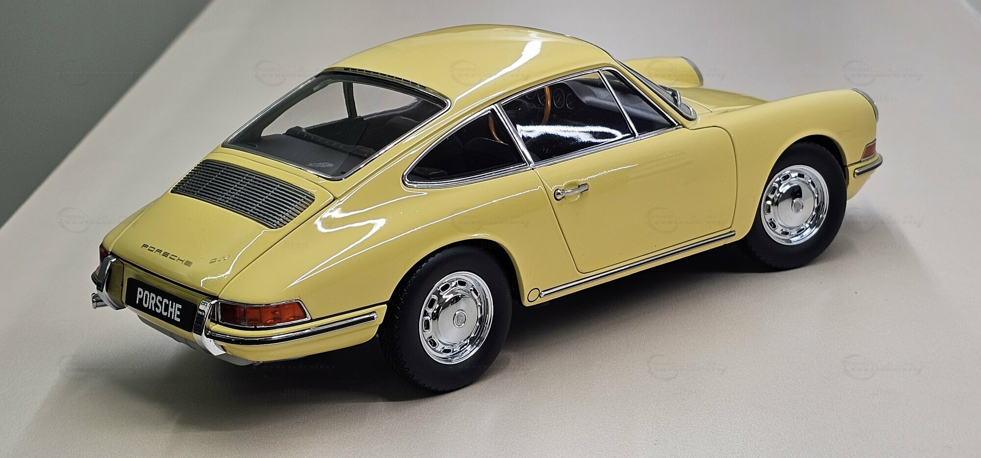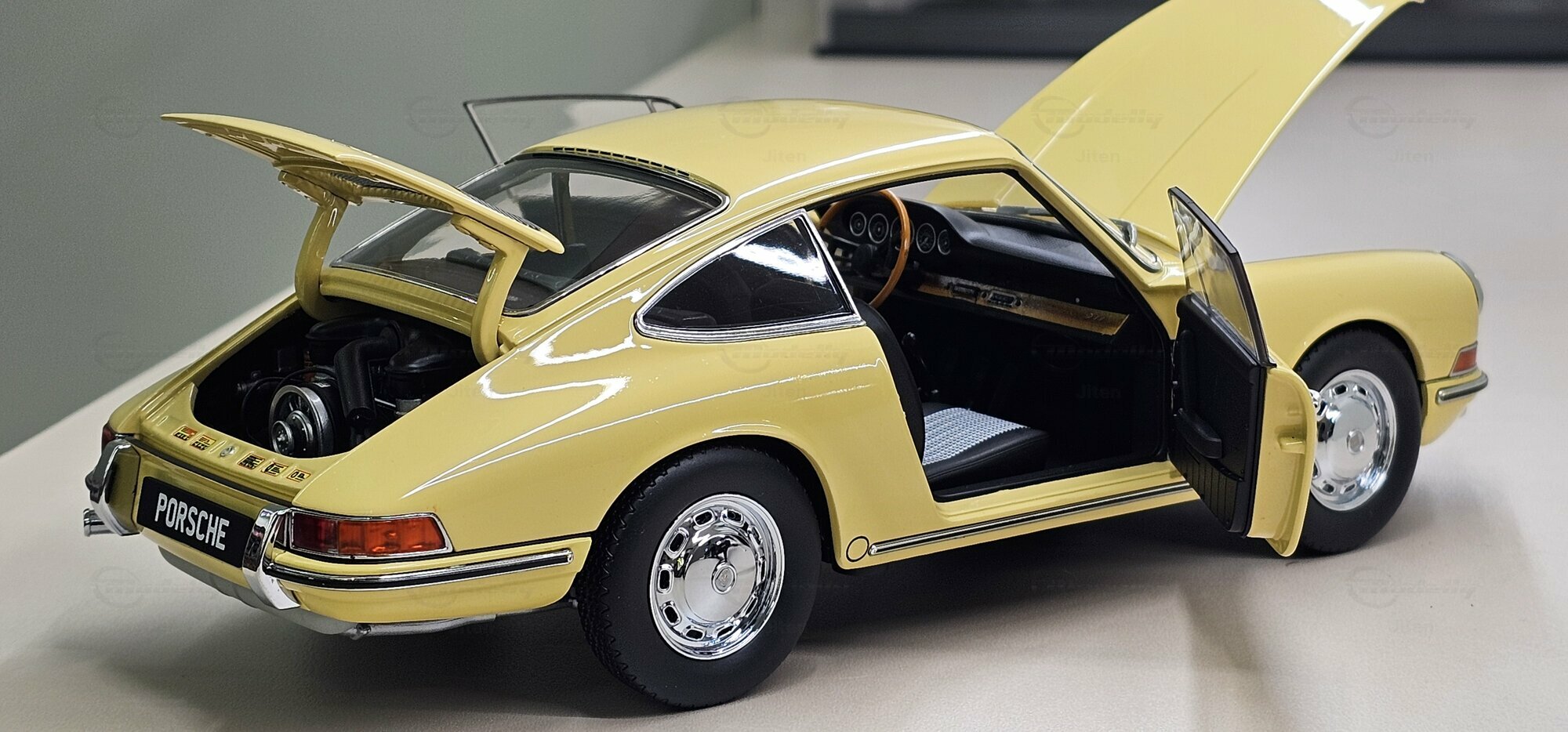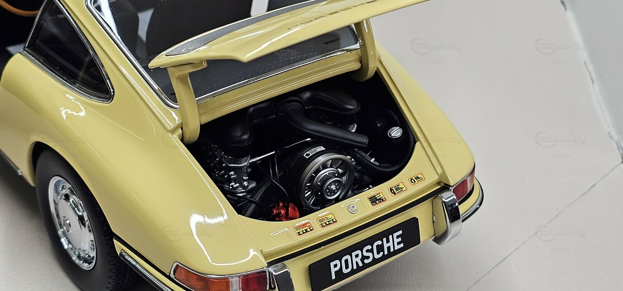 The model we’re looking at here is a beautifully crafted collector's item made by Kyosho in a 1/18 scale. It’s made of durable diecast material, showing off both longevity and amazing detail. This model, part of the collection owned by Modelly user “Jiten,” captures the distinctive lines and proportions of the original car with incredible accuracy. The intricate air vents on the engine cover, the round dual headlights, and the chrome bumpers perfectly reflect the aesthetics of the 1960s. A standout feature of this model is the “Porsche 911” badge on the back, which signifies the shift from its original name “901” after Peugeot claimed rights to three-digit names ending with a zero.