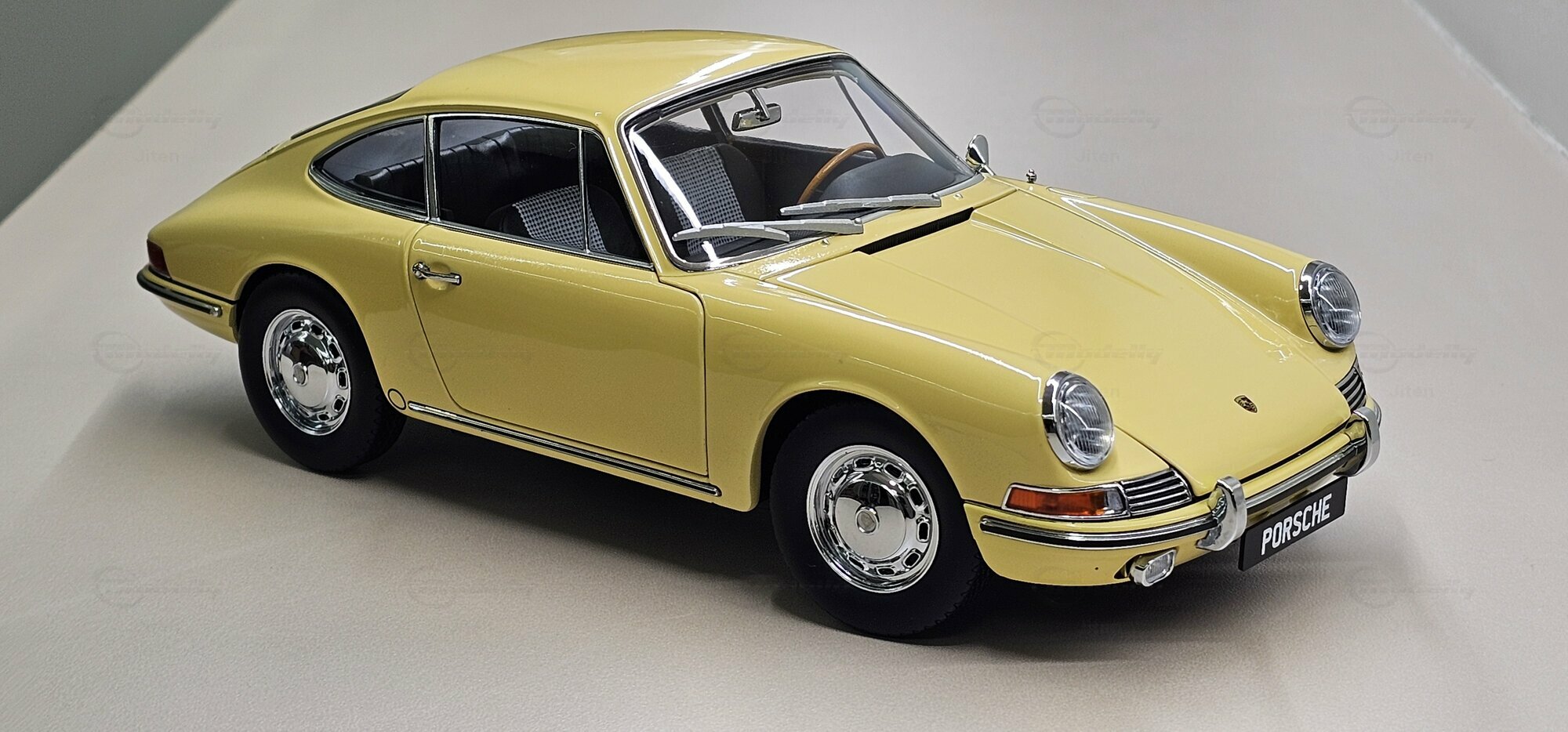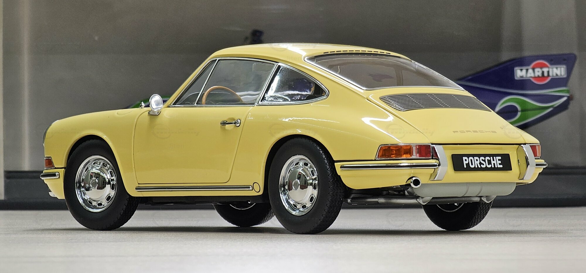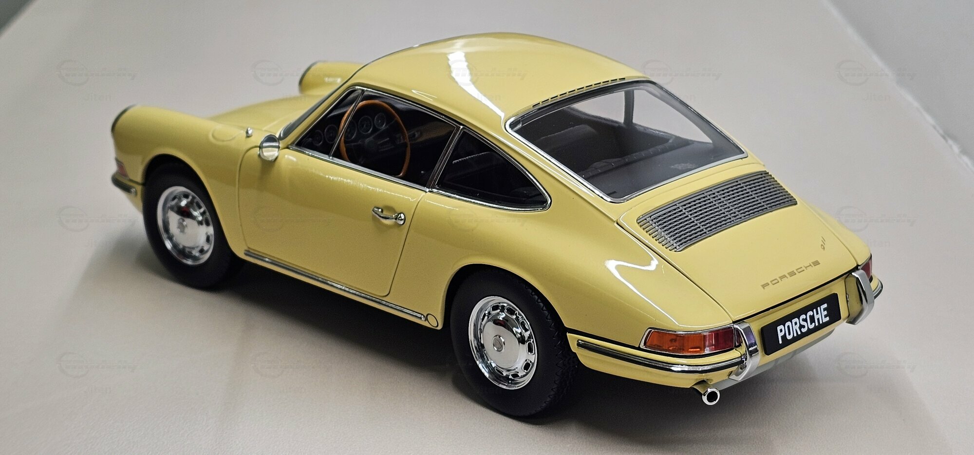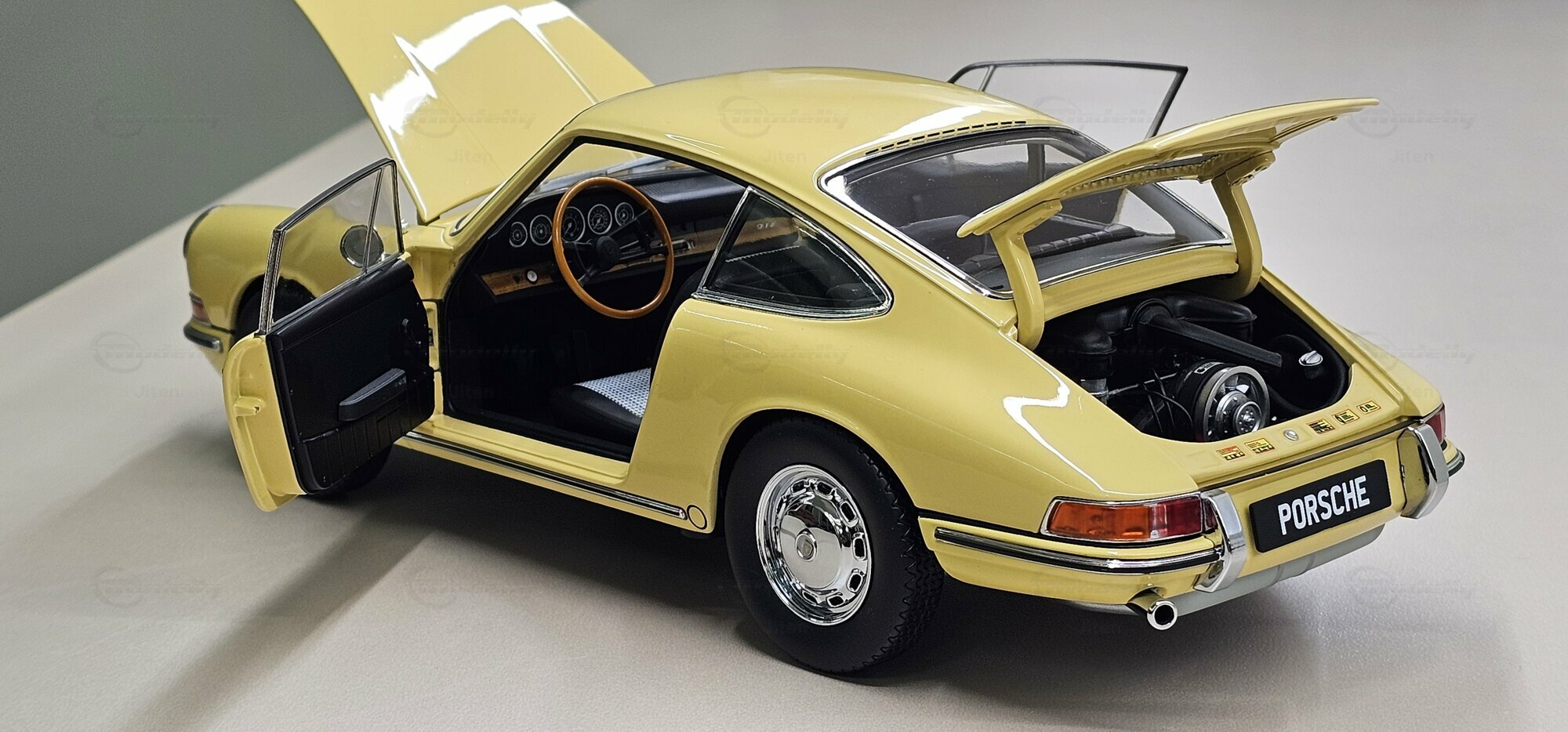 The model we’re looking at here is a beautifully crafted collector's item made by Kyosho in a 1/18 scale. It’s made of durable diecast material, showing off both longevity and amazing detail. This model, part of the collection owned by Modelly user “Jiten,” captures the distinctive lines and proportions of the original car with incredible accuracy. The intricate air vents on the engine cover, the round dual headlights, and the chrome bumpers perfectly reflect the aesthetics of the 1960s. A standout feature of this model is the “Porsche 911” badge on the back, which signifies the shift from its original name “901” after Peugeot claimed rights to three-digit names ending with a zero.