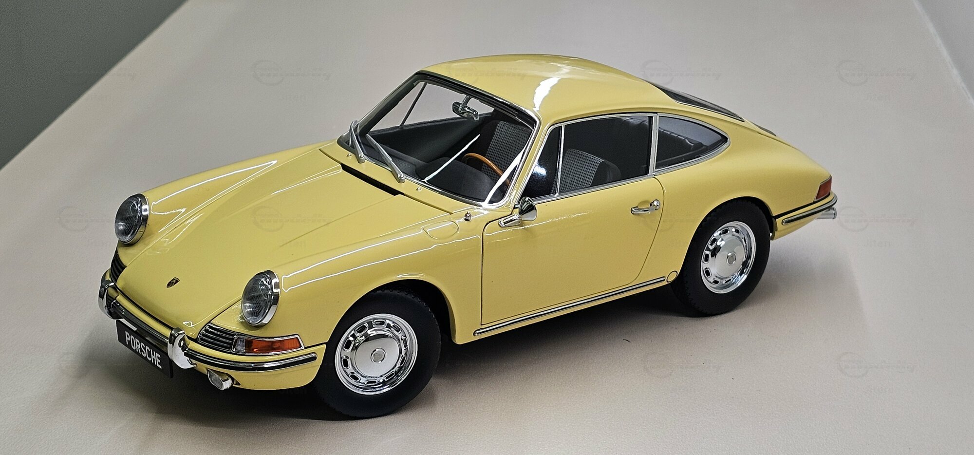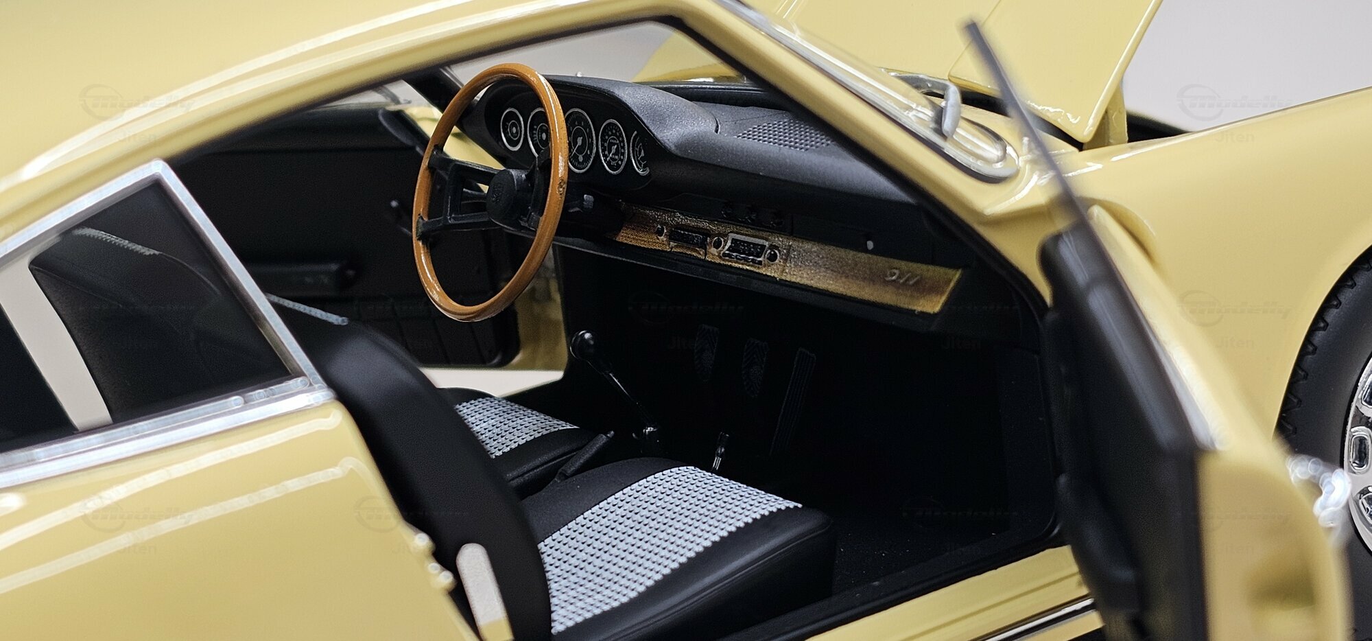 The vibrant pastel yellow paint job is flawlessly applied and gives the model a depth that’s just stunning. Inside, you'll notice the attention to detail with the wooden steering wheel and the dashboard featuring the classic five round instrument gauges. These little touches make the miniature an impressive replica for any collector interested in Porsche history and model cars.