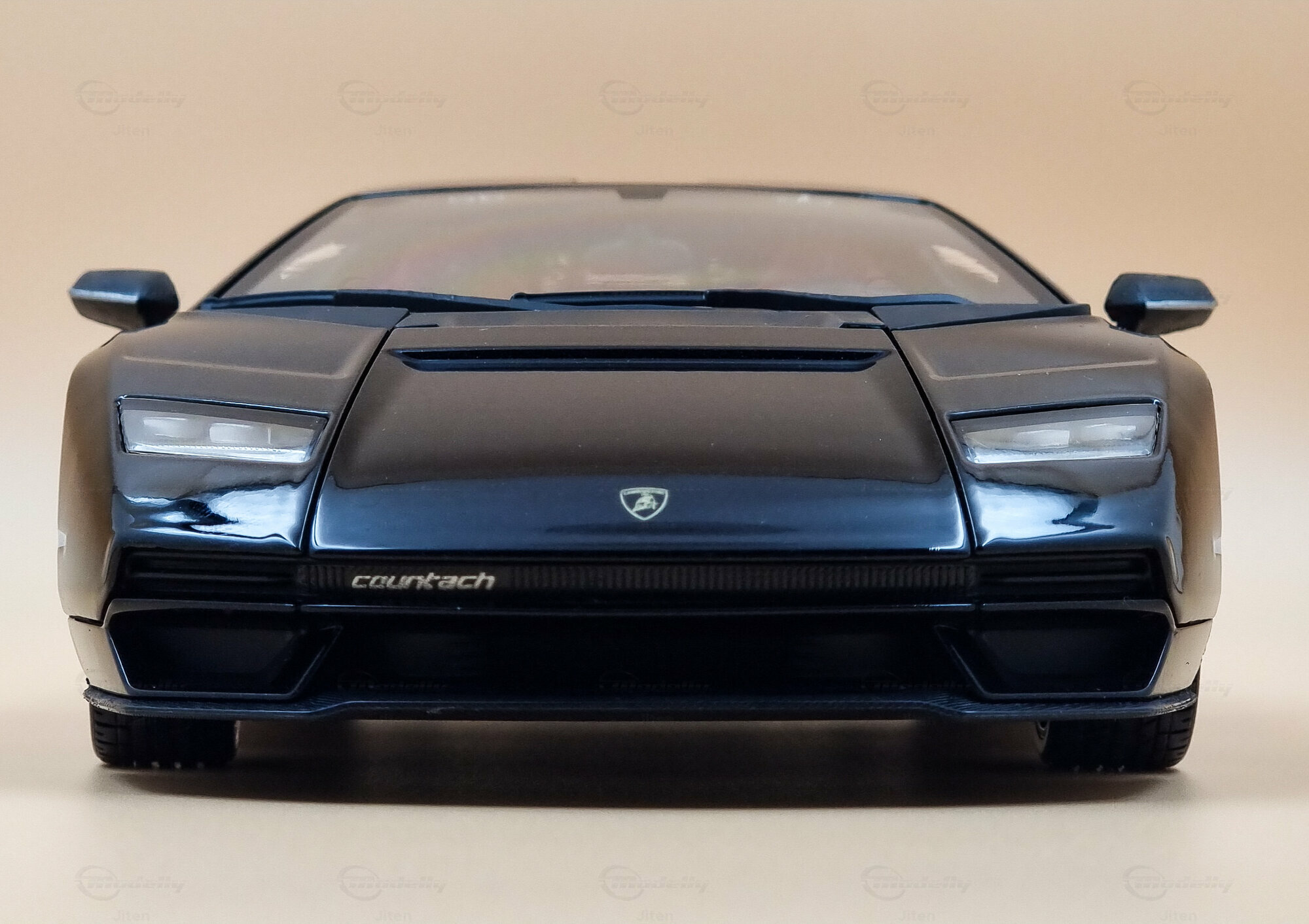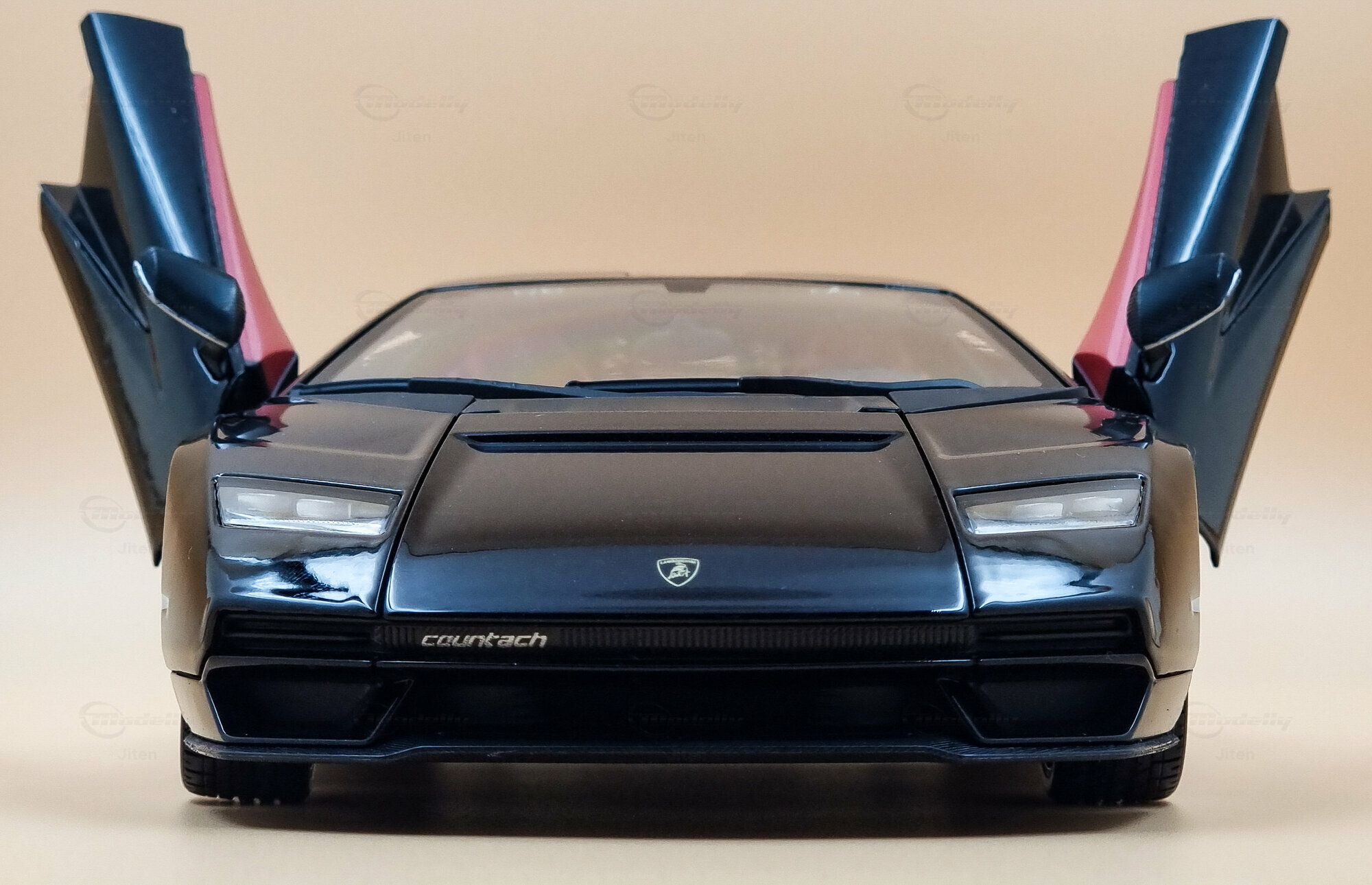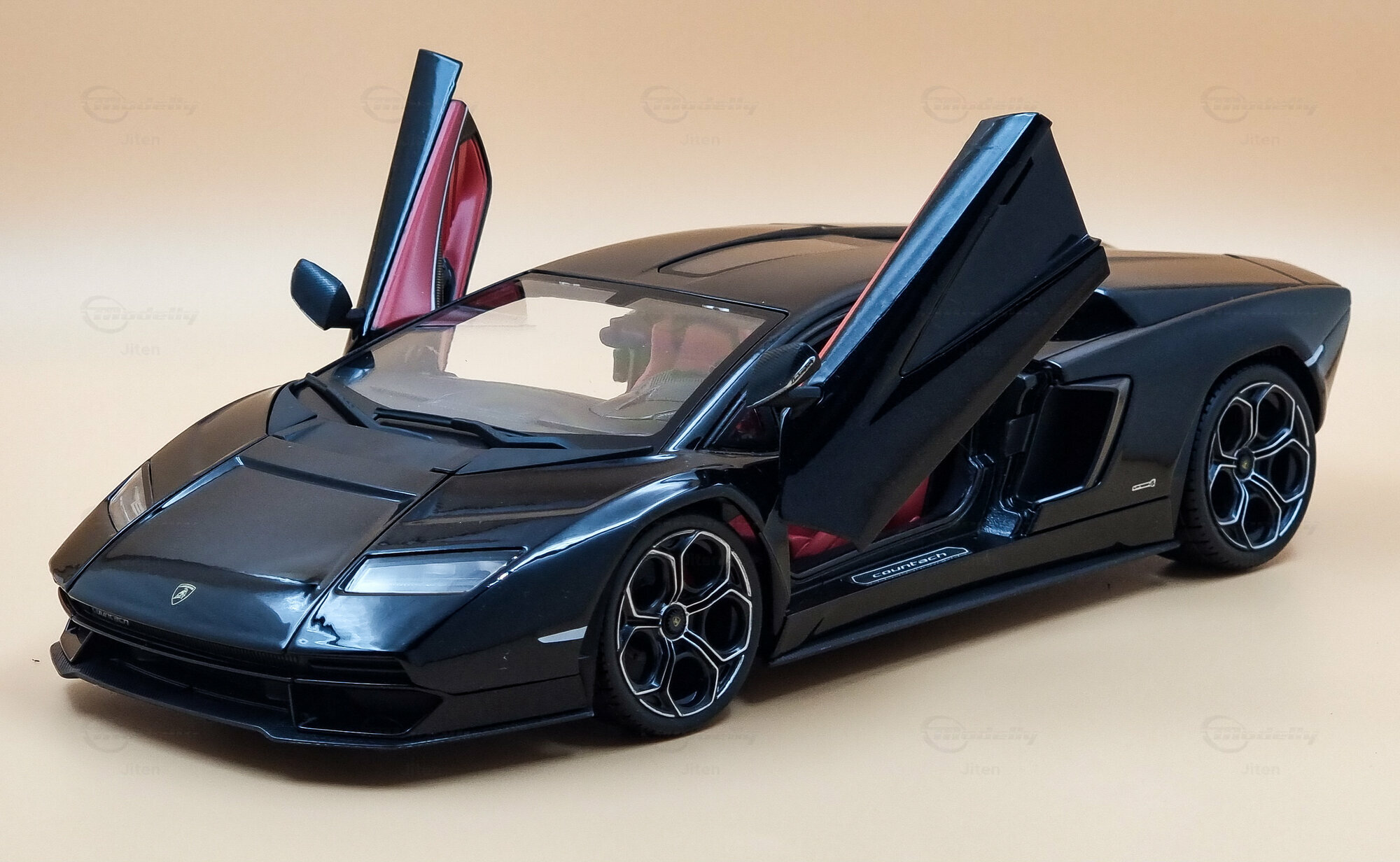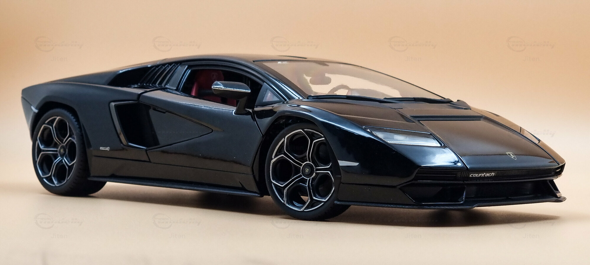 The model is dressed in a shiny black paint job that highlights the sharp, angular design of the Lamborghini Countach LPI 800-4. The paint really makes a great contrast with the red accents in the interior, which were also a highlight in the original. The hexagonal wheels are inspired by Lamborghini’s classic wheel design. While the wheels and tires mimic the originals, it's tough to tell the specific manufacturers or models in the mini version. You can spot the Lamborghini bull on the hood and the “Countach” lettering, which are nice and visible.