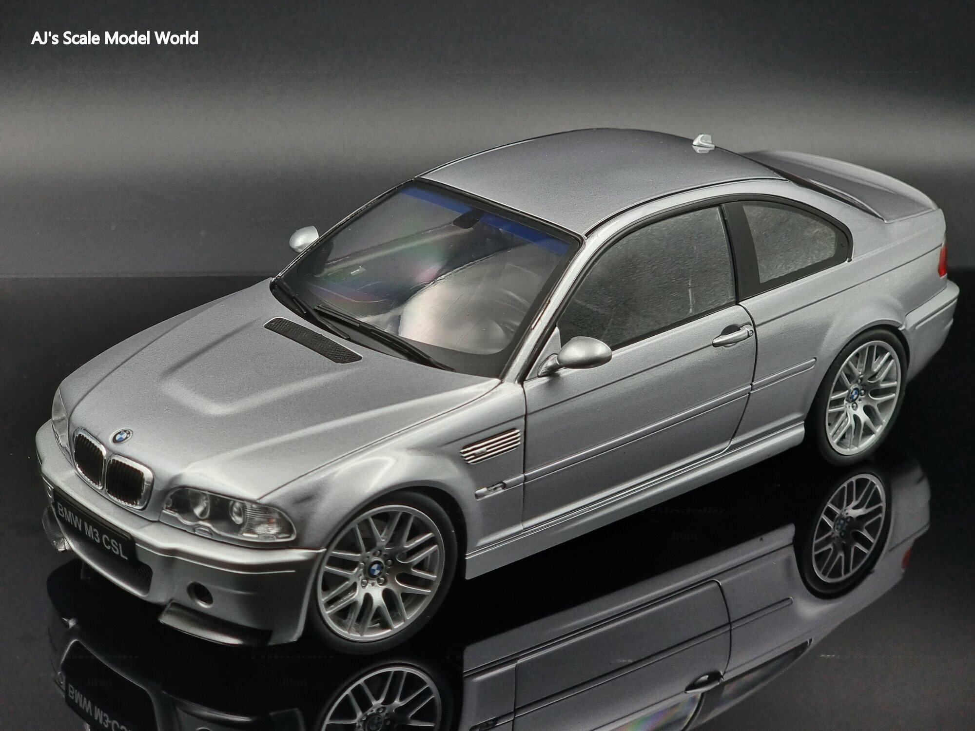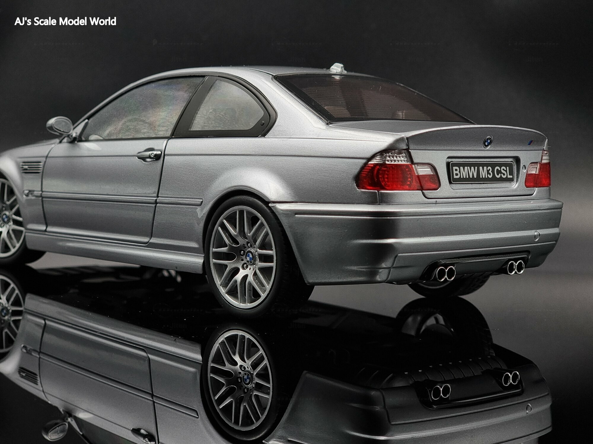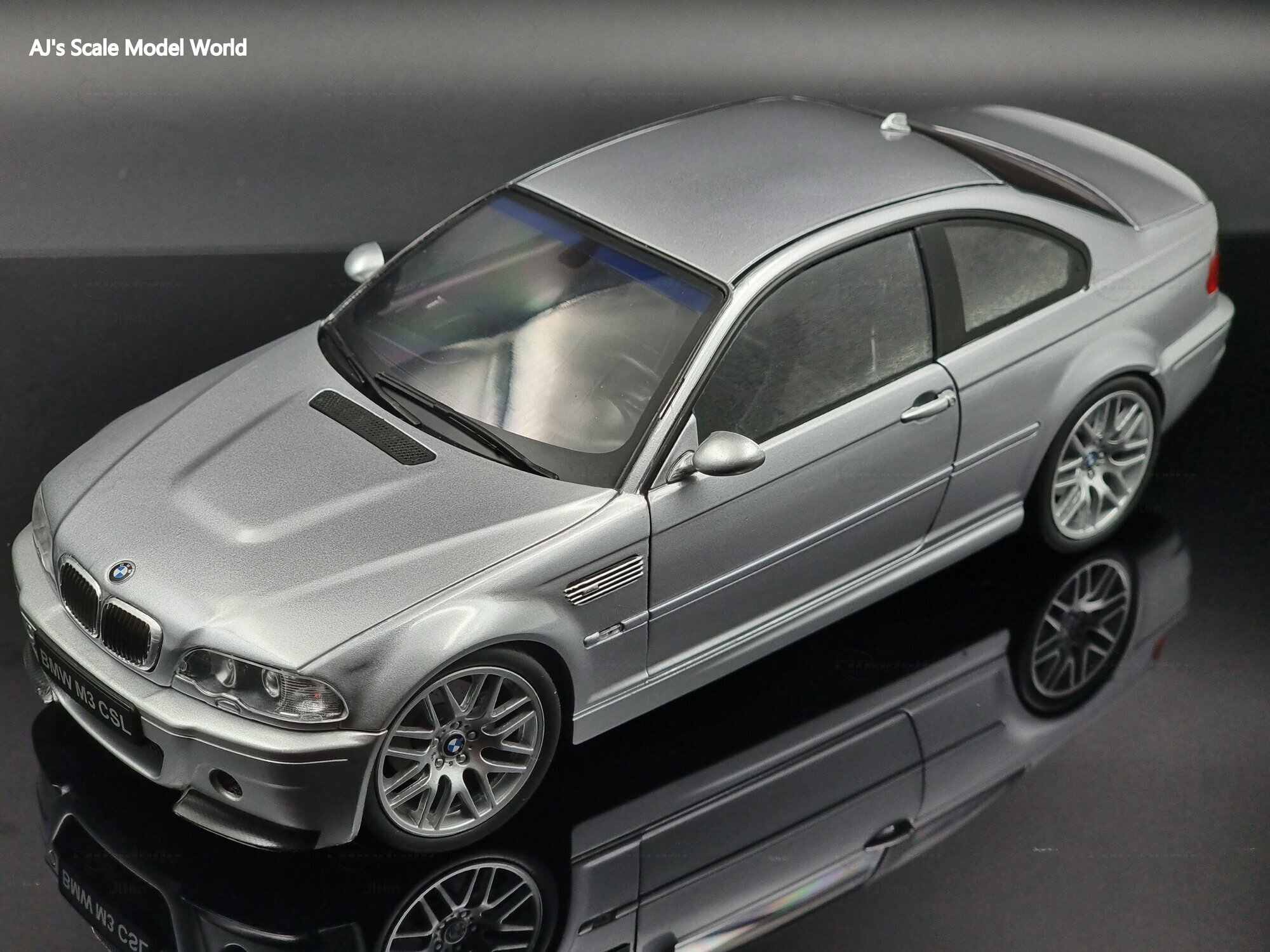 The model car, scaled at 1/18, is based on the iconic BMW M3 (E46), which was produced between 2000 and 2006. This specific model represents the BMW M3 CSL, a particularly powerful and rare version of the M3. The abbreviation CSL stands for "Coupe Sport Lightweight", already hinting at the lightweight construction and sporty ambitions of this car. The CSL sacrifices comfort features to save weight and enhance performance. Engineers at BMW used innovative materials like carbon fiber and Alcantara to achieve a curb weight of just 1385 kilograms (3053 pounds). These measures helped the BMW M3 (E46) achieve impressive performance figures: the 3.2-liter inline-six engine produces 360 horsepower and accelerates the vehicle from 0 to 62 mph in just 4.9 seconds.