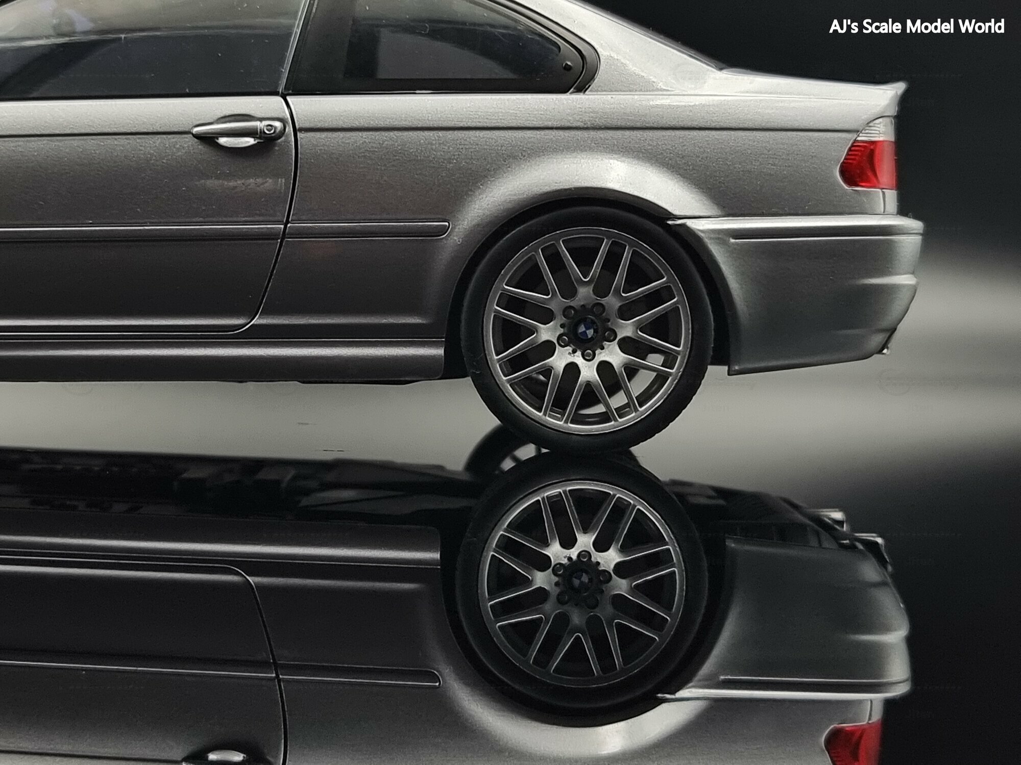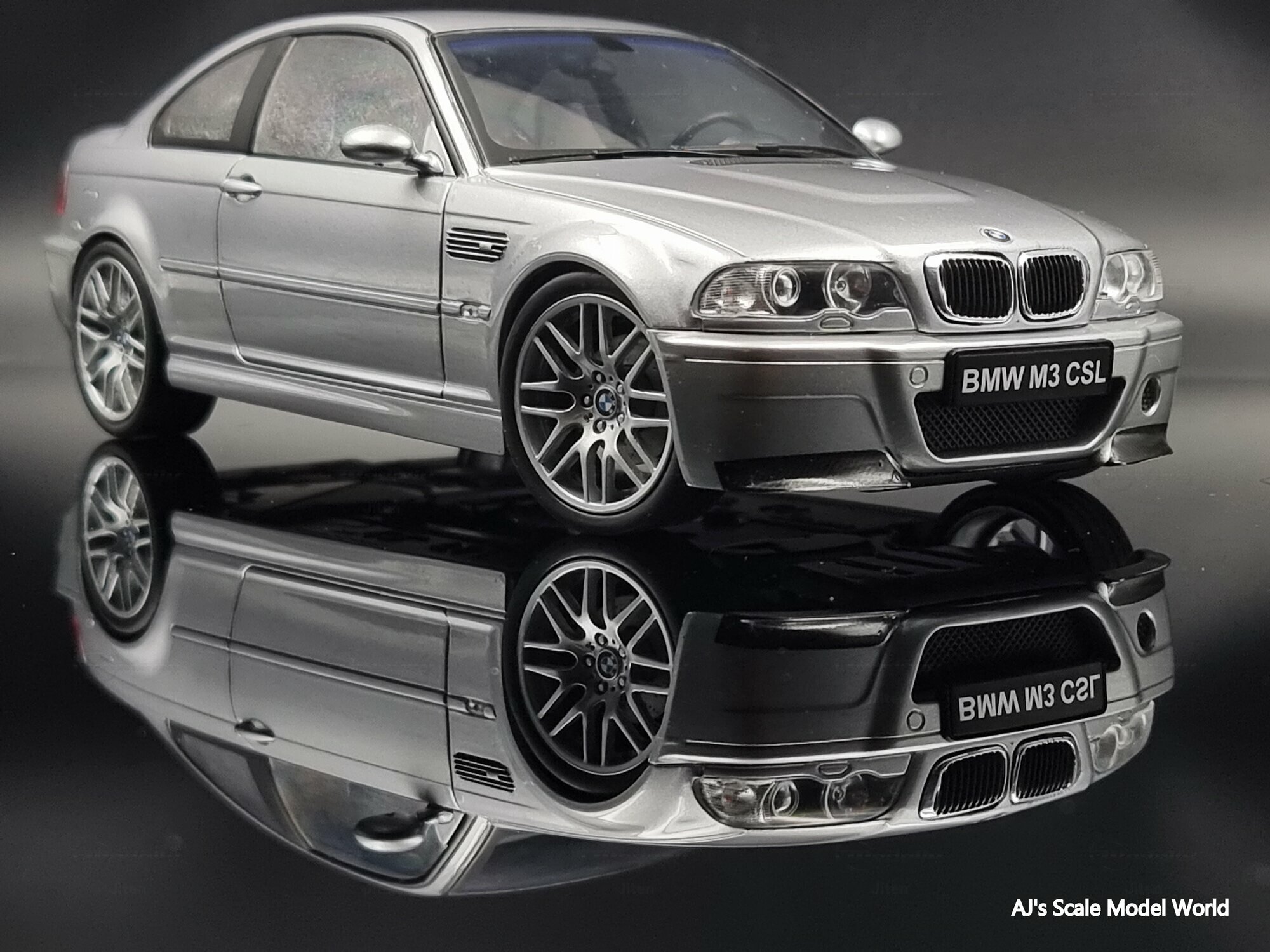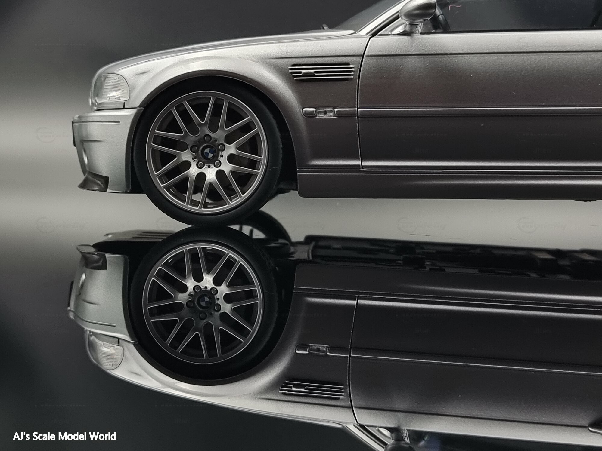 The model car, scaled at 1/18, is based on the iconic BMW M3 (E46), which was produced between 2000 and 2006. This specific model represents the BMW M3 CSL, a particularly powerful and rare version of the M3. The abbreviation CSL stands for "Coupe Sport Lightweight", already hinting at the lightweight construction and sporty ambitions of this car. The CSL sacrifices comfort features to save weight and enhance performance. Engineers at BMW used innovative materials like carbon fiber and Alcantara to achieve a curb weight of just 1385 kilograms (3053 pounds). These measures helped the BMW M3 (E46) achieve impressive performance figures: the 3.2-liter inline-six engine produces 360 horsepower and accelerates the vehicle from 0 to 62 mph in just 4.9 seconds.