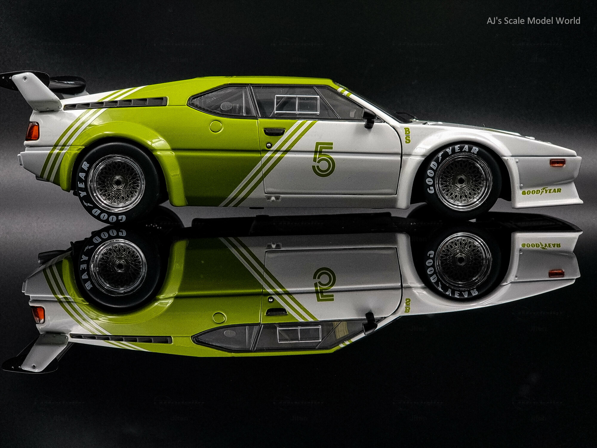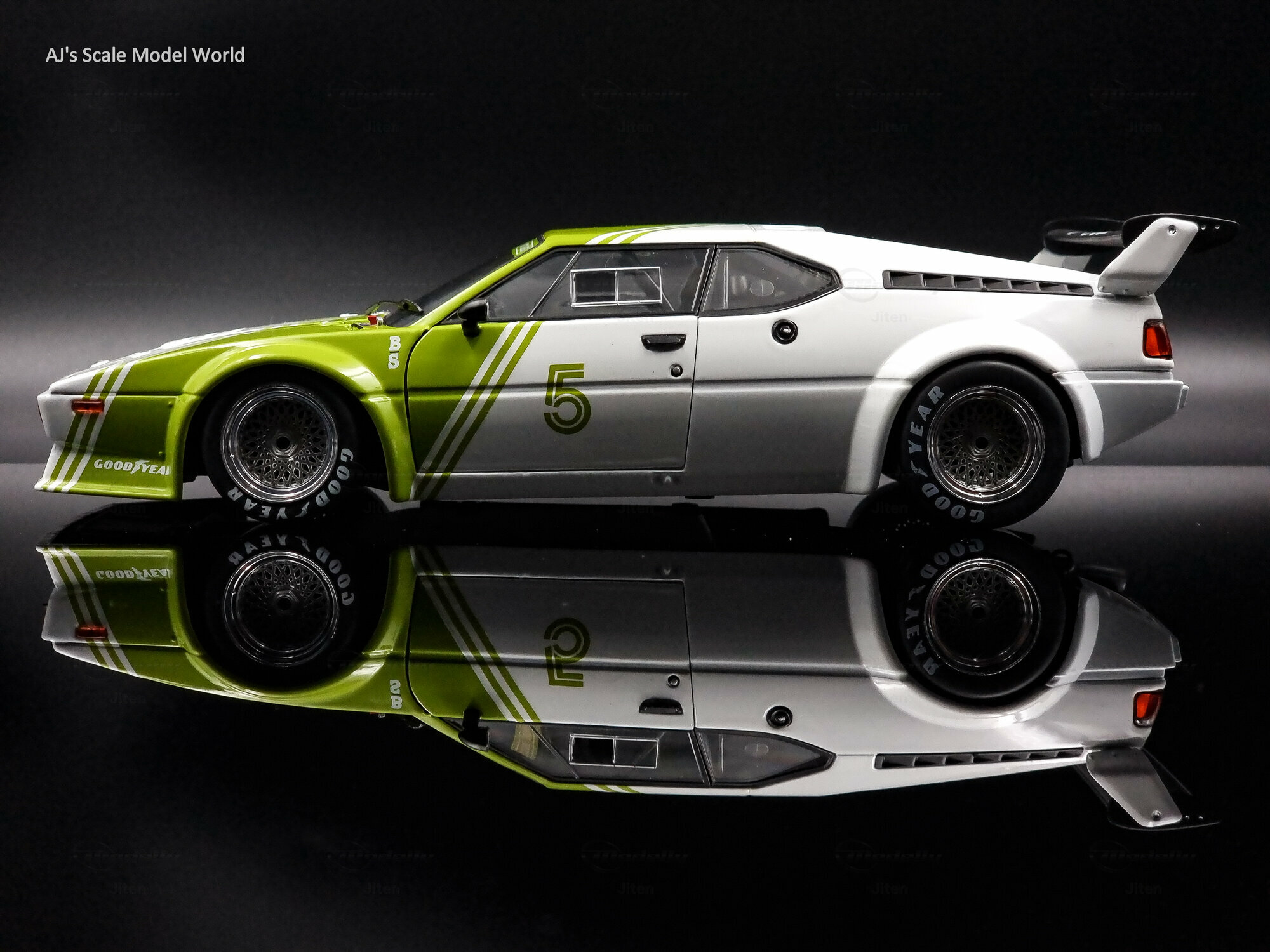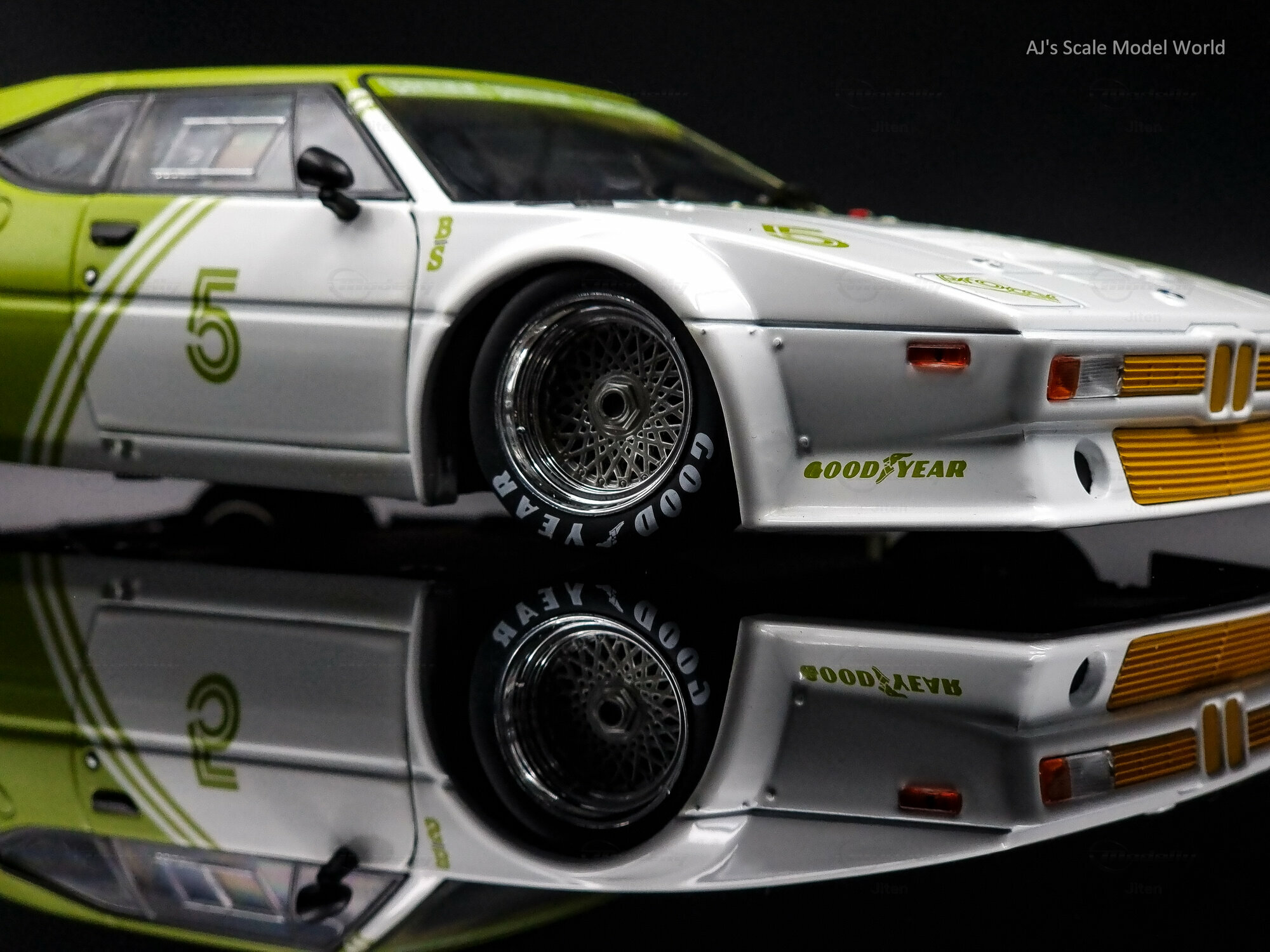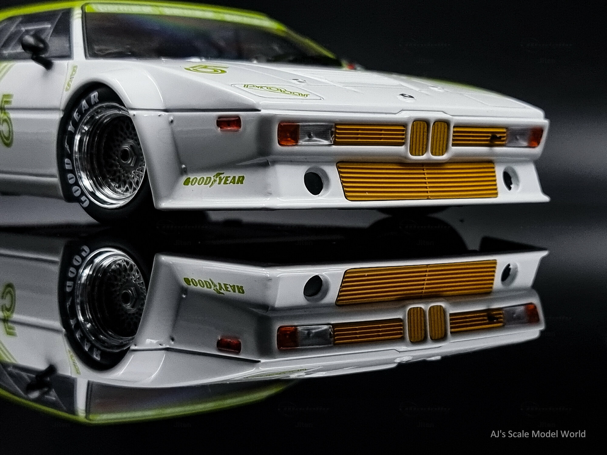 The showcased model, crafted by Werk83, is a detailed replica of the iconic BMW Motorsport M1 in a 1/18 scale. Made from Diecast material, this model impresses with its precise craftsmanship and accurate details. The model's paintwork displays a two-tone combination of white and green, adorned with dynamic stripes and the number 5. Sponsor logos like Goodyear are clearly visible, adding to the authentic racing scene. The miniature, owned by Modellly member "Jiten," is a perfect example of the high craftsmanship and dedication that go into creating collector's models in the 1/18 scale by Werk83.