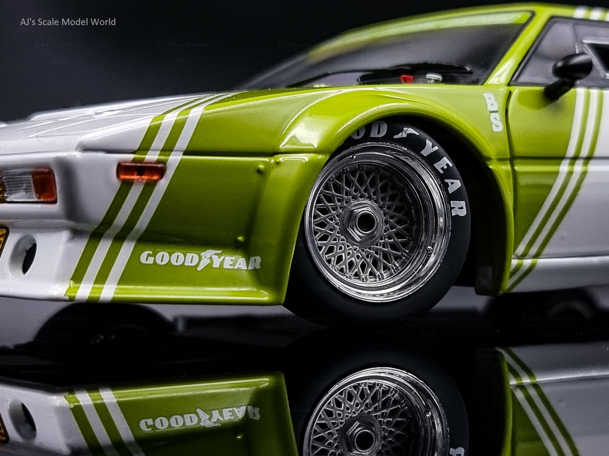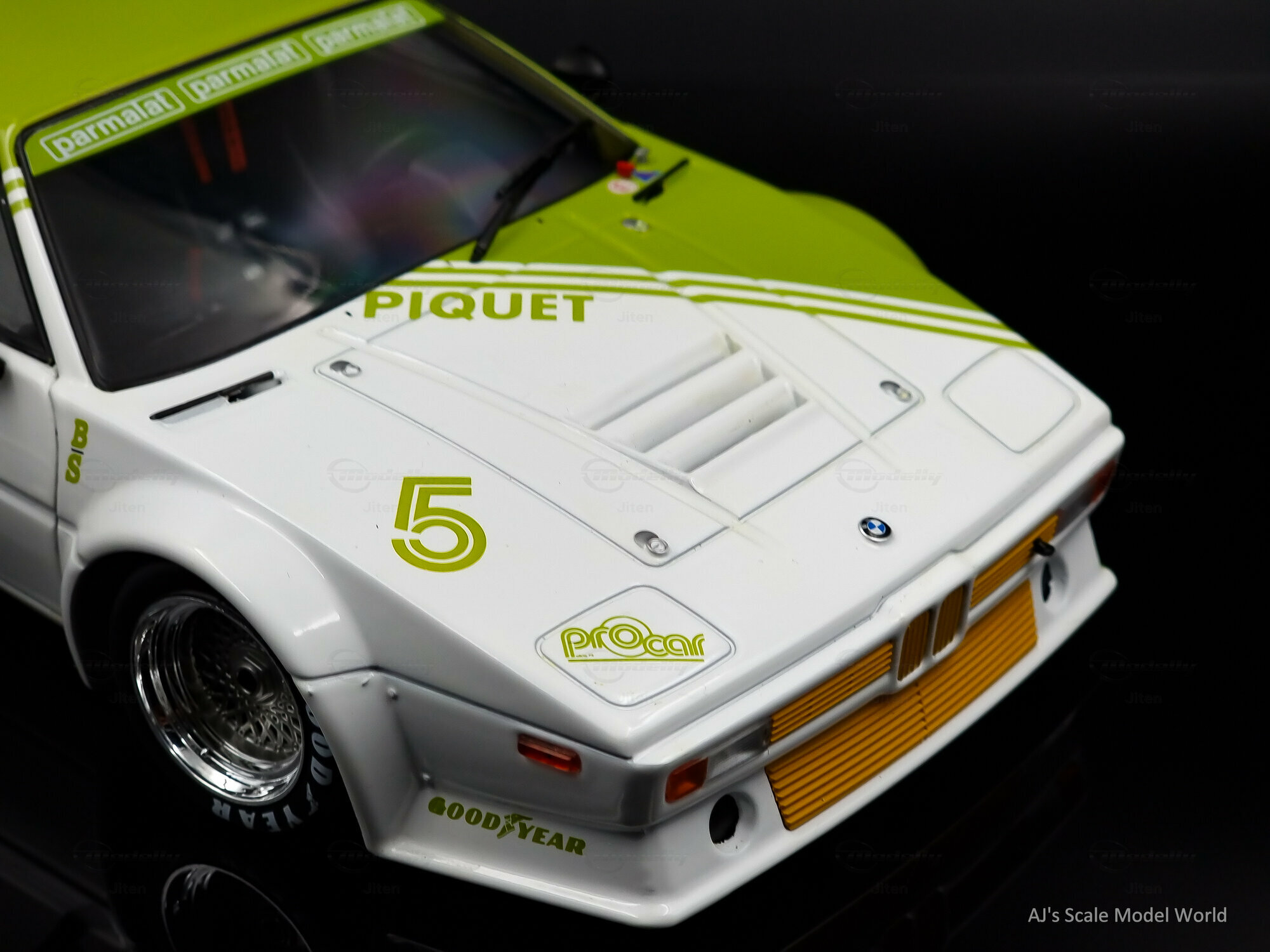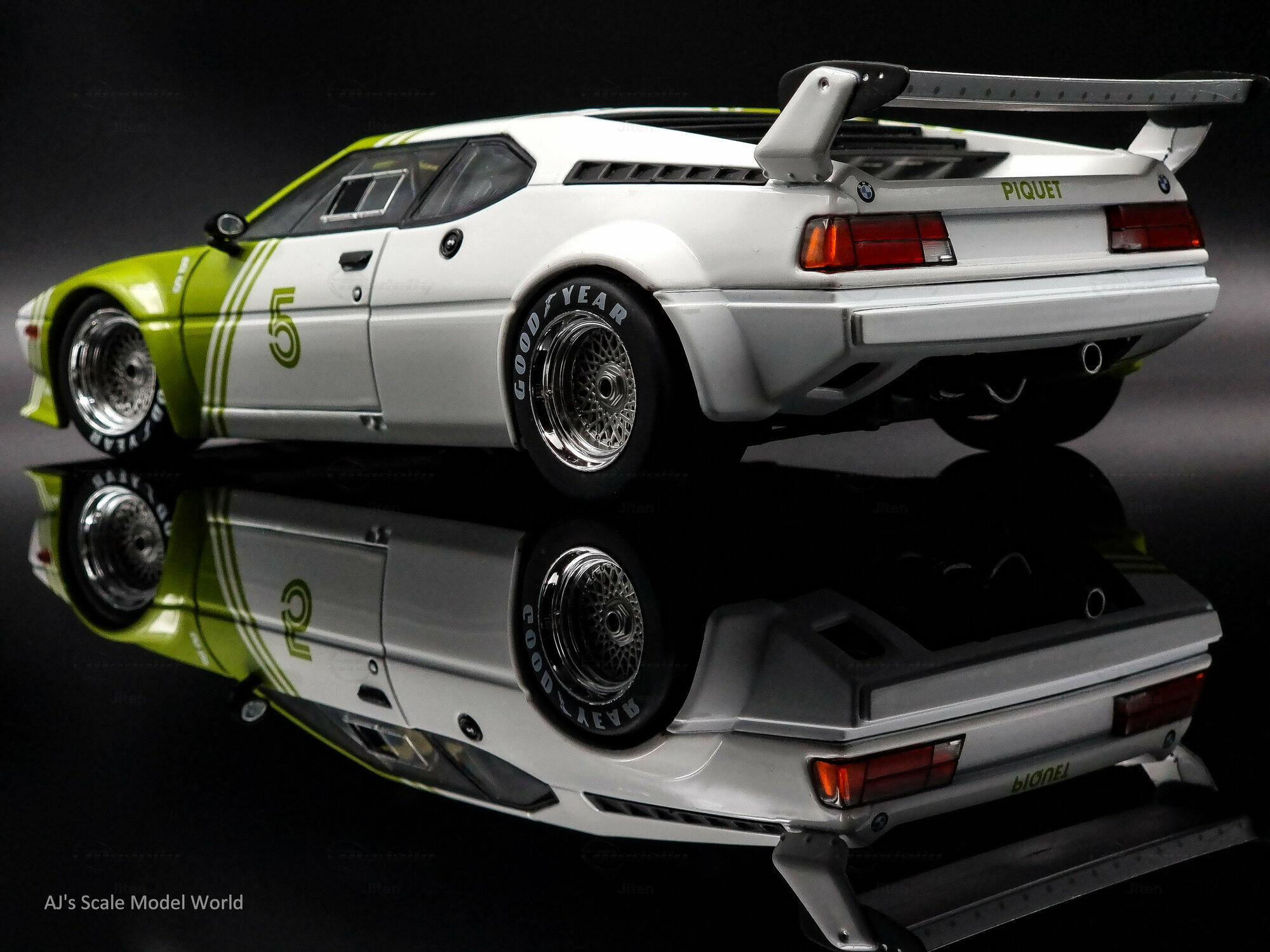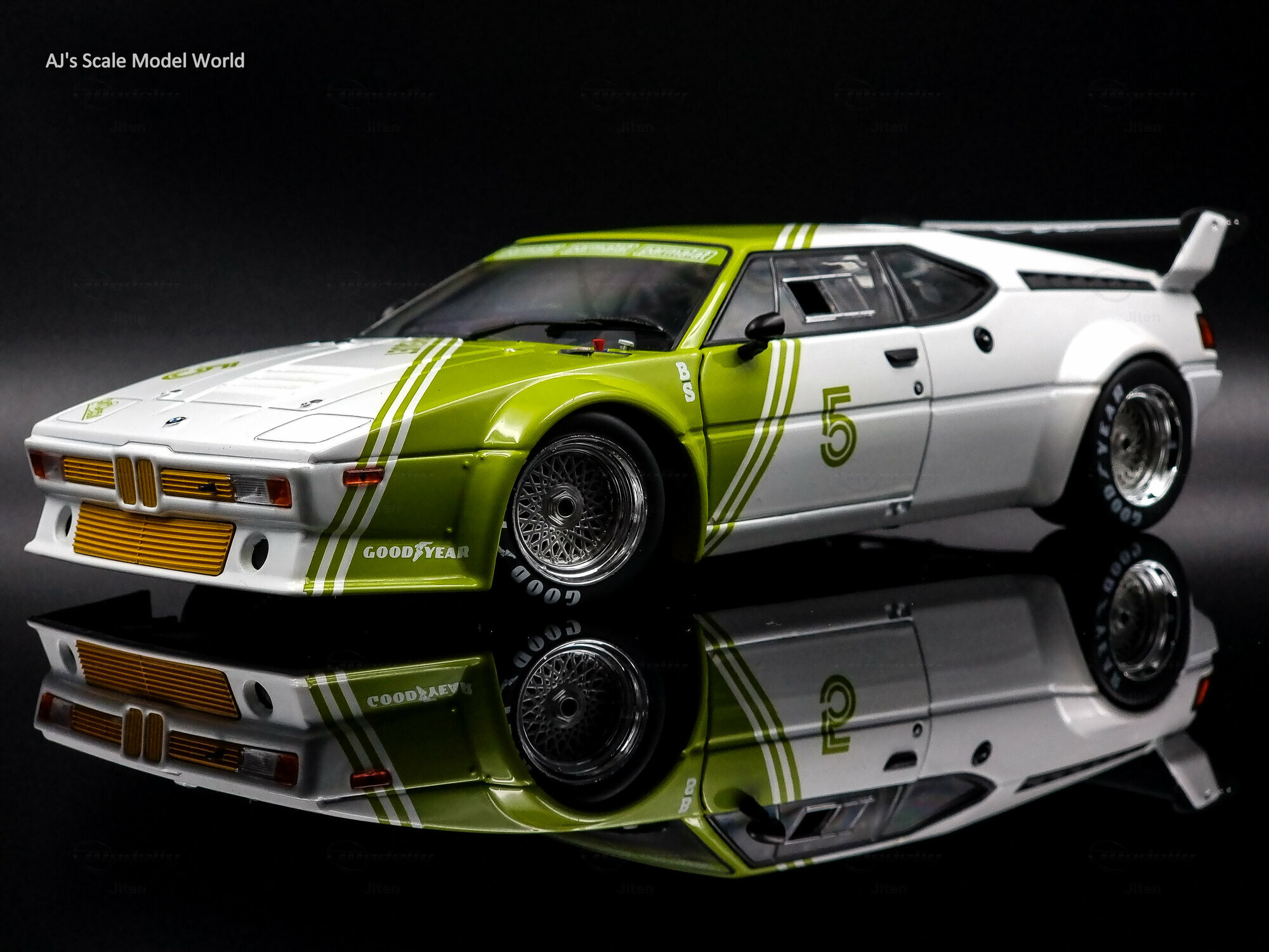 The showcased model, crafted by Werk83, is a detailed replica of the iconic BMW Motorsport M1 in a 1/18 scale. Made from Diecast material, this model impresses with its precise craftsmanship and accurate details. The model's paintwork displays a two-tone combination of white and green, adorned with dynamic stripes and the number 5. Sponsor logos like Goodyear are clearly visible, adding to the authentic racing scene. The miniature, owned by Modellly member "Jiten," is a perfect example of the high craftsmanship and dedication that go into creating collector's models in the 1/18 scale by Werk83.
