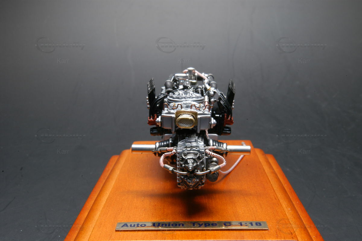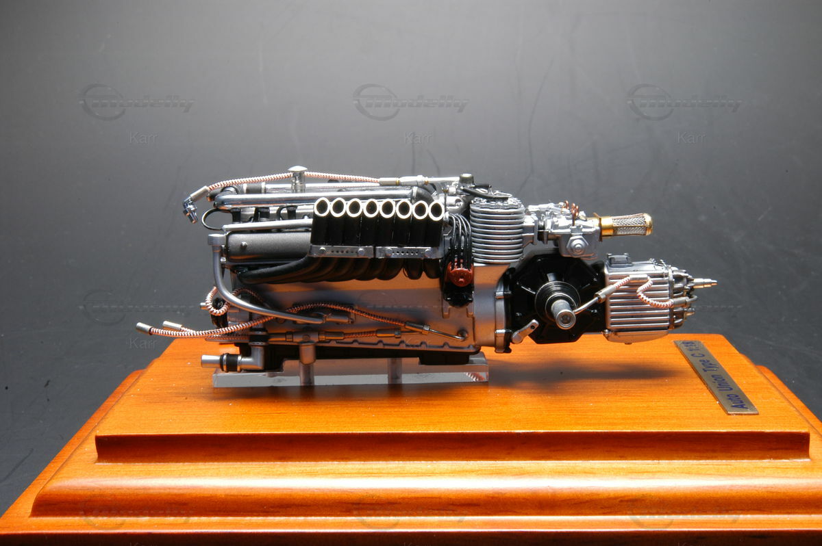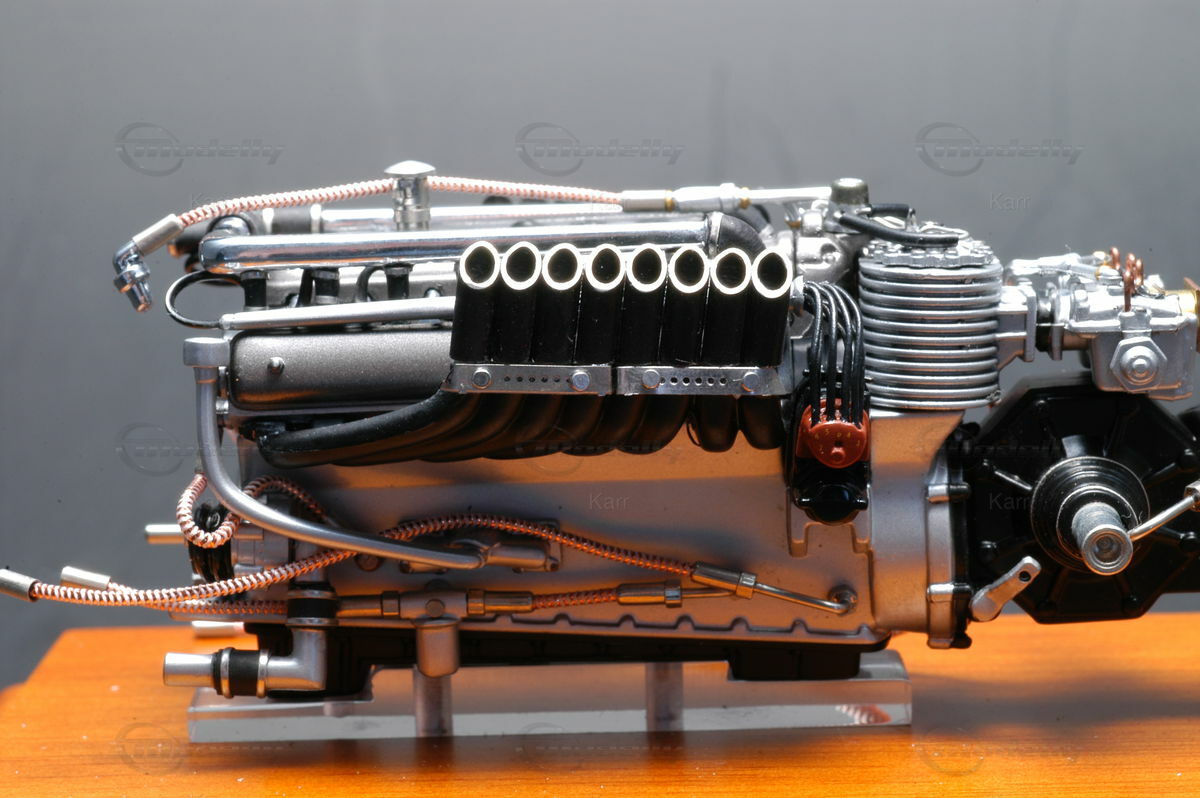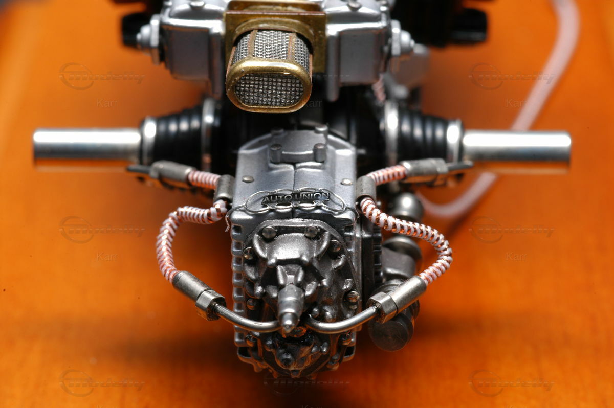 The model of the Auto Union 16 Cylinder Engine captivates with its lifelike colors and shapes. The silver coating on the metal parts combined with the black and copper accents gives it an authentic look. The intricate details such as the small screws, nuts, and wiring are replicated exactly based on the original constructions. Collector "Karr" has integrated this model into their collection, standing out for the quality of replication and attention to detail. The silver tubes of the exhaust system and the gold cover on the engine housing are standout elements that make the model special.