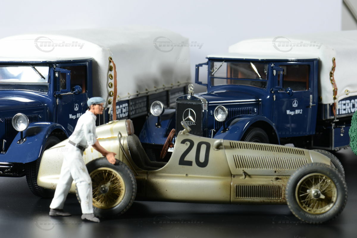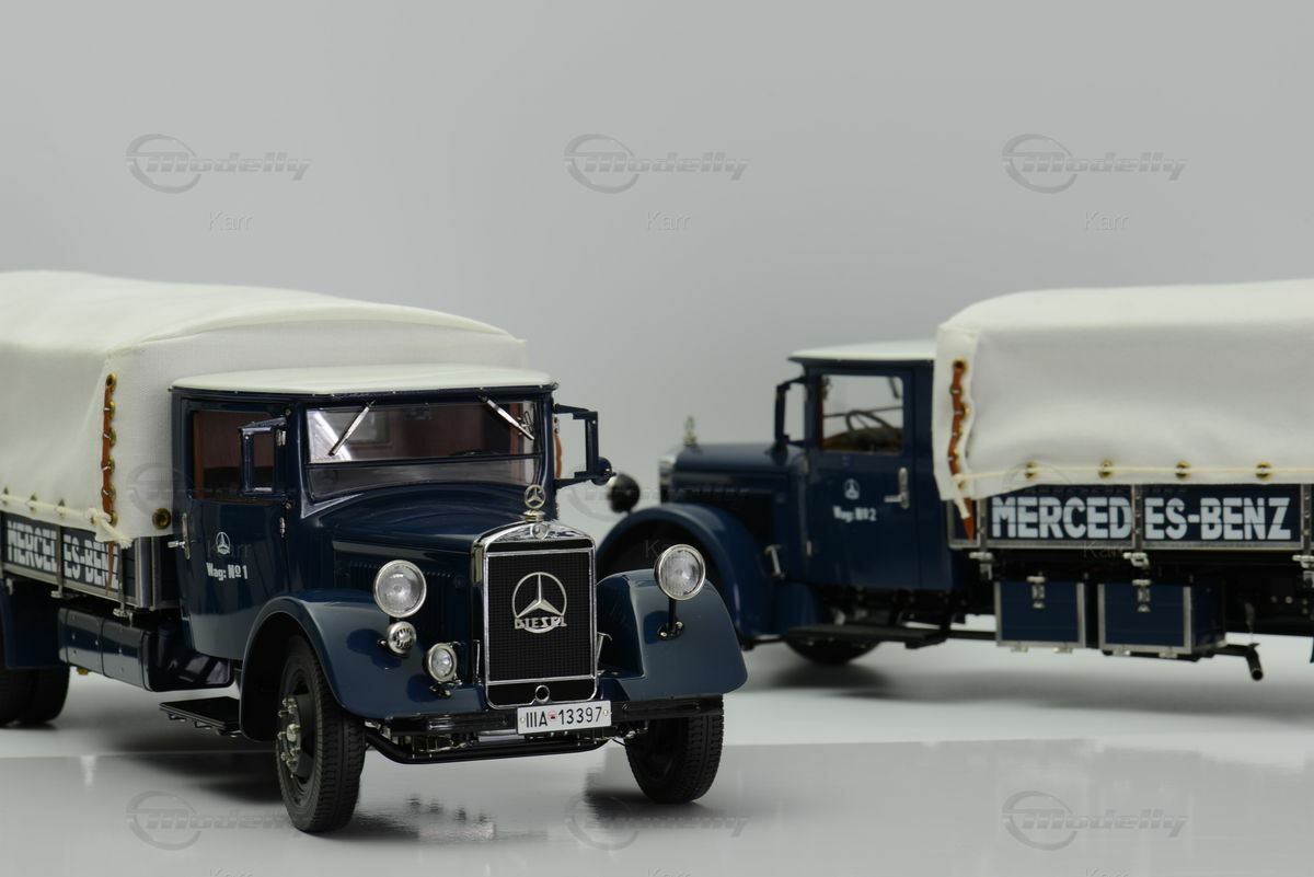 The miniature depicts the Mercedes-Benz Mercedes LO 2750 in a classic paintwork typical of that era. The deep blue color of the chassis and body is complemented by a cream white canvas top, providing a contrast and a harmonious overall appearance. The white canvas hood with golden fastenings highlights the simplicity and functionality of the design. The Mercedes logo is prominently displayed on the radiator grille, and the "Mercedes-Benz" lettering on the sides of the canvas completes the elegant look. Additionally, there are no obvious sponsorship emblems on the model, indicating the original factory paintwork.