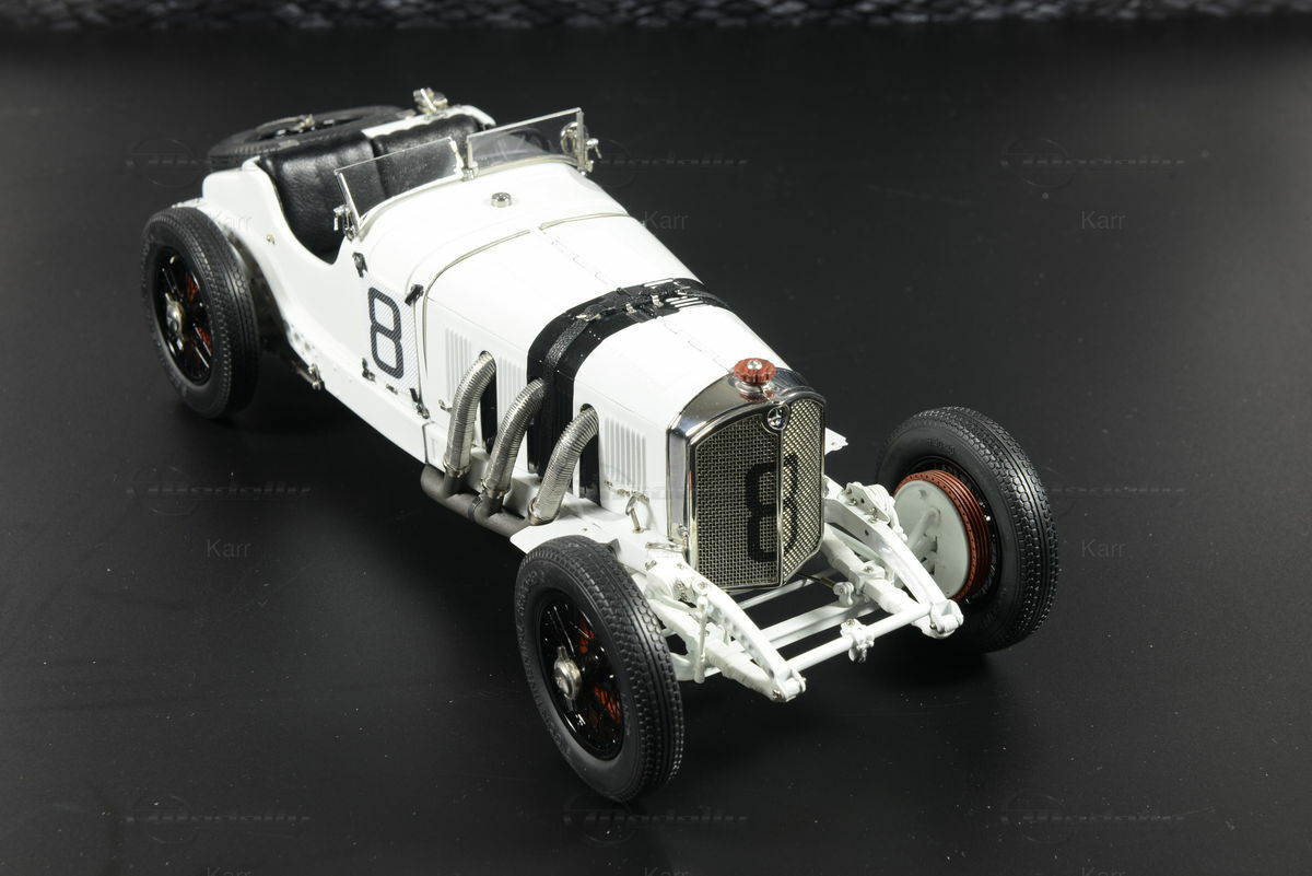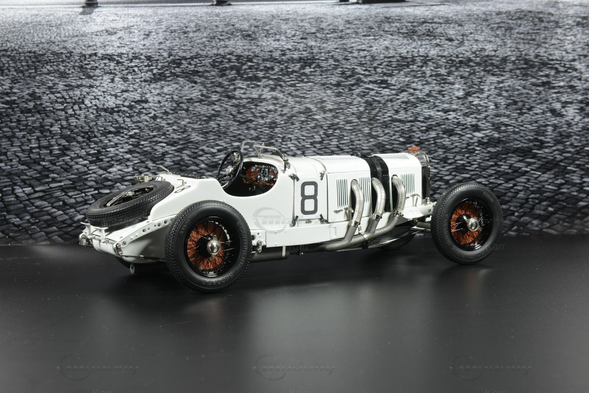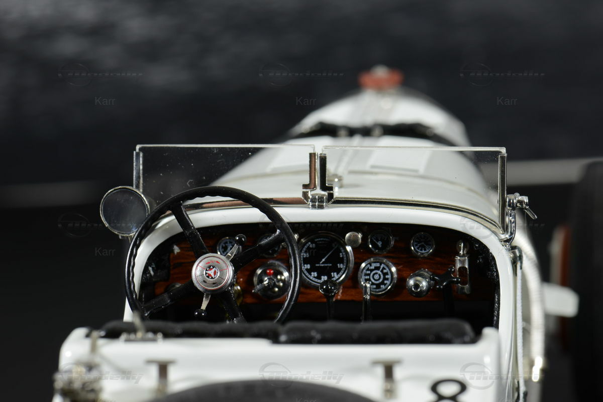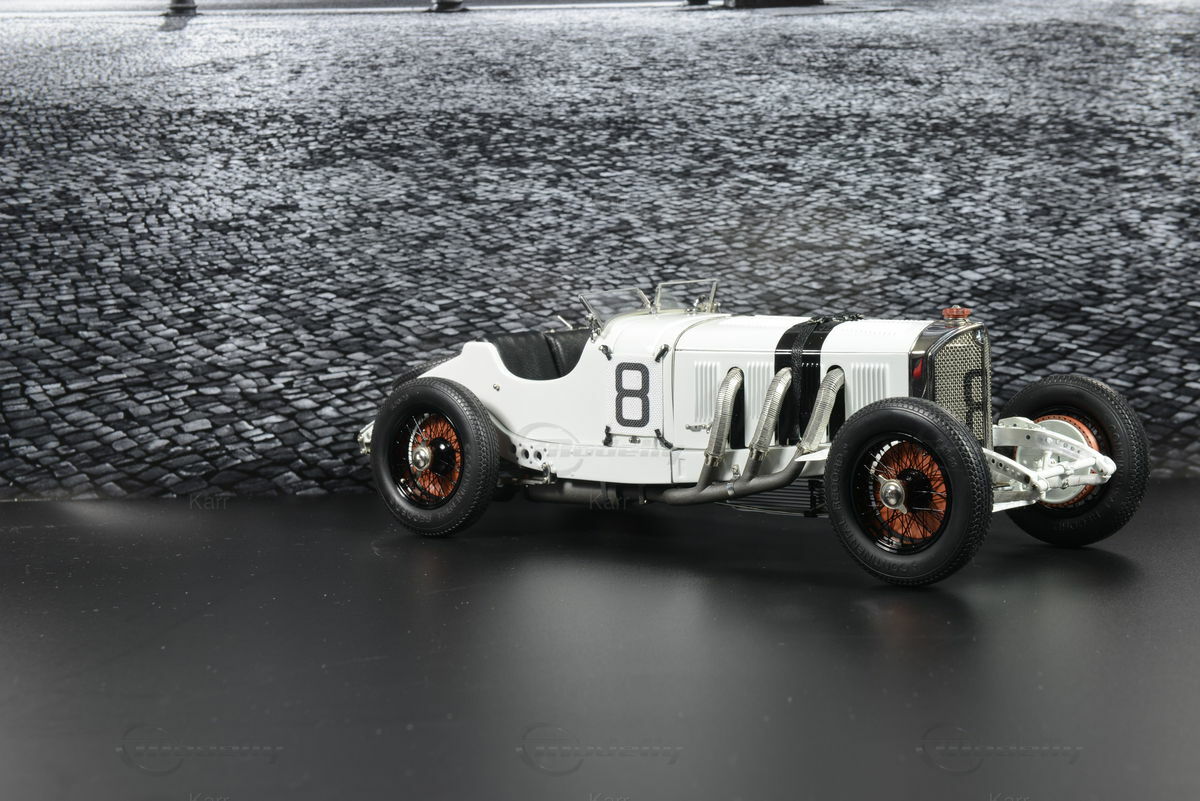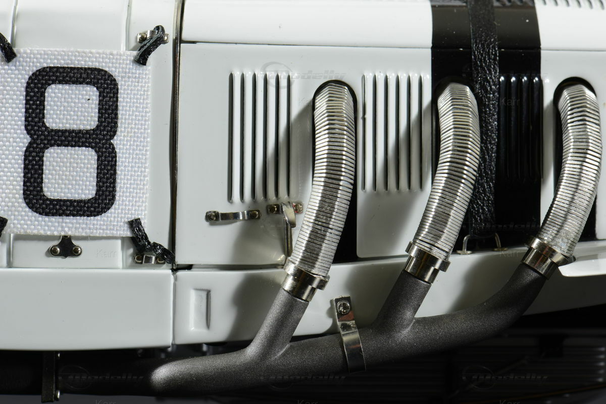 This faithfully recreated 1/18 scale model of the Mercedes-Benz SSKL was crafted by CMC, a renowned manufacturer of model cars. The miniature is a precise replica, showcasing with impressive attention to detail the distinct features of the original. Made from high-quality diecast material, giving it durability and accuracy in detail. Every aspect, from the paintwork to the sponsor decals, is meticulously reproduced. The car from Modelly member "Karr" displays the striking white livery with the number "8" and the typical racing stripes that made the SSKL so recognizable in the racing scene. The intricately designed wheels and the precise portrayal of the engine are impressive.