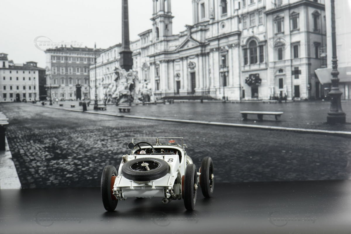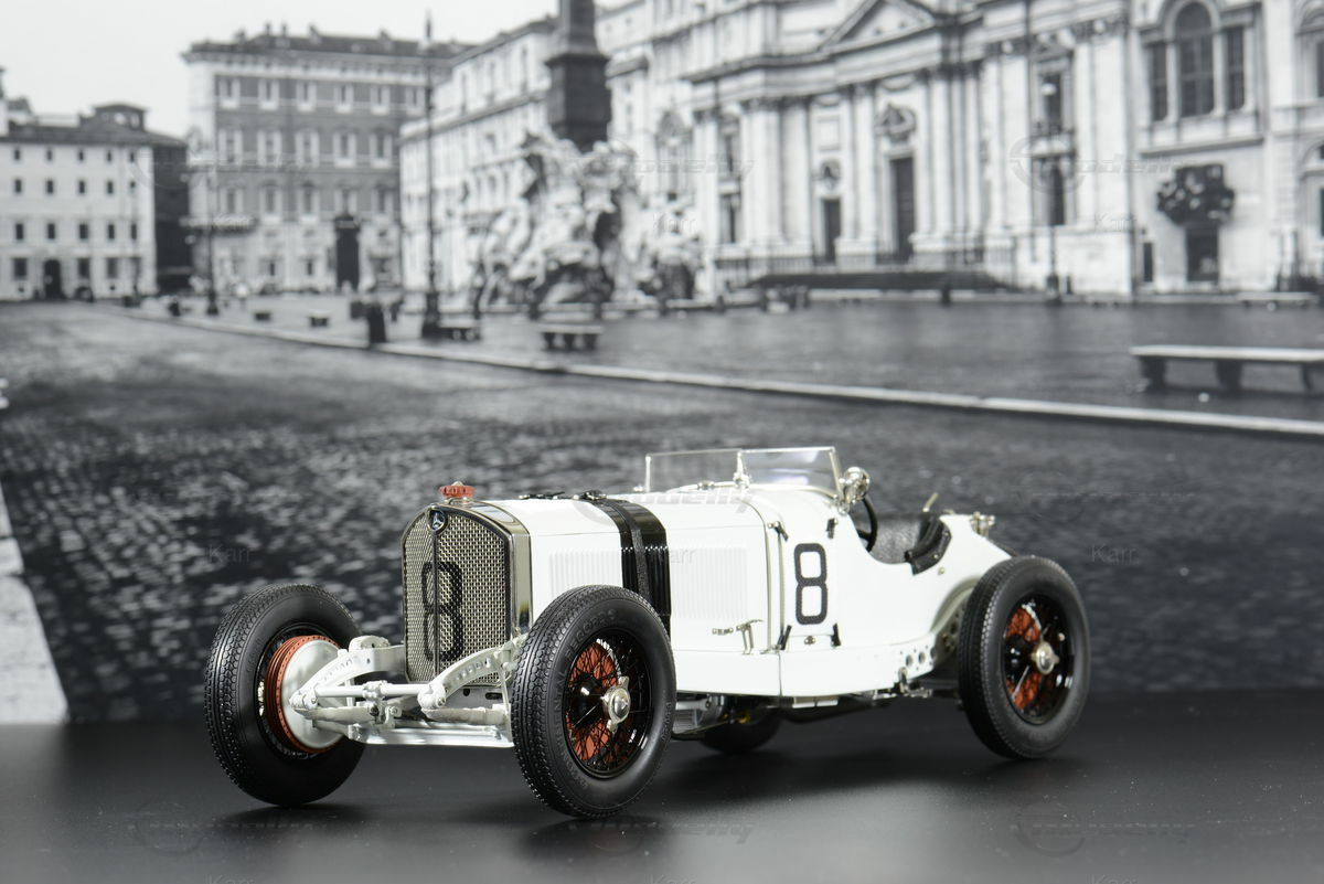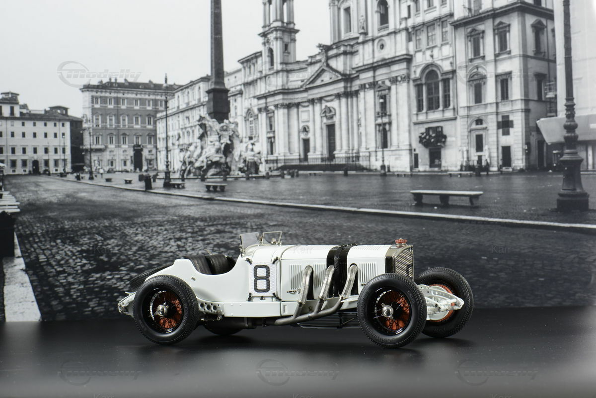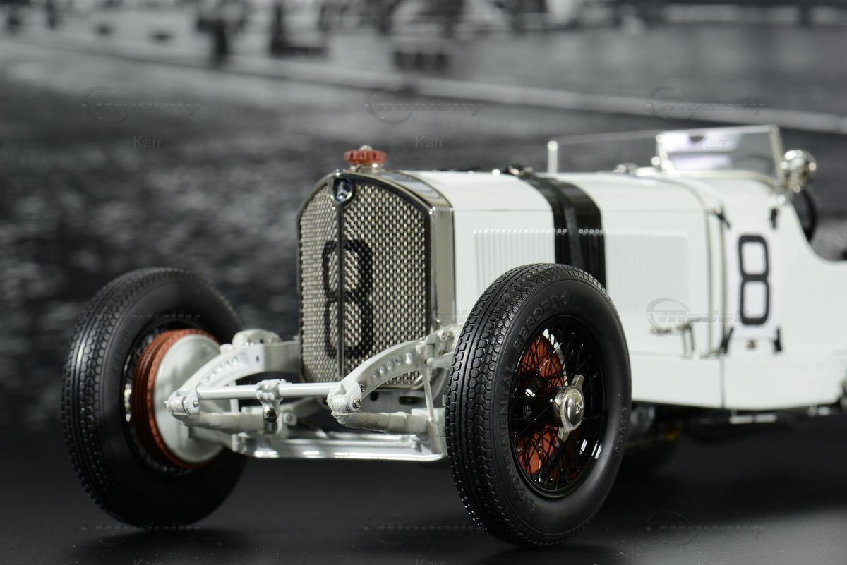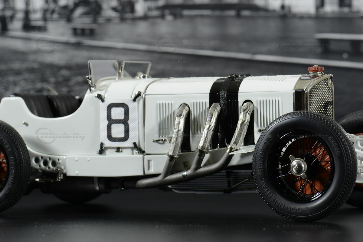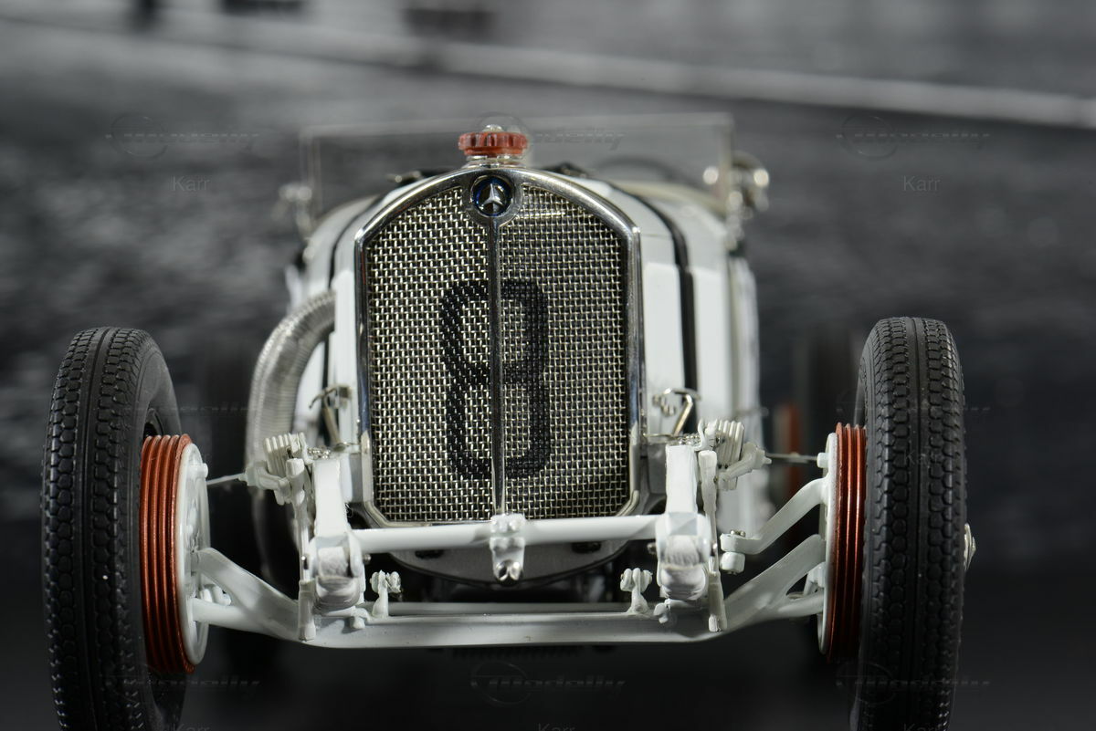 This faithfully recreated 1/18 scale model of the Mercedes-Benz SSKL was crafted by CMC, a renowned manufacturer of model cars. The miniature is a precise replica, showcasing with impressive attention to detail the distinct features of the original. Made from high-quality diecast material, giving it durability and accuracy in detail. Every aspect, from the paintwork to the sponsor decals, is meticulously reproduced. The car from Modelly member "Karr" displays the striking white livery with the number "8" and the typical racing stripes that made the SSKL so recognizable in the racing scene. The intricately designed wheels and the precise portrayal of the engine are impressive.