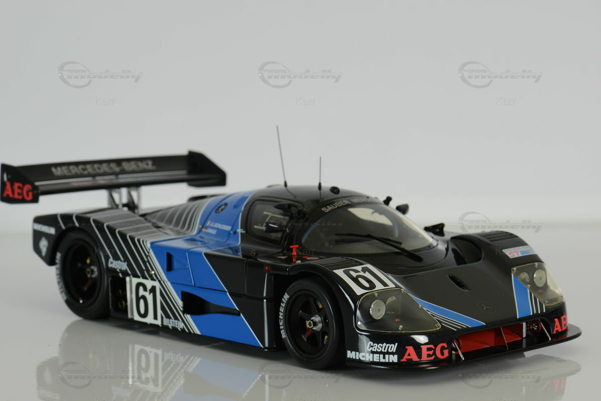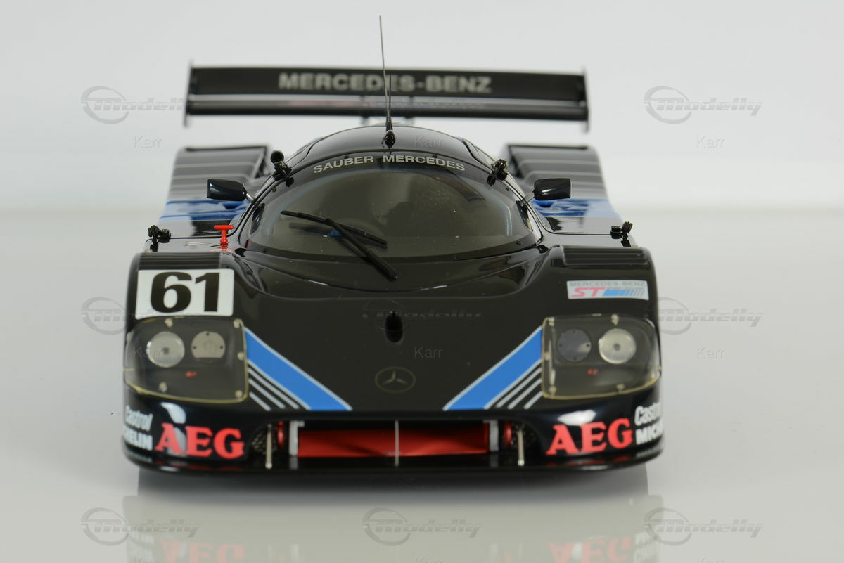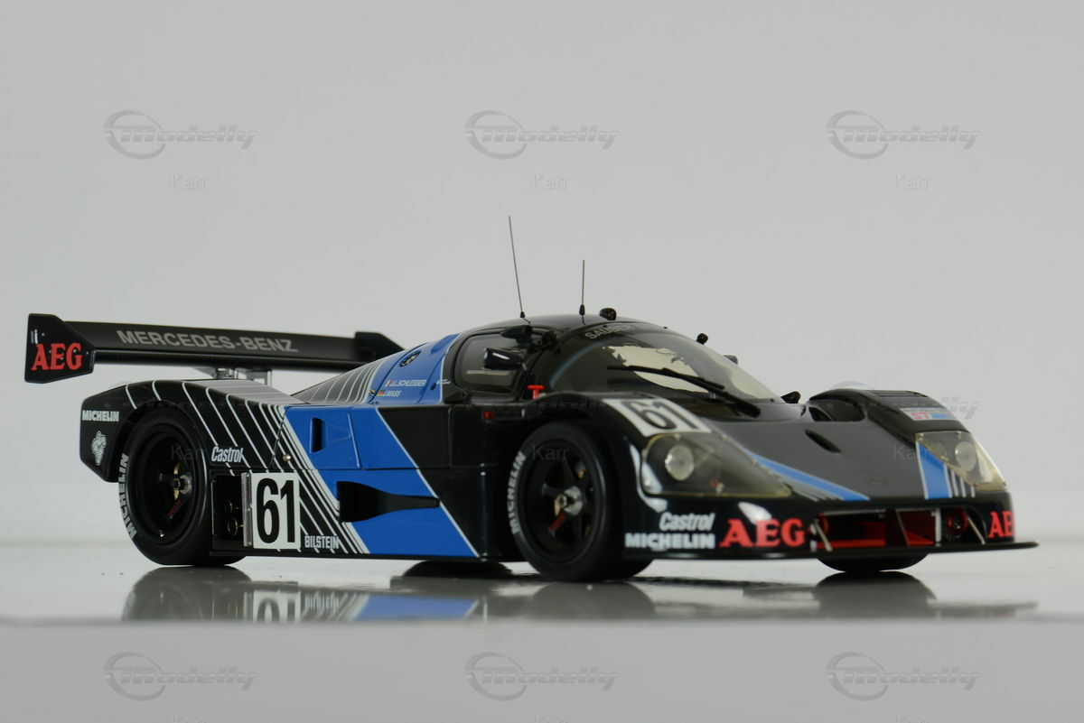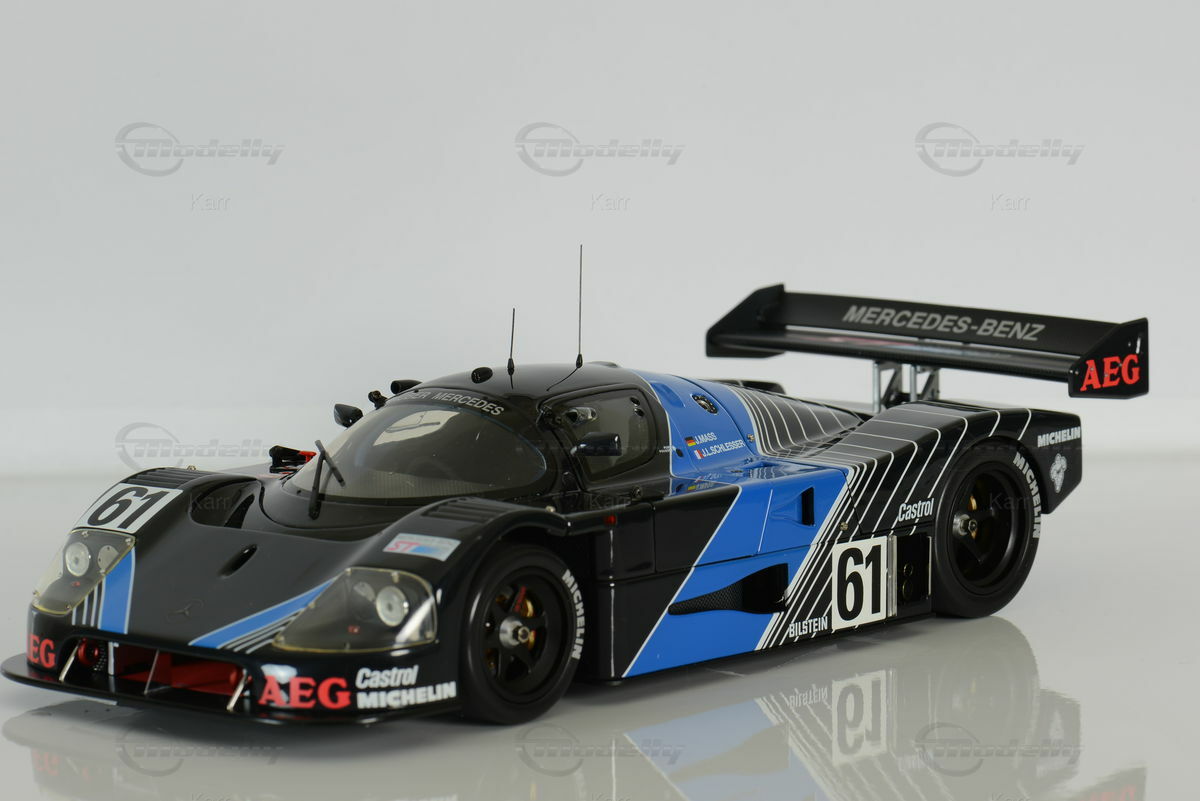 The paint scheme of the miniature model mirrors that of the original: The main body is black, with blue stripes and detailed sponsor logos adorning the car. The Mercedes-Benz emblem is prominently displayed on the front area, while the rear spoiler carries not only aerodynamic elements but also additional markings from AEG and Michelin. The antennas, air vents, and side panels are made and assembled with meticulous care, making the model a true collector's item. All visible details, such as the number 61 and the fine stripes, are perfectly scaled and positioned.