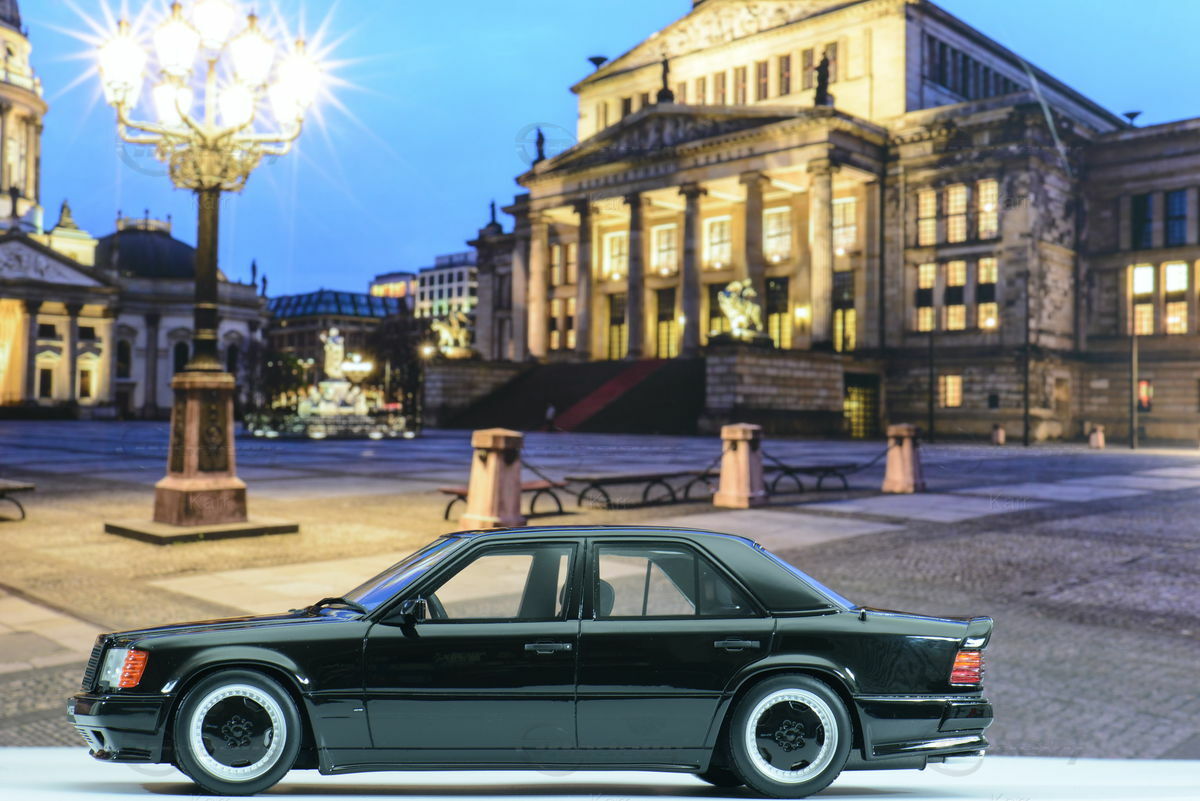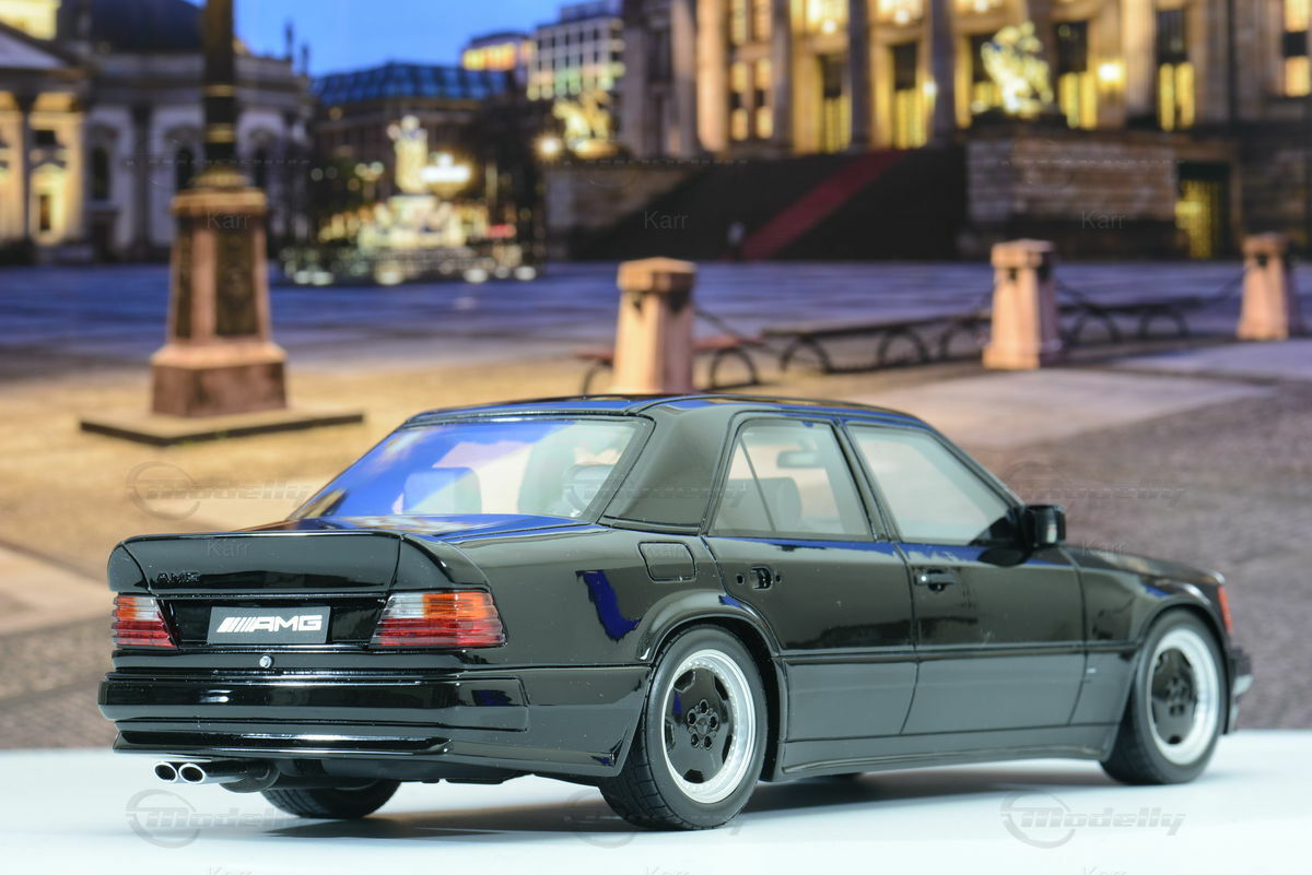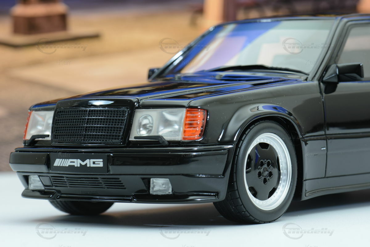 This 1/18 scale model car, manufactured by Ottomobile, is a detailed replica of the Mercedes-Benz 300 E 5.6 based on resin material known for its precision and finesse in model making. The colors of the model are a deep, glossy black that stays true to the original, highlighting its luxurious character. Standout features include the AMG emblems and the distinctive "AMG" lettering on the grille. The model's wheels are faithful reproductions of the Penta wheels made by Rial. These models are excellent for precision enthusiasts and collectors, offering an accurate glimpse into automotive history.