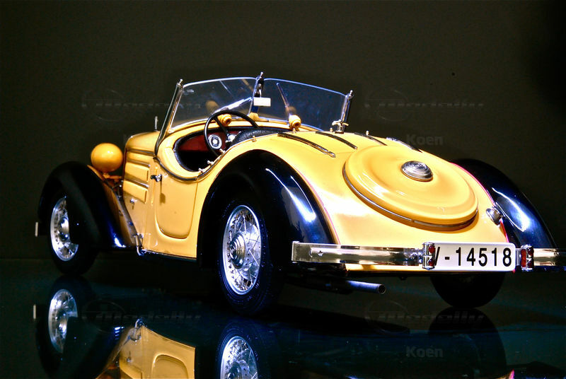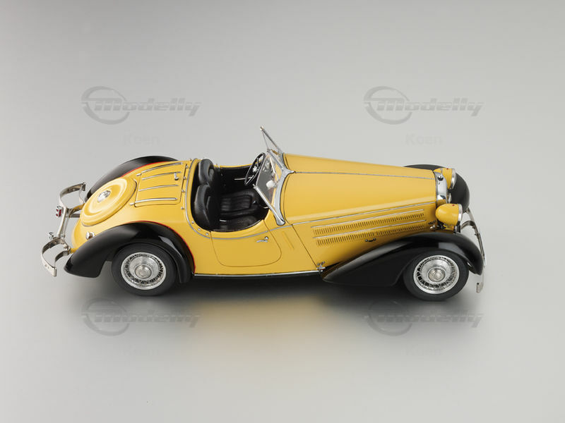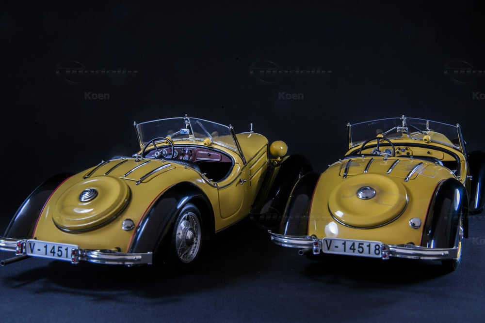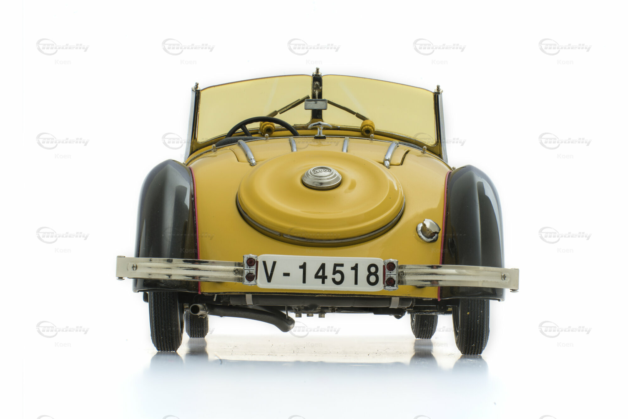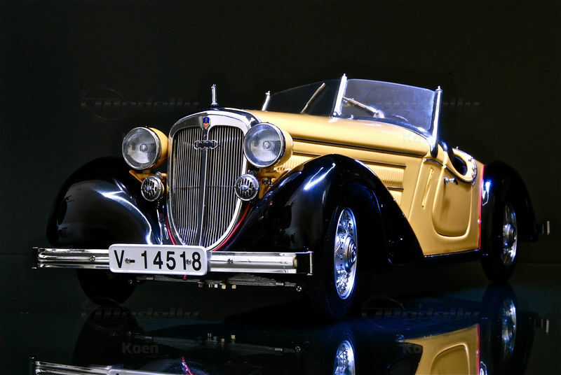 Koen's model car, a part of the Modelly collection, is an extremely detailed replica of the second-generation Audi Front 225 Roadster. Typical features like the spare tire mount at the rear and the stylized bodywork mirror the real-life details and are a delight for collectors. This Roadster, built within a few years, is equally popular among collectors and car enthusiasts, showcasing accurately crafted seats, an authentic dashboard, and many other interior details that are visibly striking. The 1/18 scale model by CMC is renowned for its high-quality craftsmanship, providing collectors with a meticulously replicated icon of the vintage car. Every small component, from the tires to the lamps, is carefully reproduced.