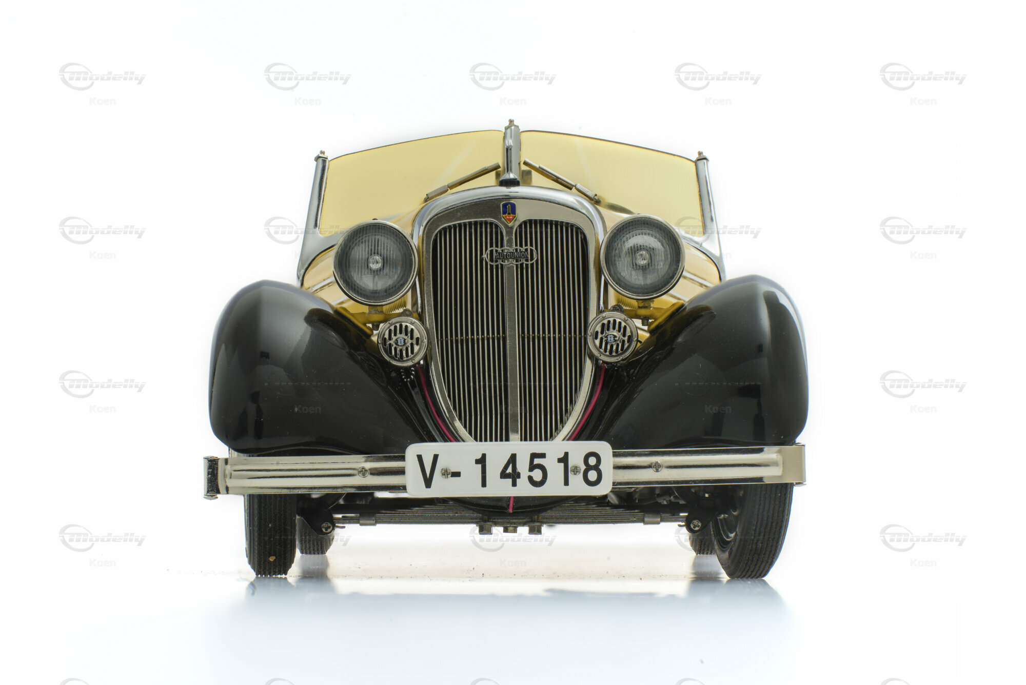 The 1/18 scale model car by CMC showcased here captures the radiant beauty of the original. The quality of craftsmanship is impeccable, with precise and exquisite detailing. Prominent features include the two large round headlights and the magnificent chrome-plated grille adorned with the prominent Audi emblem. The exterior mirrors, bumpers, and the entire bodywork are finished in a glossy two-tone Black and Yellow paint scheme, giving the car an elegant yet striking appearance. The yellow tint on the windshield glass adds to the model's charisma.