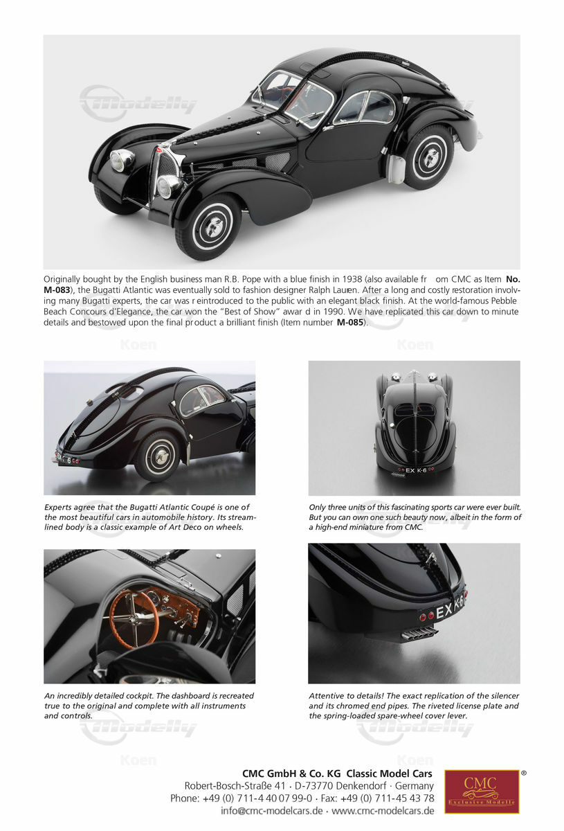 Bugatti, welch ein geschichtsträchtiger Name! "Le Patron" lässt grüßen. Automobilbau als Kunstform... so könnte die Überschrift lauten, wenn vom Bugatti Atlantic die Rede ist. Der Atlantic kann eindeutig Bugatti's Sohn zugesprochen werden, dessen aussergewöhnlichen designerischen Fähigkeiten ihn in die Lage versetzten diese geniale und bis heute einzigartige Karosserieform des Atlantic zu entwerfen und darstellen zu lassen.
