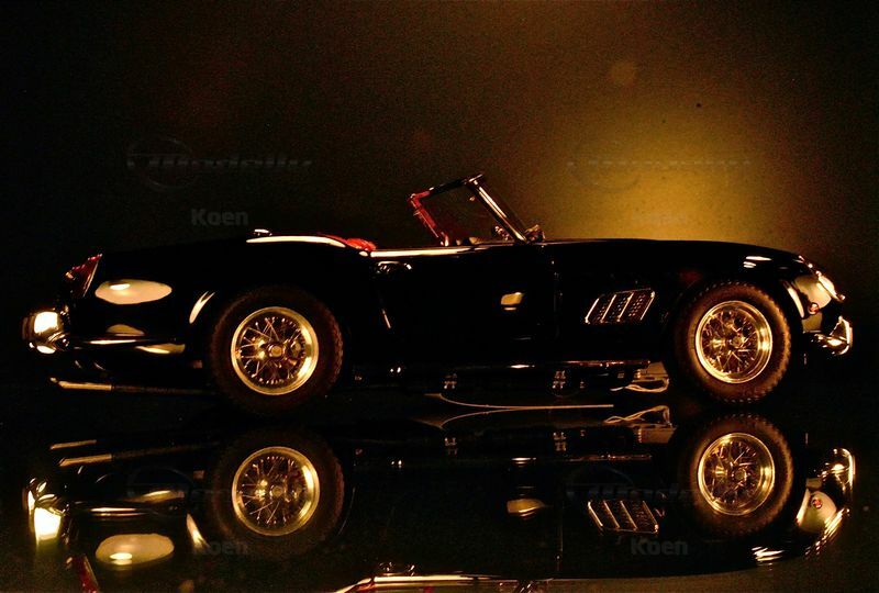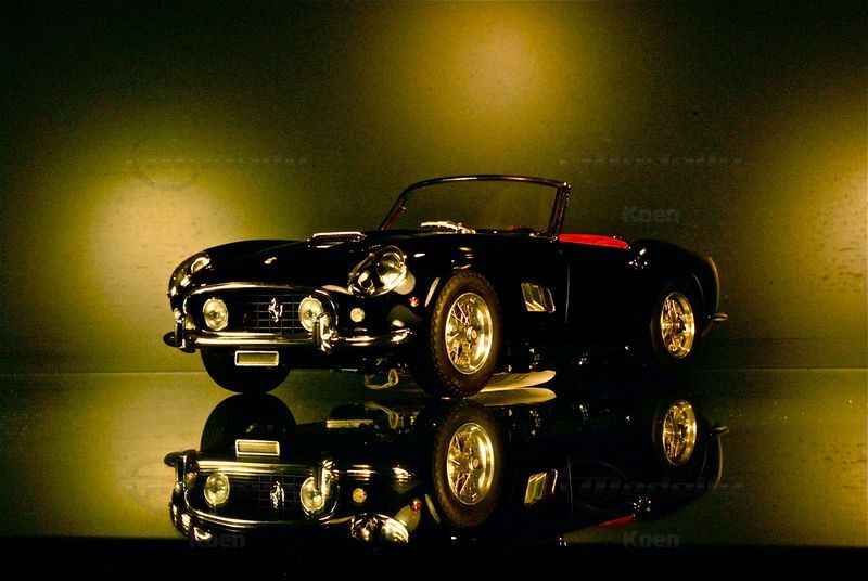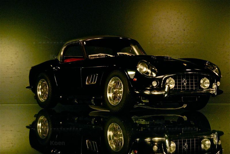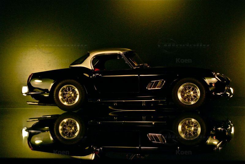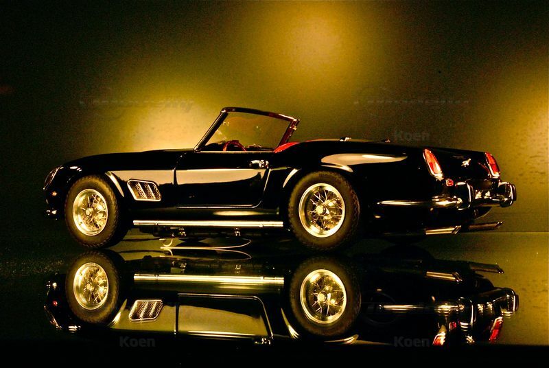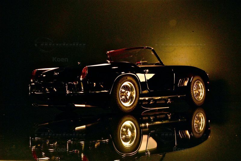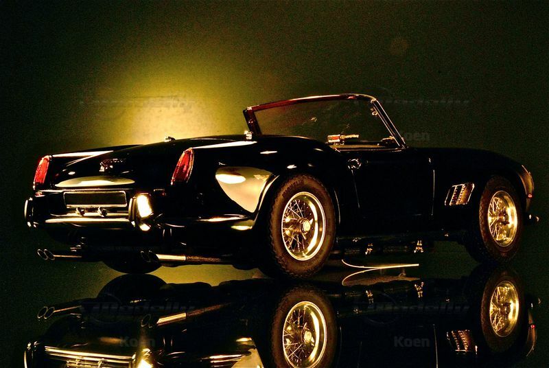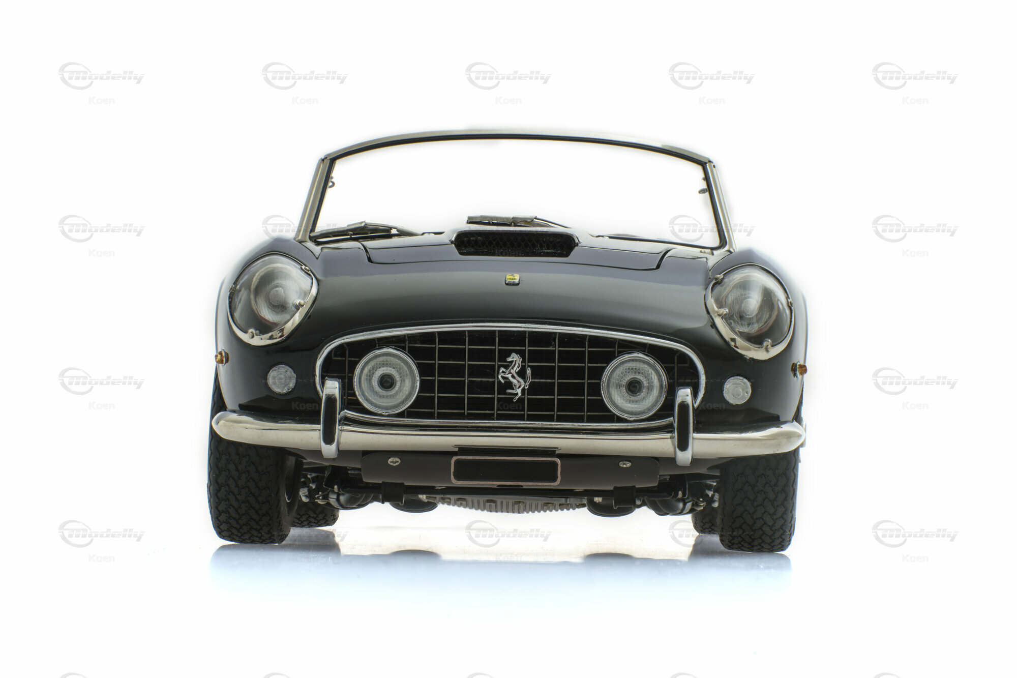 CMC hat sich bei ihrem Modell für die Straßenversion des SWB-California Spyders entschieden mit abgedeckten Scheinwerfern und zusätzlichen Stoßstangen-Hörnern. Als Besonderheit erhalten die limitierten Modell- Versionen in der Außenlackierung blau, silber und schwarz das früher von Ferrari sehr selten angebotene Werks-Hardtop als loses Bauteil mitgeliefert.