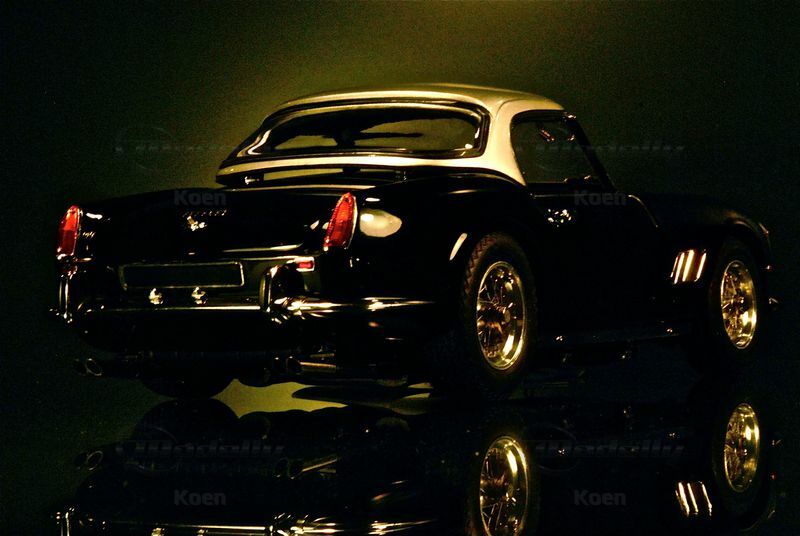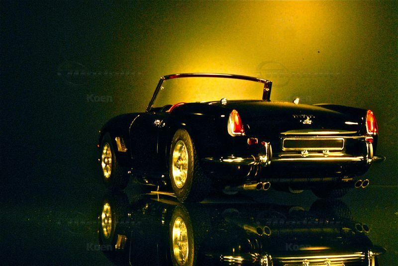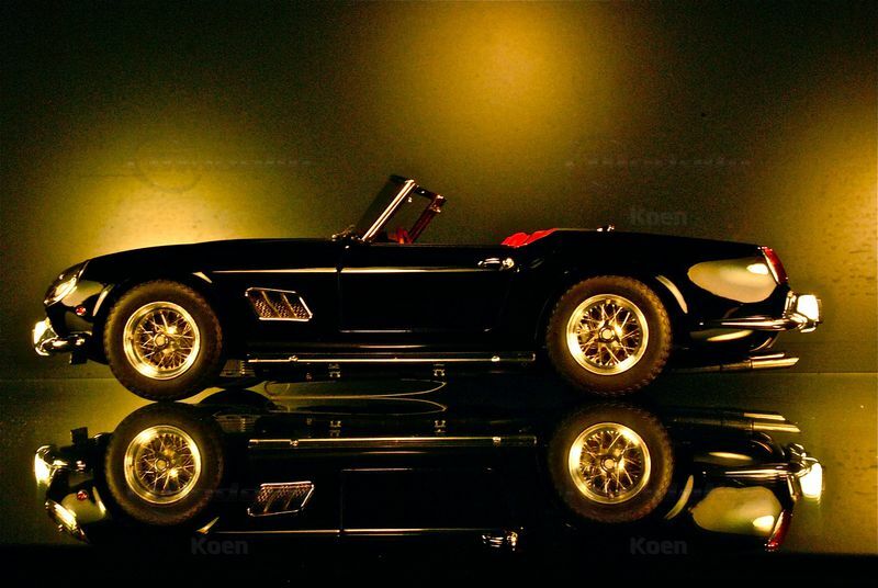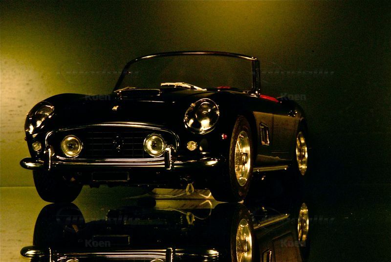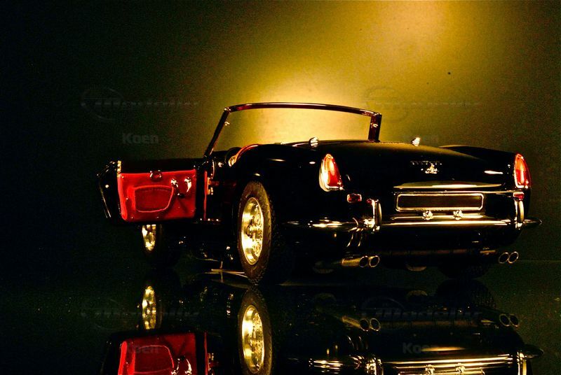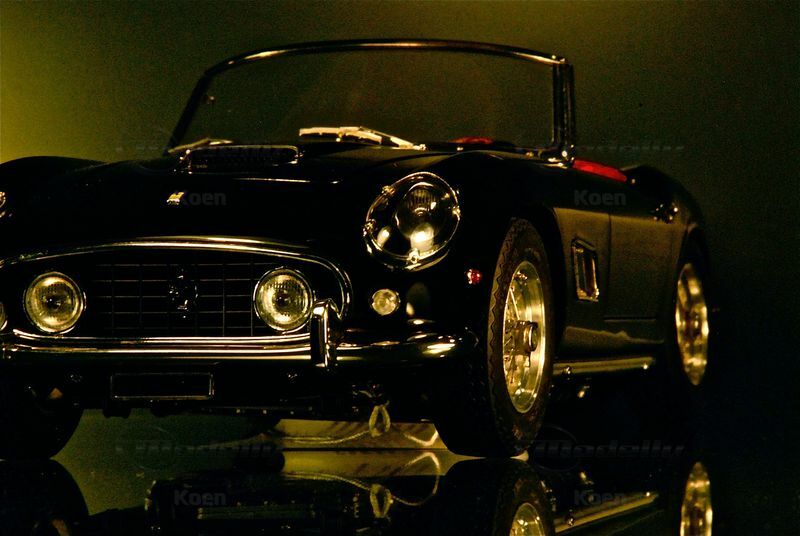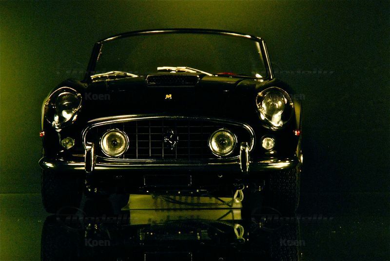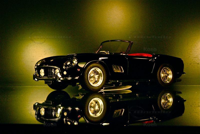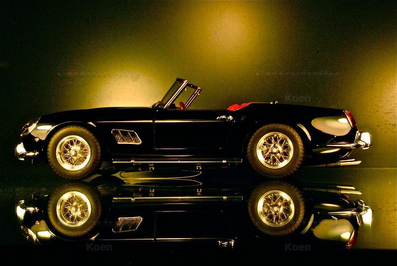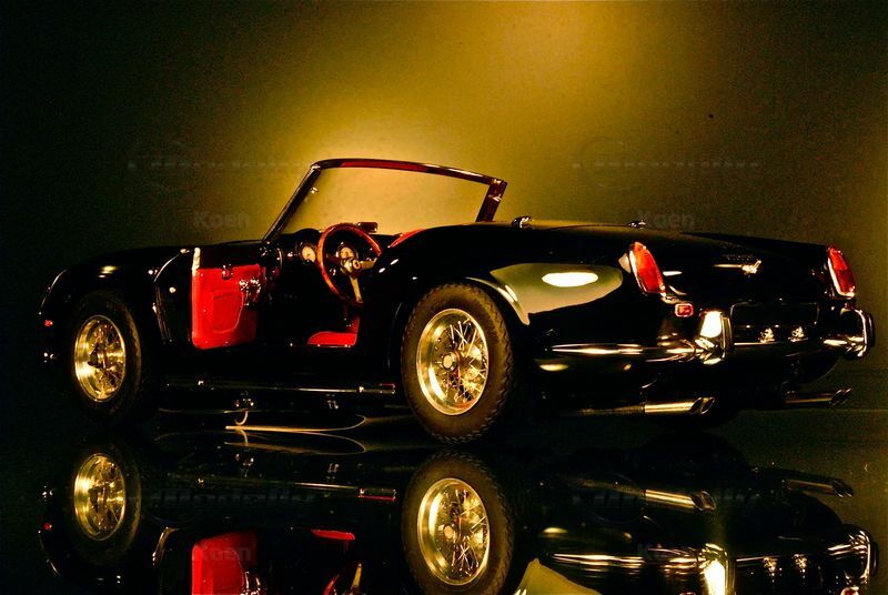 CMC hat sich bei ihrem Modell für die Straßenversion des SWB-California Spyders entschieden mit abgedeckten Scheinwerfern und zusätzlichen Stoßstangen-Hörnern. Als Besonderheit erhalten die limitierten Modell- Versionen in der Außenlackierung blau, silber und schwarz das früher von Ferrari sehr selten angebotene Werks-Hardtop als loses Bauteil mitgeliefert.