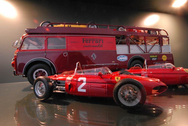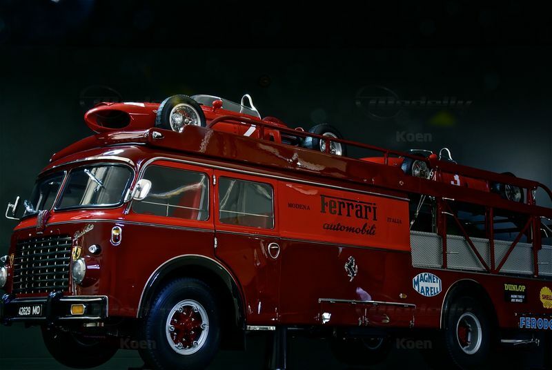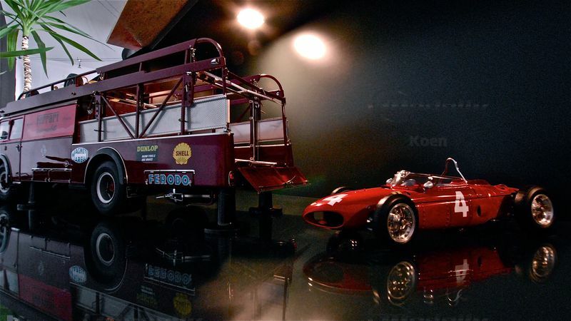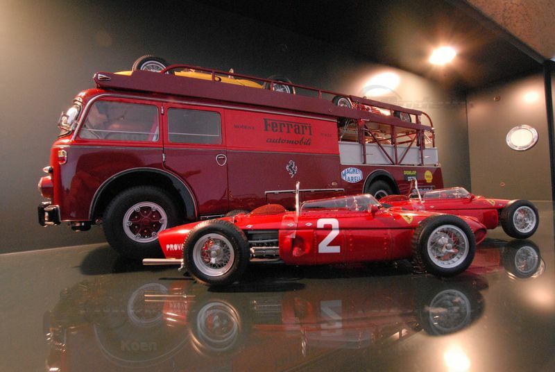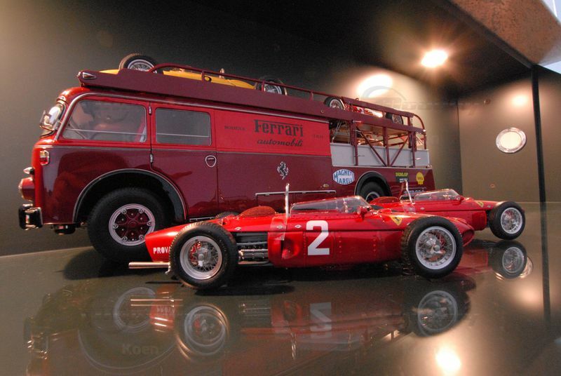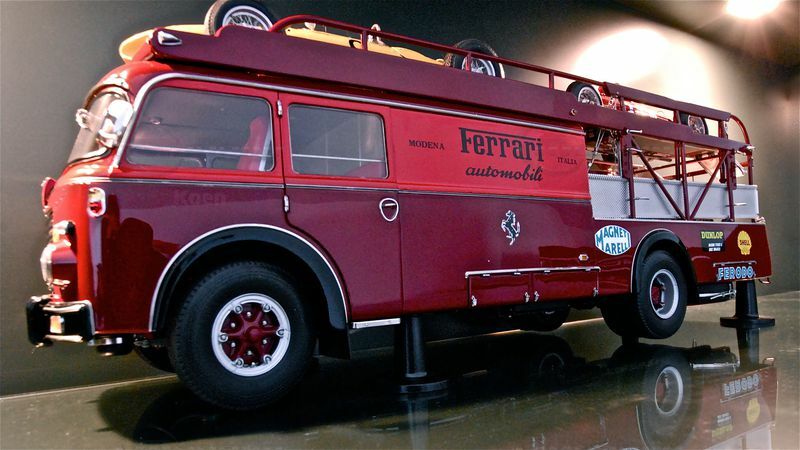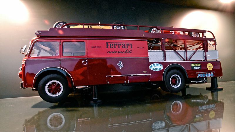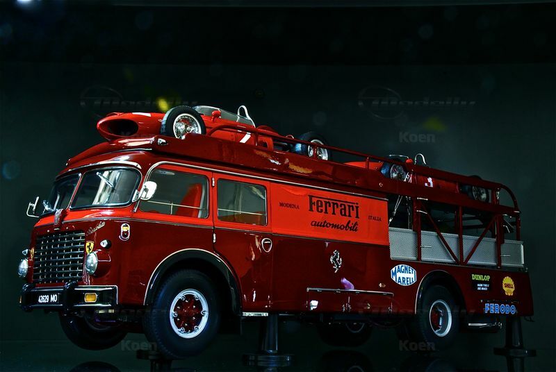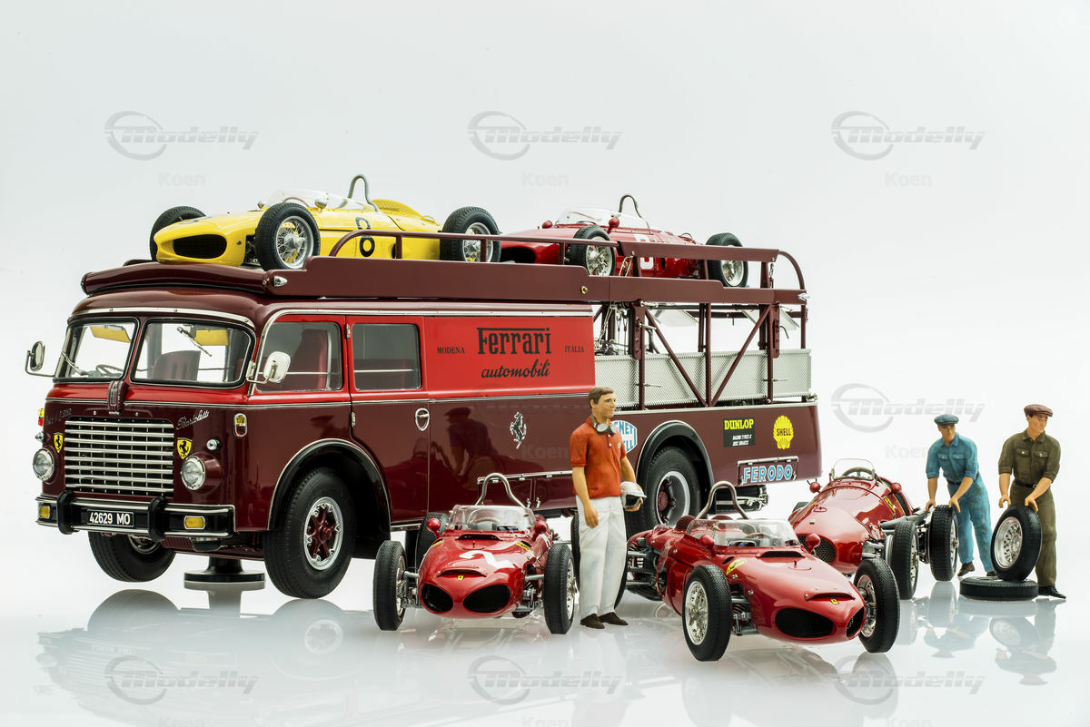 Der Ferrari Renntransporter der Scuderia Ferrari von 1957 ist ein absoluter Blickfang - insbesondere, wenn er mit drei CMC-Ferrari-Modellen beladen ist.