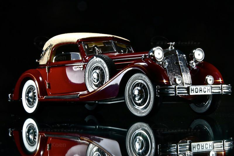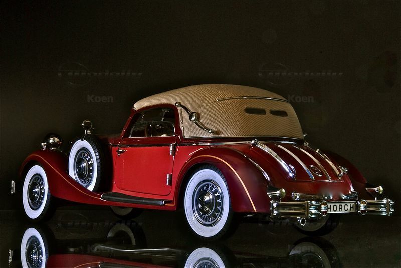 Den legendären Typ 853, damals ein exquisites Luxusfahrzeug hat CMC als geschlossenes oder offenes Cabriolet in rot und weinrot mit goldfarbener Zierlinie und handbemalten Weißwandreifen im Maßstab 1:24 nachgebaut - originalgetreu bis ins kleinste Detail.