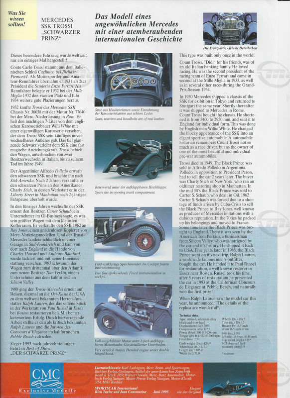 1932 kaufte Trossi das Mercedes SSK Chassis Nr. 36038 mit der motor Nr. 77640 bei der Mercedes-Niederlassung in Rom. Der englische Karosseriebauer Willy White versah den mächtigen 7-Liter mit einer eigenwilligen Karosserie, die dem Trossi-Mercedes sein unverwechselbares Äußeres verlieh. Während der Mercedes-Serienwagen in den 30ern weiß lackiert war, ließ Conte Trossi seinen SSK in sattem Schwarz erstrahlen. Bis zu seinem Tod im Jahr 1949 blieb der schwarze Prinz im Besitz des Conto Trossi. Heute nennt der bekannte Herrenausstatter Ralph Lauren in New York den Mercedes sein eigen.