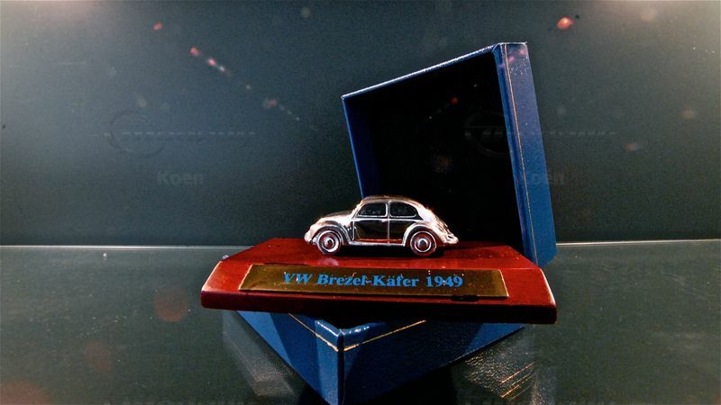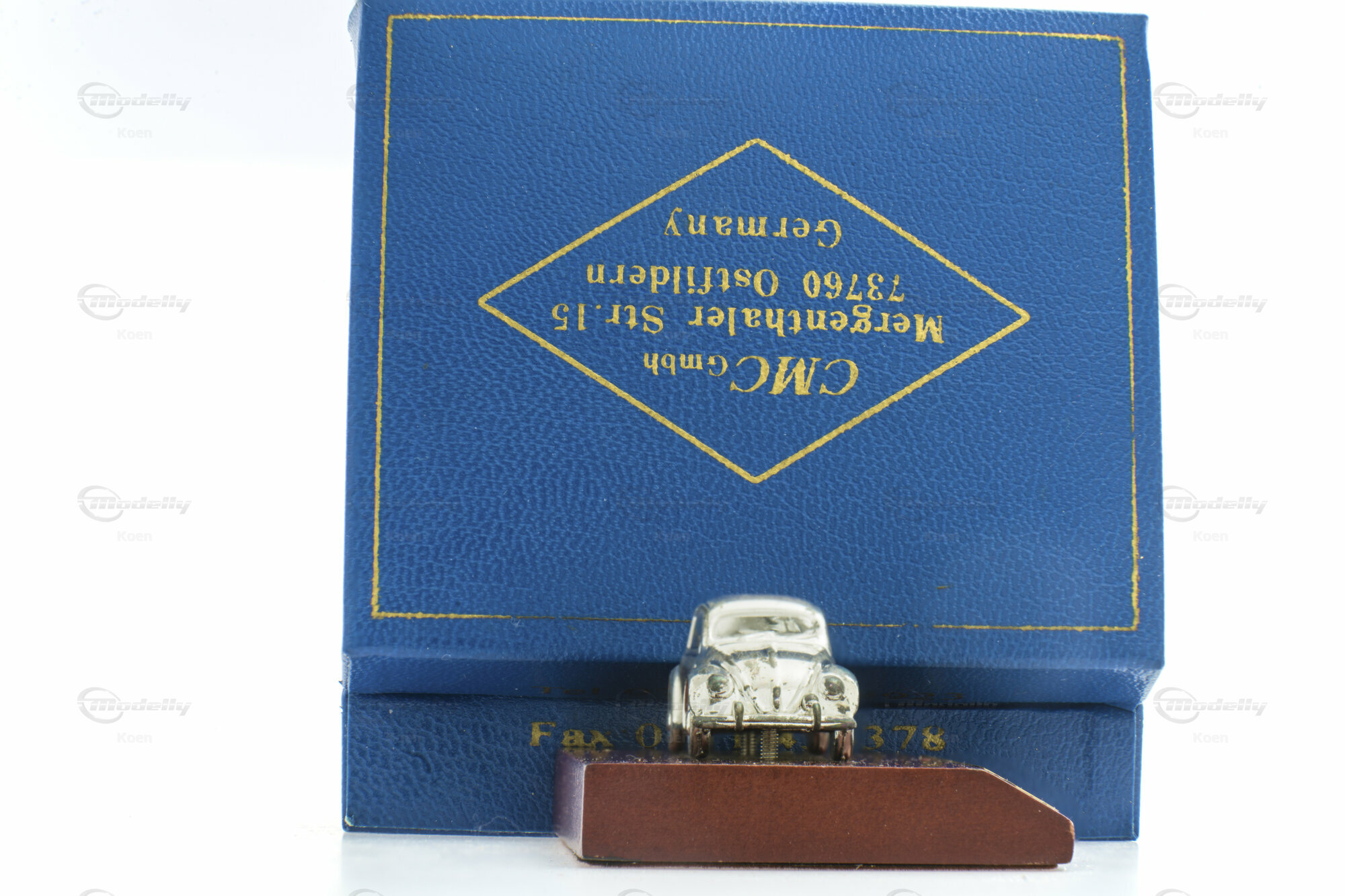 "VW Käfer, "Brezelkäfer" die-cast Modell M 1:87 in Vorbereitung. Versilbert, montiert auf Edelholzplatte. Liefertermin ab August 1996."