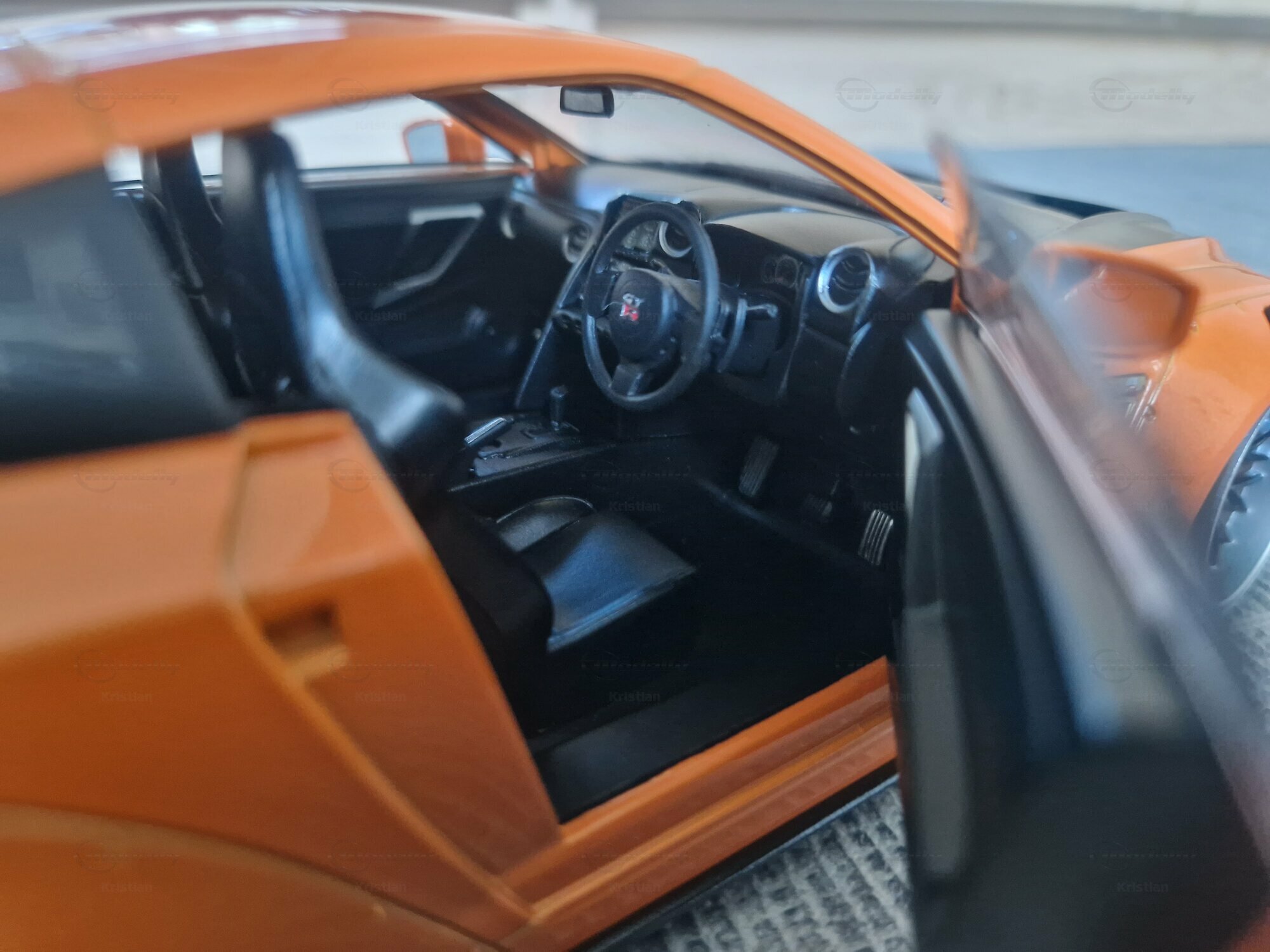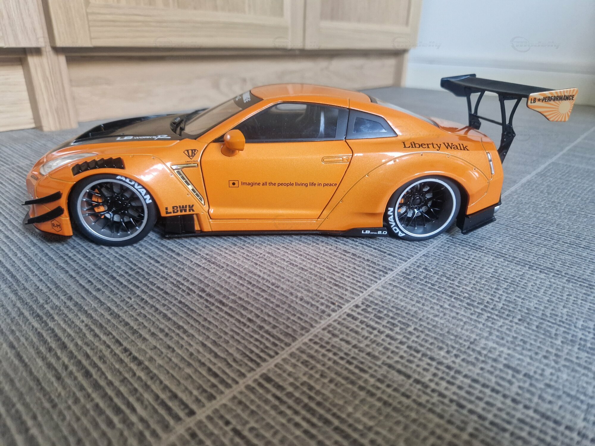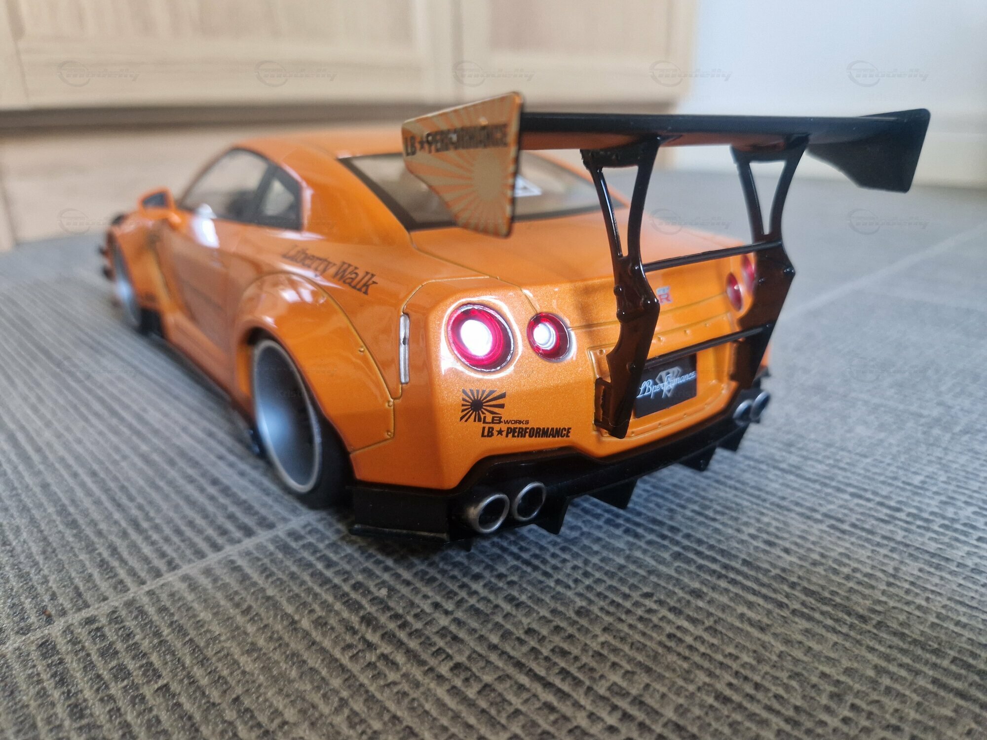The full-sized Nissan Liberty Walk GTR R35 is powered by a mobile petrol engine, but in the 1/18 scale replica by Solido, there is, of course, no functioning engine. Nevertheless, the attention to detail is fascinating: The paintwork of this model features striking dual-tone with a dominant orange body and black accents. Particularly striking are the decals and logos such as "LB Performance" and "Advan," adding to the model's realism. The body elements and paint job are faithfully recreated, adding to the allure for collectors.