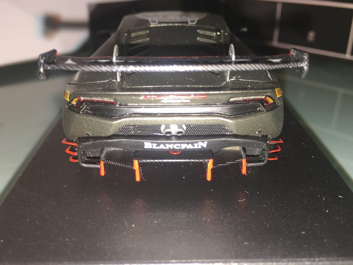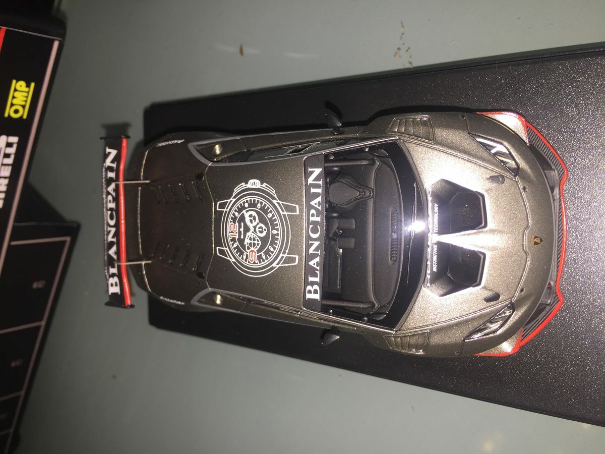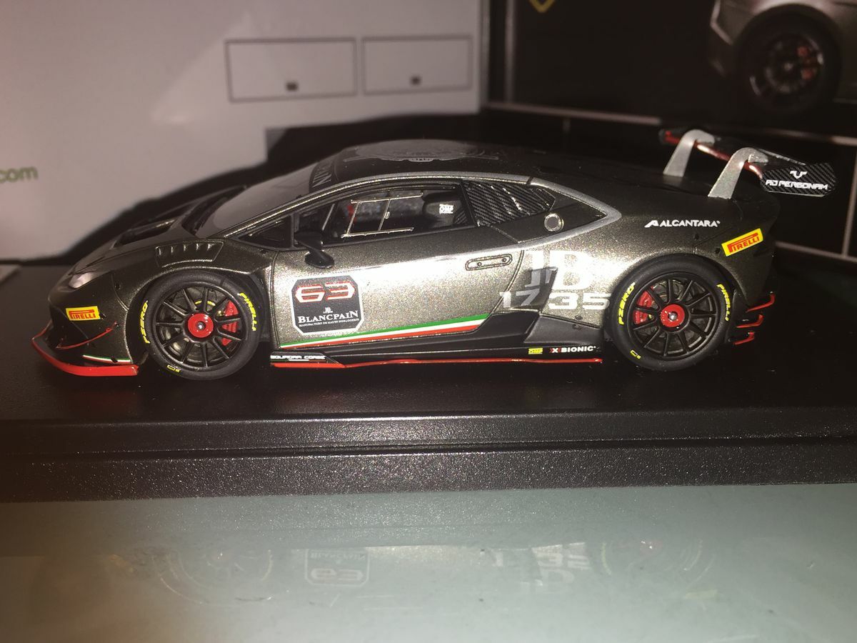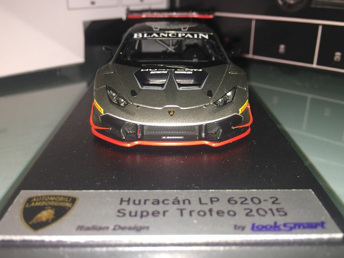 This is a model car in 1/43 scale, made by Looksmart. The piece is in the collection of the Modelly member “Lambonando”. The release shows the 2015 spec with the typical Super Trofeo sponsor decals. The miniature is diecast metal. You can see the pronounced front intakes reproduced as fine mesh inserts. The hood has the two characteristic vents, and the flat headlights with the Y‑motif are nicely captured. The windshield has a big “BLANCPAIN” decal like in the real series. On the side there’s race number 63, the series logo and a thin stripe in the Italian flag colors. The big rear wing has a carbon-look print, and its supports are rendered in a metal finish. At the rear the diffuser with multiple vertical fins stands out, and the front and rear feature red aero accents that are clearly picked out on the model. The tire sidewalls even have yellow Pirelli markings. The wheels use a red center nut, matching the racing look. The model sits on a base with a nameplate “Huracán LP 620-2 Super Trofeo 2015”, so it’s easy to ID on a shelf. In short: a 1/43 Looksmart model aimed at collectors who want an accurate, space-friendly version of a one-make Huracán.