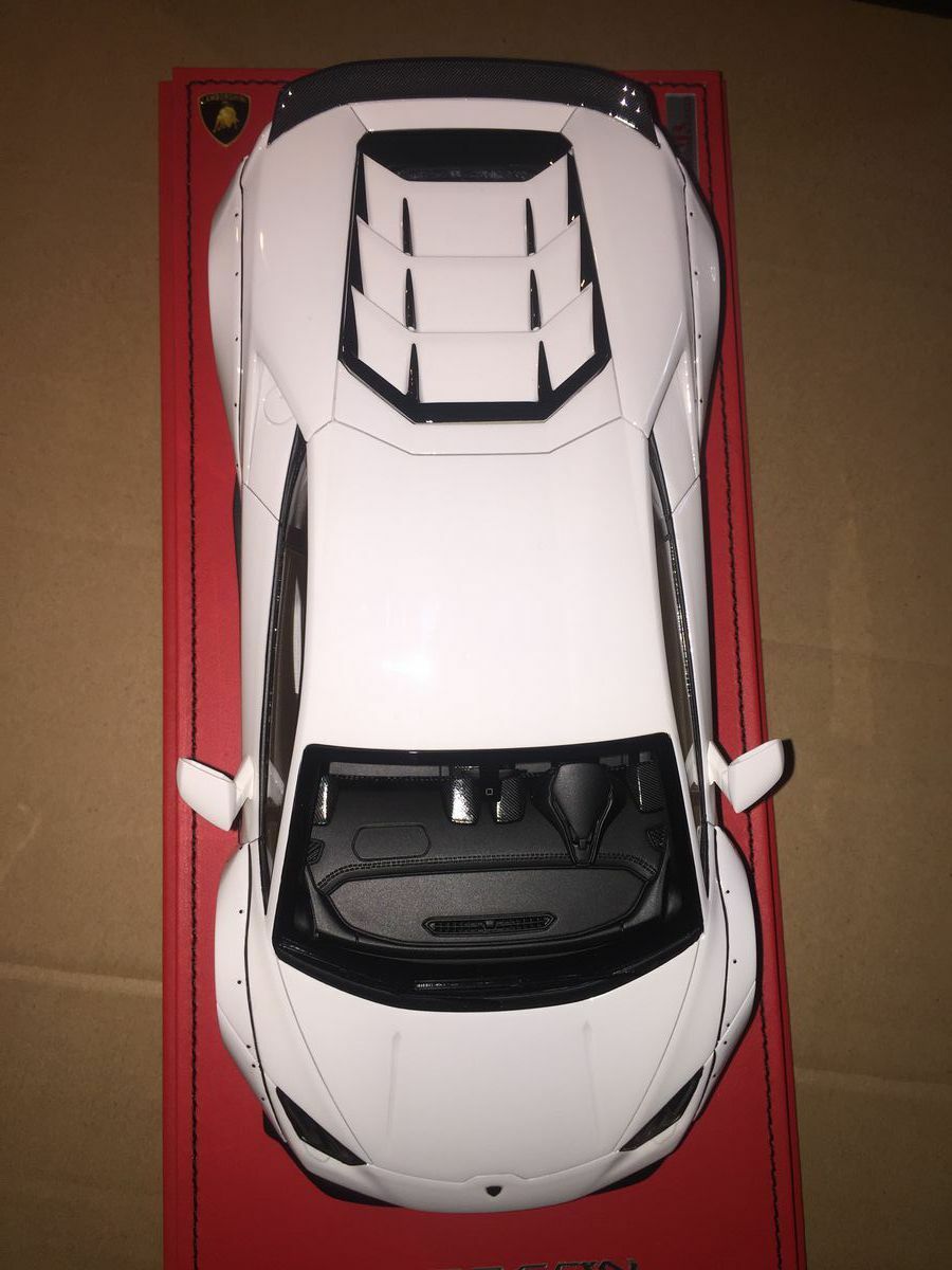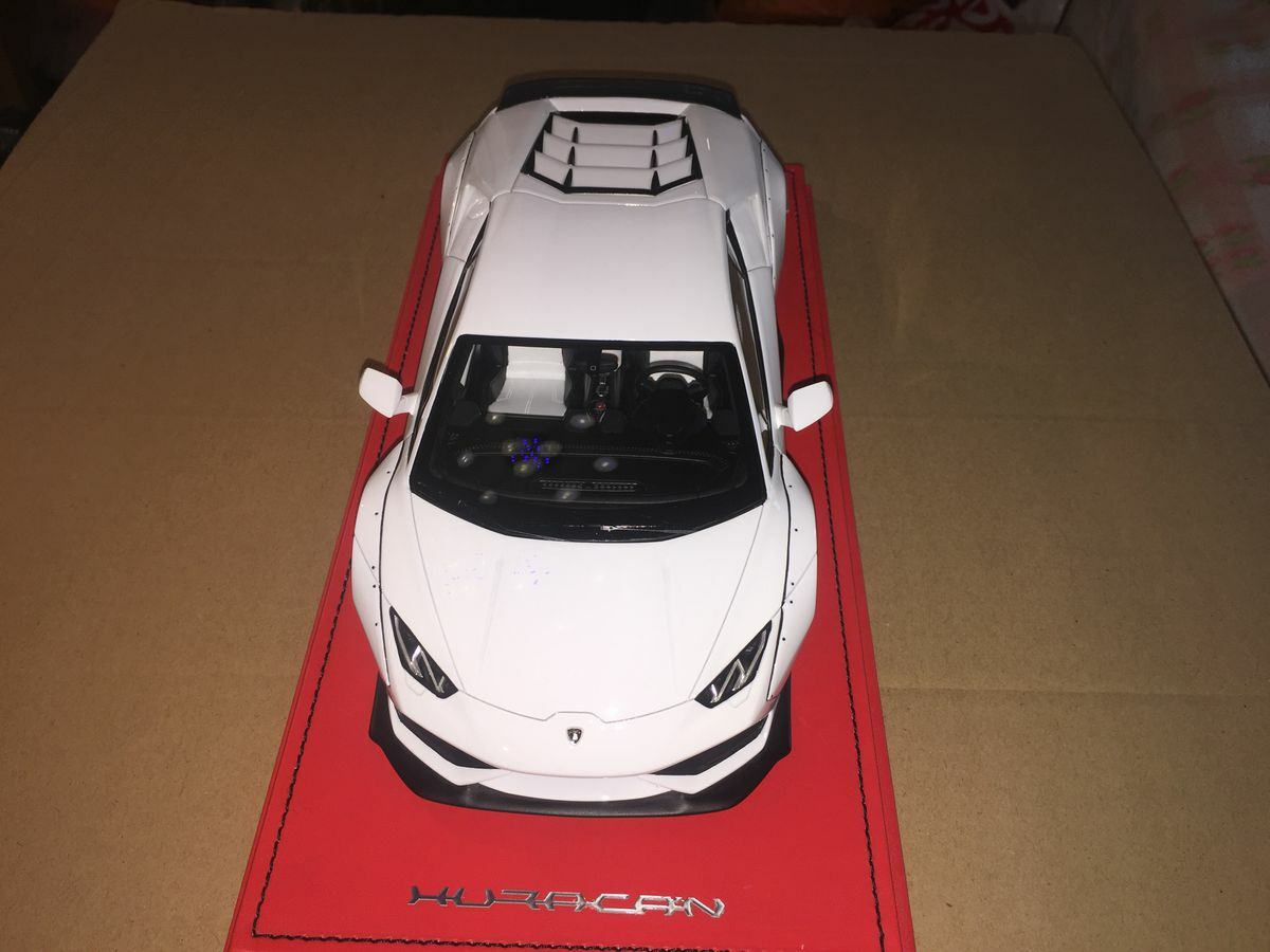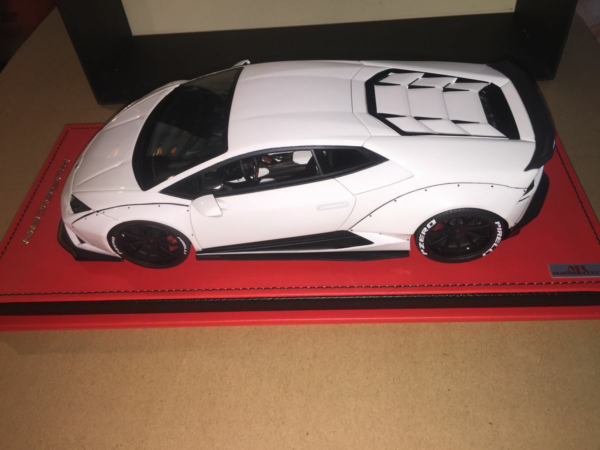 The pictured miniature is a scale model at 1/18 and was produced by MR Models. It’s made from resin, which is common for high‑detail small runs — resin gives sharp edges and thin body parts, but doors and hoods usually don’t open, and that’s likely the case here. The paint is a neutral white — think Lamborghini “Bianco” — with contrasting black bits: front splitter, side skirts, diffuser and trim in matte or semi‑gloss. You can clearly see the wide, rivet‑style fender extensions — a hallmark of the LB‑Works kit. The front reproduces the sharp headlights with the Y signature, and hood and bumper seams are nicely engraved. From above you can make out the typical slatted engine‑cover for the mid‑mounted motor. At the rear, the slim taillights, the pronounced diffuser and the exhaust outlets are well done. The tire sidewalls show the white Pirelli “P Zero” lettering; the wheels are black, and no specific wheel brand is visible on the model. Inside there’s a sporty, stripped cockpit with bucket seats and a roll‑bar feel, which suits a track‑style conversion. Finish quality shows clean gaps, crisp aero part edges and even paint. The model sits on a red base with black edging and visible stitching, and the “Huracán” script plus a small Lamborghini badge are applied — both are sharp in the photos and make it easy to ID the model as a Lamborghini Huracán.