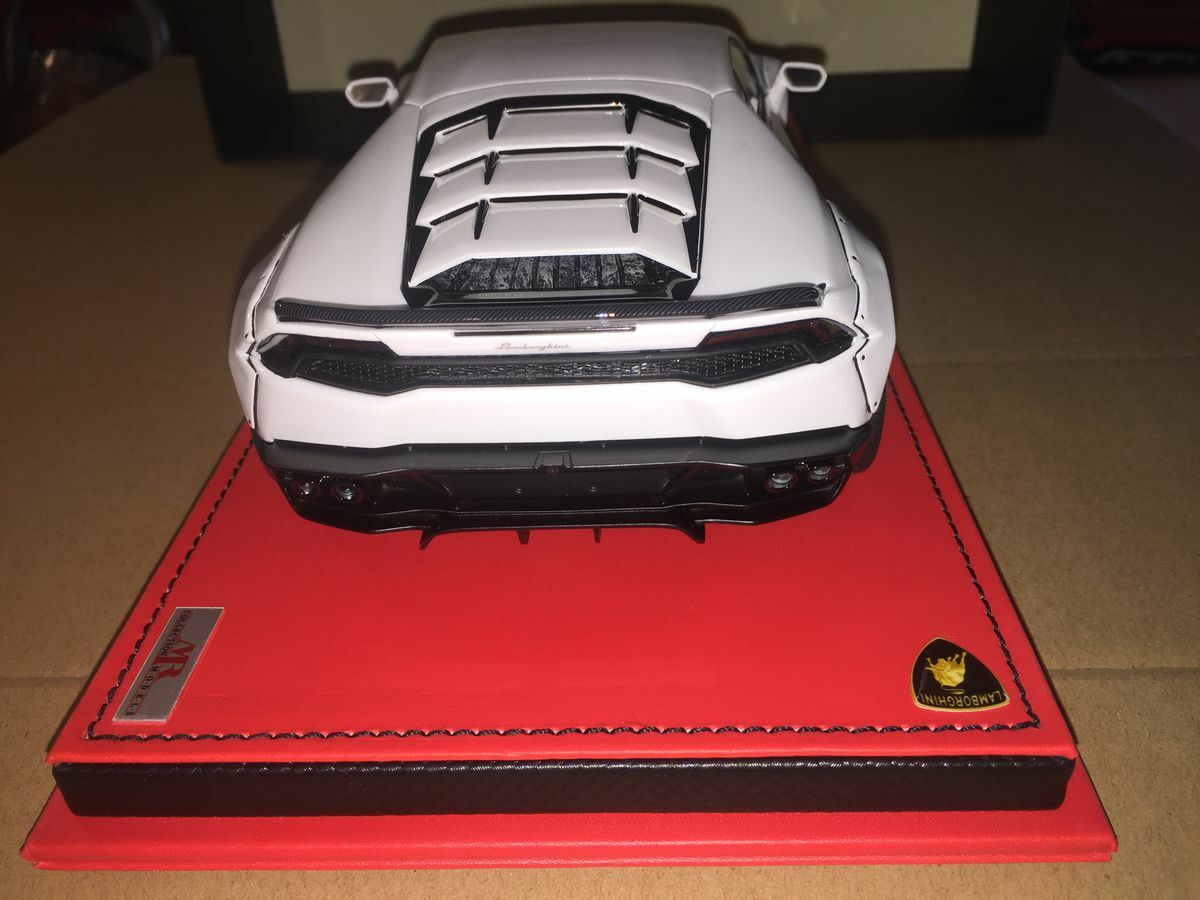 For the model‑car crowd it’s important that this is a 1/18 resin piece from MR Models. The maker is known for small resin runs focusing on Italian supercars. This release does a good job of capturing the LB Performance look — the wide fenders with faux rivets, bold aero parts and lowered stance come through nicely. The white body with black aero pieces gives strong contrast, which helps the Huracán’s lines and the widebody add‑ons pop. The display plinth with its red surface and stitched edge makes a nice presentation for a shelf or cabinet; the logos are crisply executed. If you collect by model generations, slot this into the first generation Huracán category (started in 2014). The resin choice shows that you don’t need opening parts to get excellent detail — the slatted engine cover, diffuser and other bits read clearly. For documentation or display, this is a fun complement to stock Huracáns, STOs or EVO versions, showing how an aftermarket LB‑Works conversion changes the car’s vibe while leaving the mechanical basics intact.