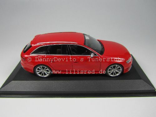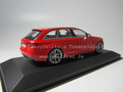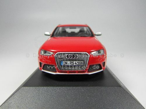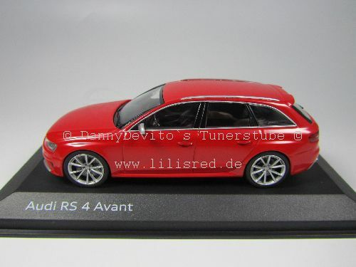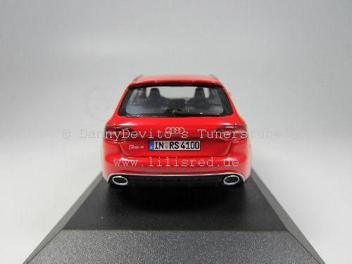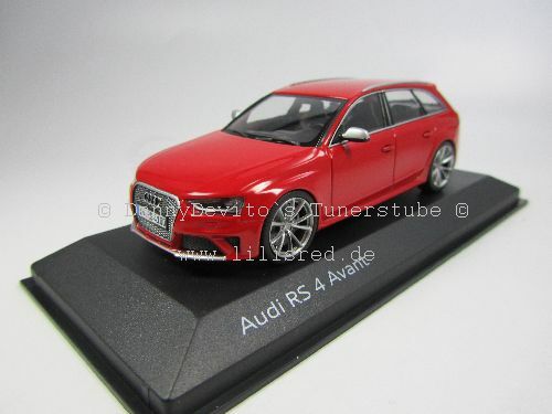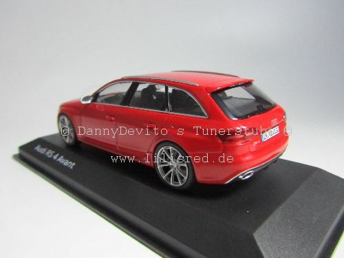 The model car shown here in the precise 1/43 scale was crafted by Audi Collection and faithfully replicates the Audi RS4 Avant Facelift. This miniature from the collection of Modelly member "Lilisred" is an exact replica of the original. Noticeable are the accurate portrayal of the grille and the precise front headlights, which also showcase the daytime running lights beautifully. The model is mounted on a black display base, ideal for collector shelves or display cabinets.