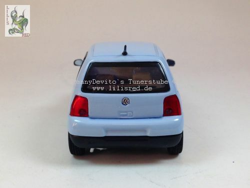 The exterior paint of the miniature appears in a subtle light blue color, closely resembling the original Volkswagen Lupo, though possibly a customization. The wheels of the miniature car bear specific brand emblems and details that enhance the authentic look. Small parts such as mirrors, door handles, and the emblem on the front are finely crafted, completing the appearance of the miniature perfectly. This makes the model car not only appealing to collectors but also to car enthusiasts and fans of city cars.
