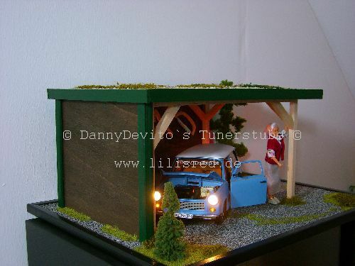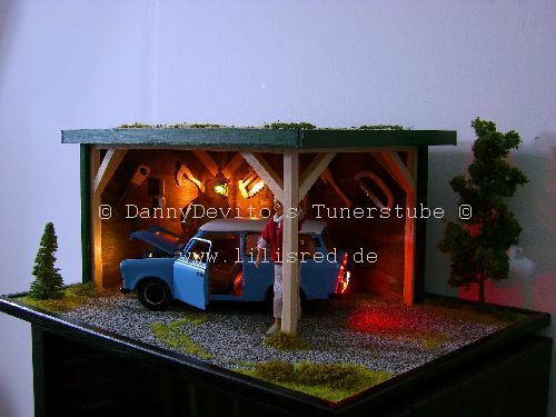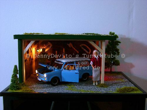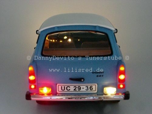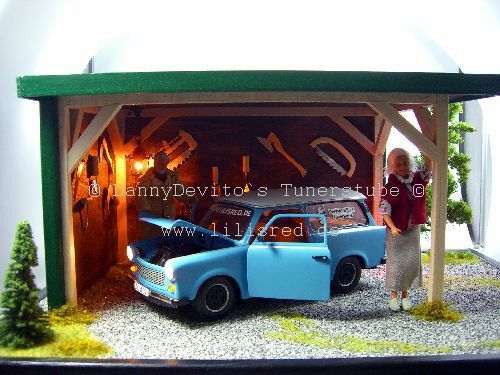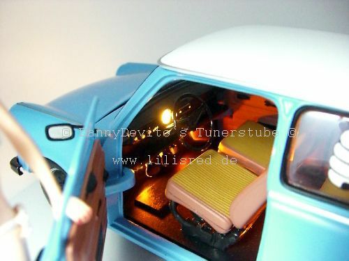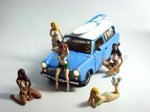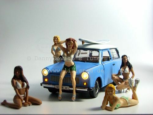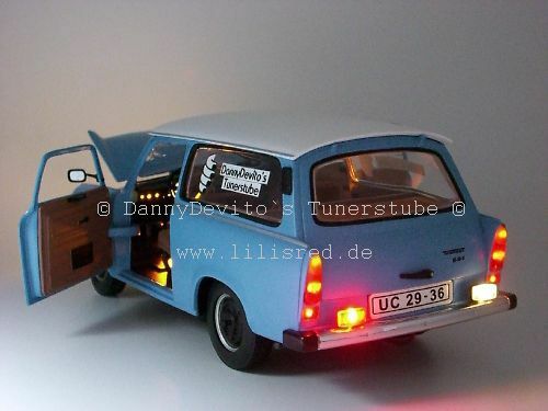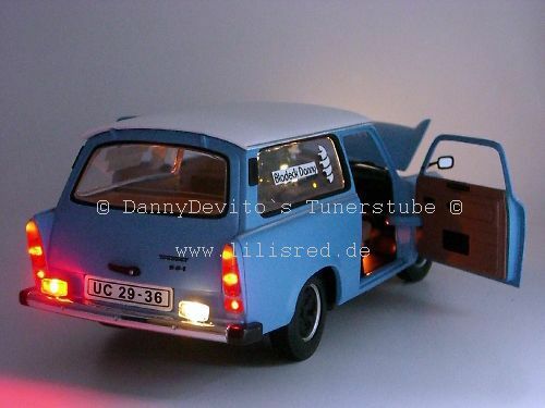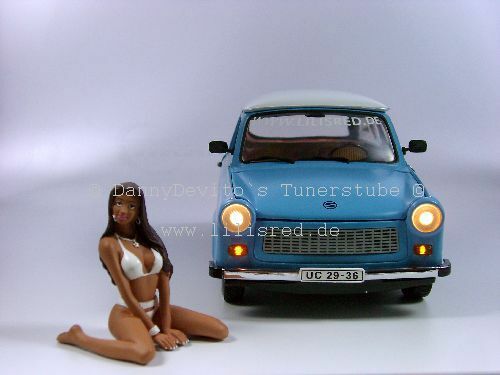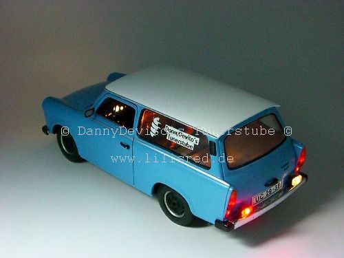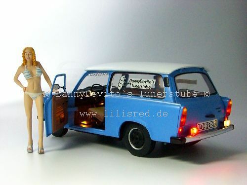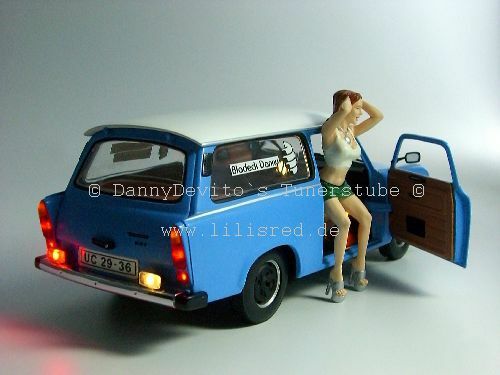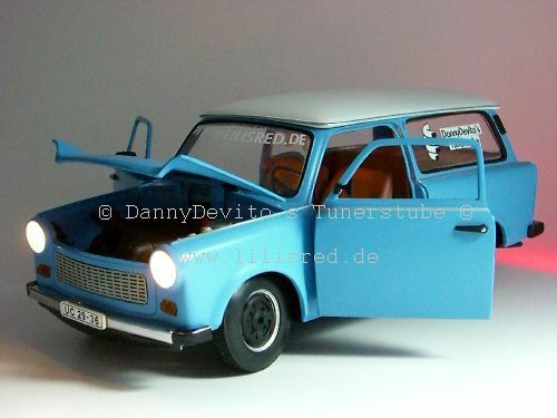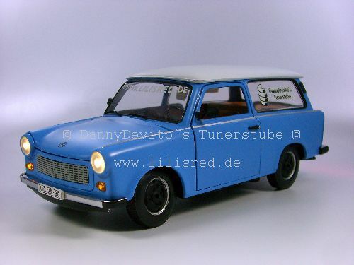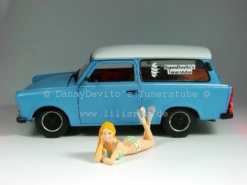 The miniature Trabant showcased here, in a 1/18 scale by Sunstar, offers a detailed replica of the original Trabant 601. However, this model car has been modified and does not represent the original product by Sunstar. Sunstar model cars are renowned for their accuracy and attention to detail, cherished by collectors worldwide. This particular model displays the Trabant in a striking blue paint finish with a surfboard on the roof, indicating a personalized modification. Additionally, the accompanying figures create a summery, relaxed vibe around the model. The inscription "LILISRED.DE" on the front windshield suggests this model is part of the collection of Modelly member "Lilisred."