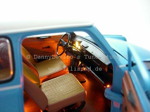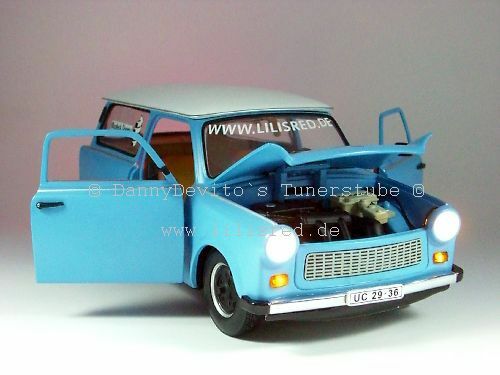 The miniature of the Trabant 601 depicted here is enhanced with special details, making it unique. The standout blue paint finish contrasts with the standard colors of the original. The figures surrounding the car, along with the inscription, enhance the individual character of this model. Such customizations are popular among model car enthusiasts as they add a personal touch to the model. The wheels and additional components could be from specialized tuning companies, adding extra charm to the model. These details make a difference for collectors, increasing the value and uniqueness of the model car. While originals of the Trabant 601 are valued in collections for their historical significance, this modified model offers a fresh and creative interpretation, clearly standing out from mass production.