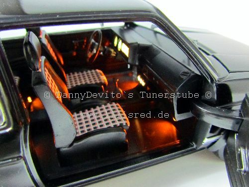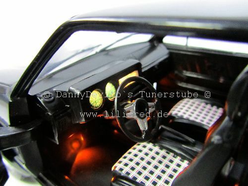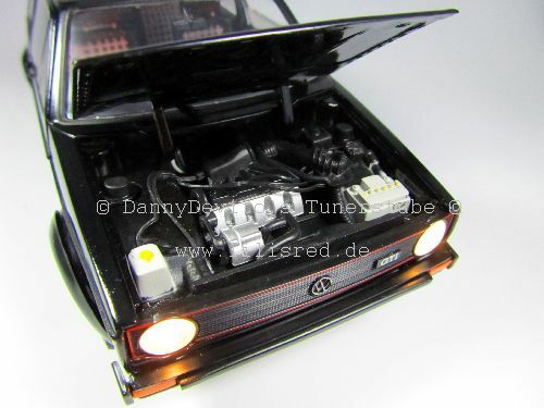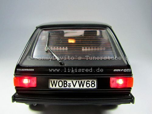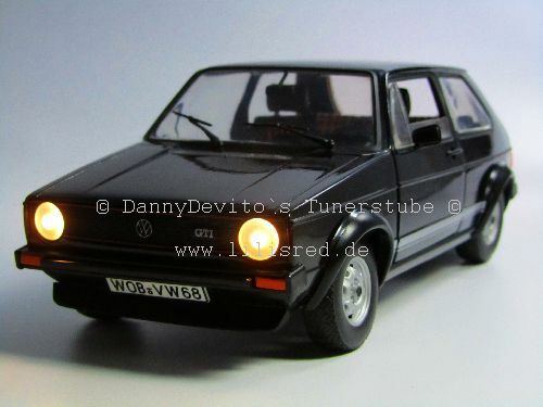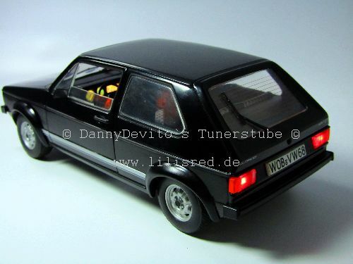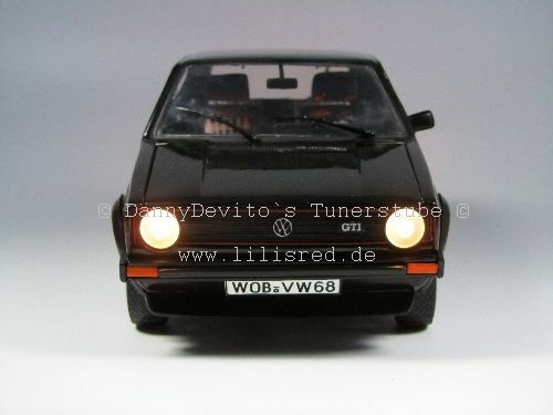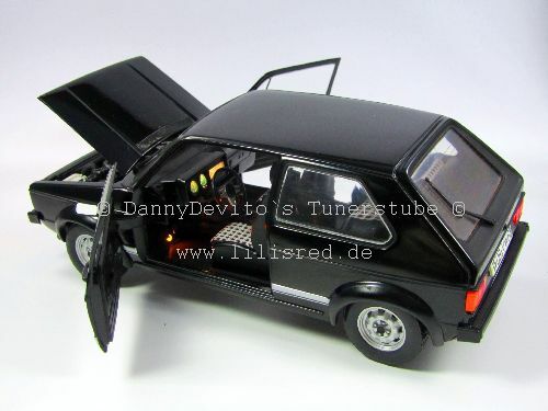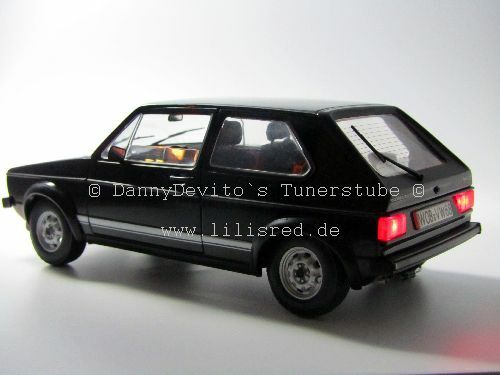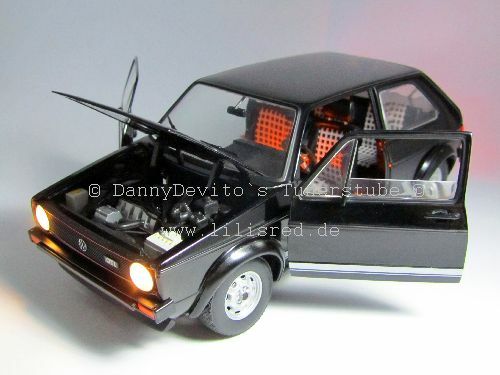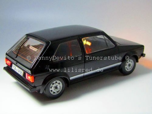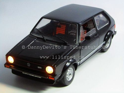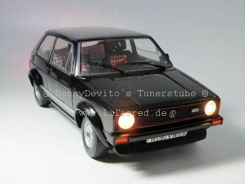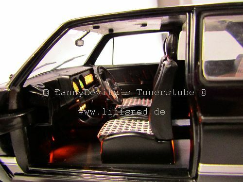 This 1/18 scale model car was manufactured by Sunstar and is part of the collection of Modelly member "Lilisred". Please note that this model has been modified post-production and does not fully represent the original product from Sunstar. The model comes in a black color scheme and showcases all the distinctive features of the original Volkswagen Golf 1 GTI, from the round headlights to the classic grille with the GTI emblem. The miniature is intricately designed and is an interesting collectible for model car enthusiasts. The lighting integrated into the front headlights adds an authentic look to the model.