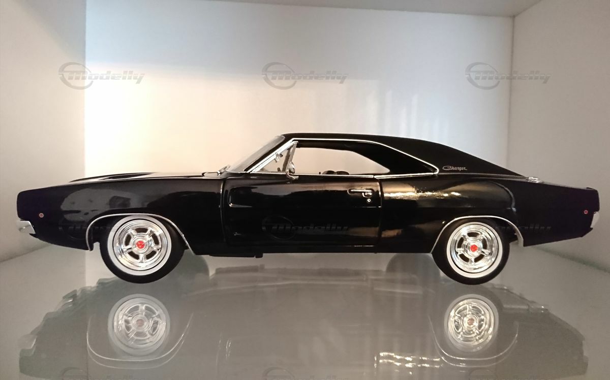 Detailed Replica: The 1/18 Scale Miniature by GreenLight CollectiblesThis precise model car, made in a 1/18 scale, is an impressive replica of the Dodge Charger R/T. GreenLight Collectibles has placed great emphasis on attention to detail. The model is made of die-cast material, making it particularly robust while allowing for high accuracy in detail. Standout features include the glossy polished rims, chrome details faithful to the original, and authentic markings and emblems. The deep black paint exudes elegance and power, with the distinct "R/T" badge on the grille and the "Charger" logo on the rear showcasing the high quality of this miniature. The care taken to replicate the curves and lines of the original is visible from every angle.